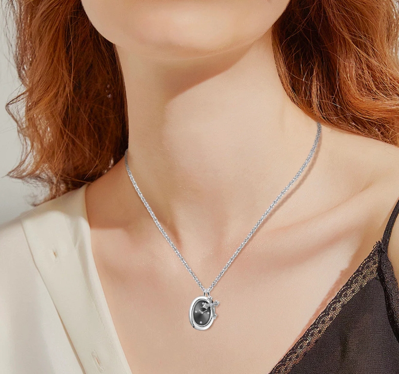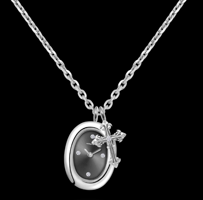 這款令人驚豔的銀色吊墜腕錶,擁有光滑拋光的20×25毫米橢圓形錶殼,搭配深灰黑色錶盤,散發優雅氣質。 3、6、9和12點鐘位置均鑲嵌鑽石,更添奢華風格。腕錶採用極簡主義設計,僅配備時針和分針,簡潔精緻。腕錶搭配一顆13×17毫米的十字架吊墜,與錶殼顏色相得益彰,中央鑲嵌一顆璀璨鑽石。這款腕錶將時尚與象徵意義完美融合,懸掛於銀鍊之上,是任何場合的完美配件。