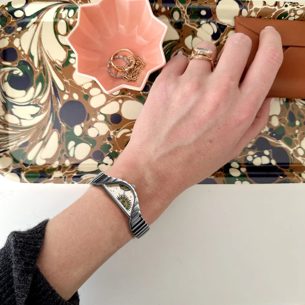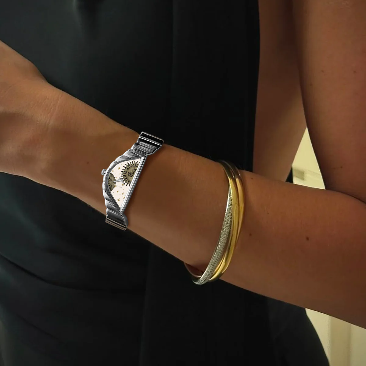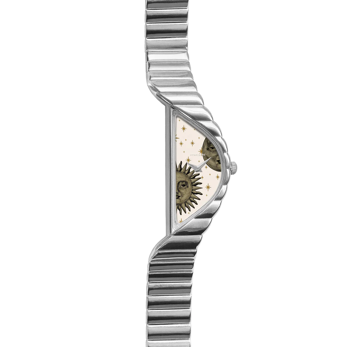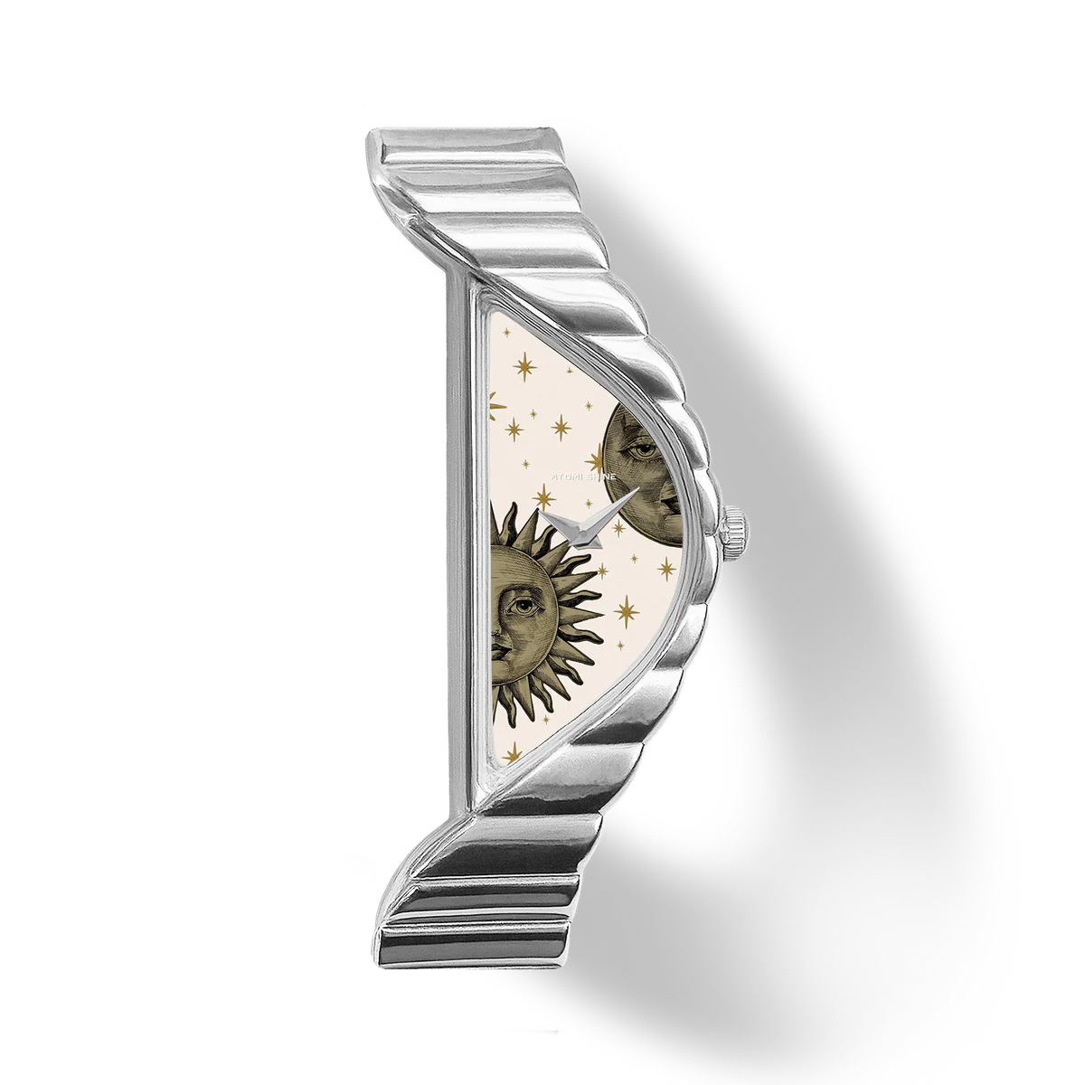 拋光銀質錶殼搭配與之相配的雕刻錶鍊,新月形錶盤捕捉晝夜之間永恆的舞動。精緻的太陽和月亮,各自擁有富有表現力的復古風格錶盤,靜靜地棲息在溫暖的奶油色背景上,點綴著金色的星辰,令人聯想到古老的天象圖。這款腕錶專為夢想家和觀星者設計,它不僅僅是一塊腕錶,更是一件可穿戴的藝術品,透過宇宙中最永恆的符號,頌揚時間的流逝。