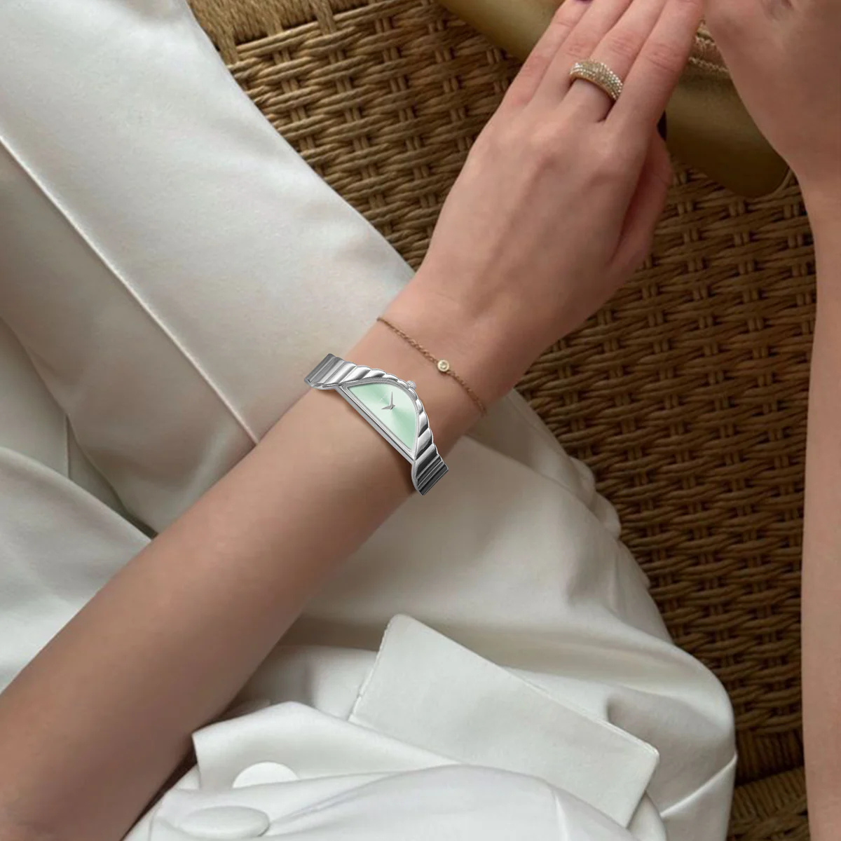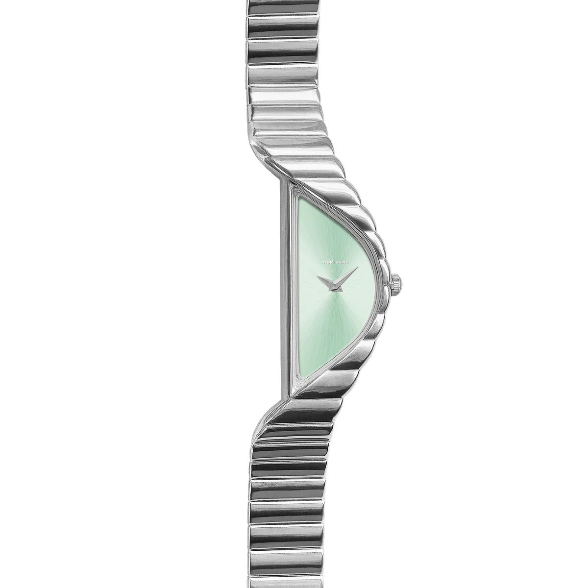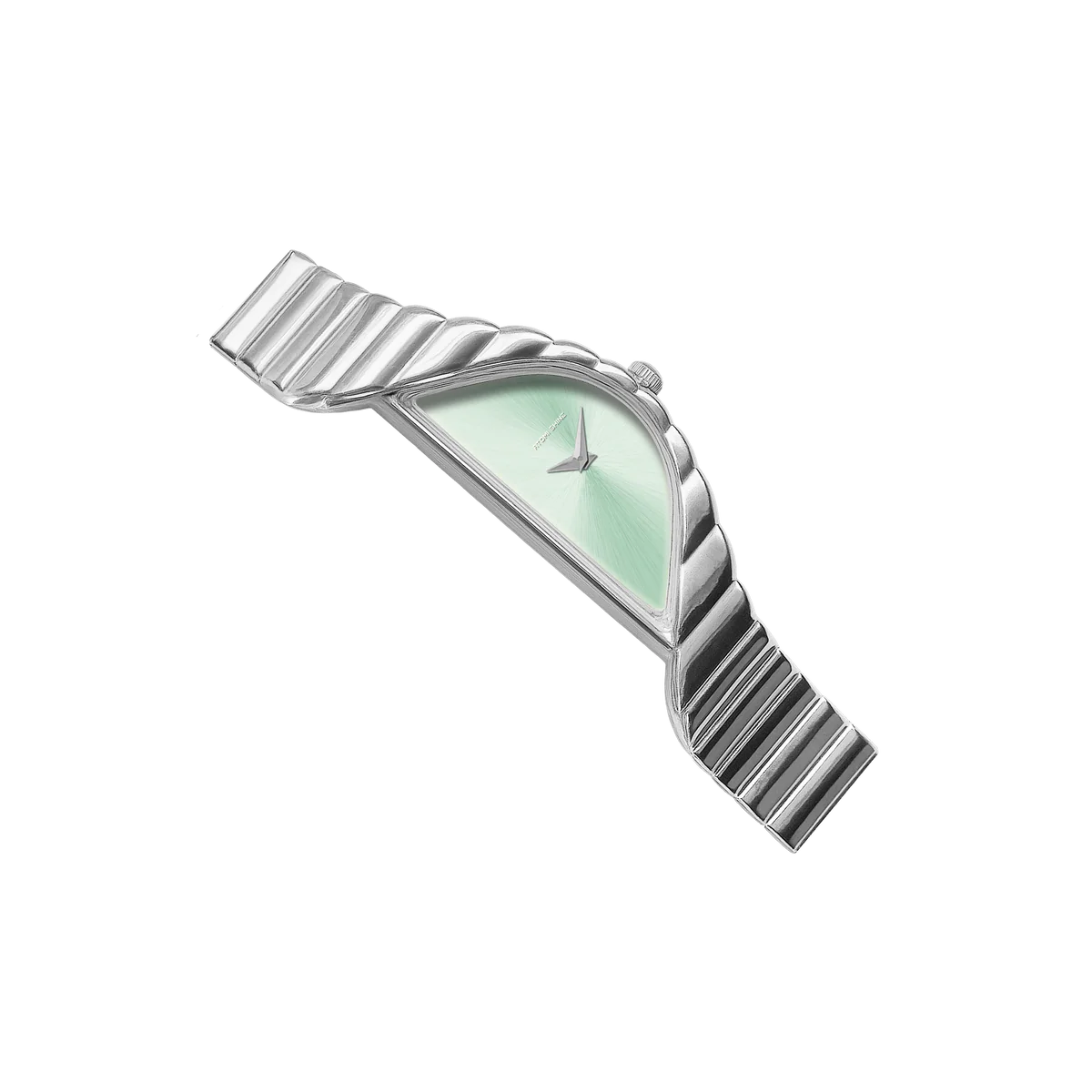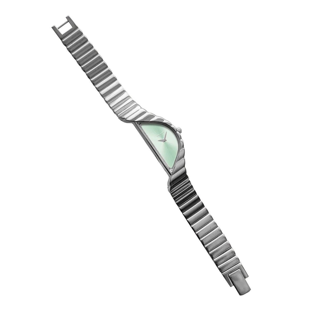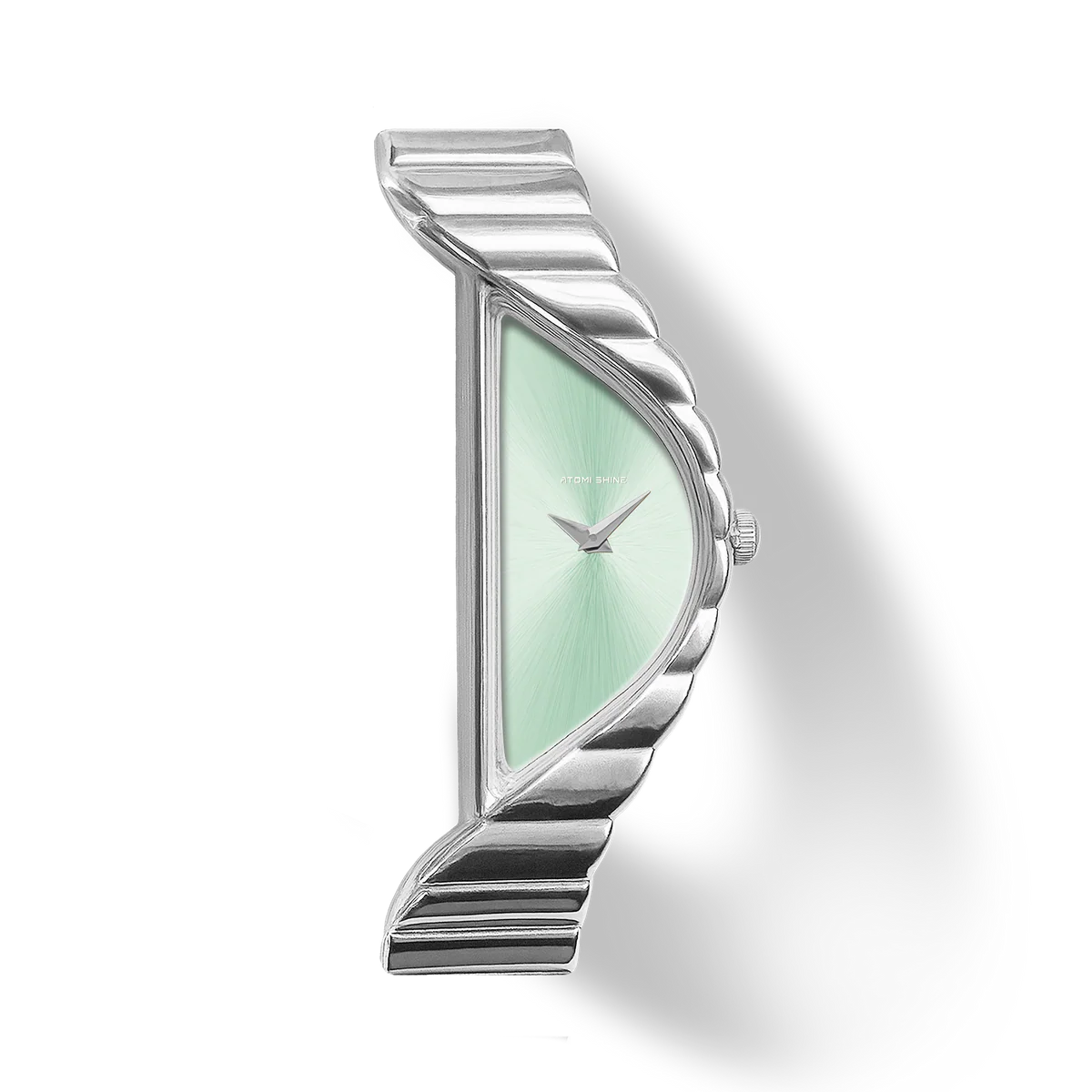 錶盤散發著精緻的淺綠色太陽紋飾,散發出柔和的漸層光澤,隨視線而變。如同陽光透過嫩葉,散發出活力與靜謐的優雅。簡約的雙指針設計確保清晰純淨,讓錶盤的微妙光澤成為焦點。銀色不鏽鋼錶殼和錶帶呈現新月形輪廓,如同月弧般環繞腕間。