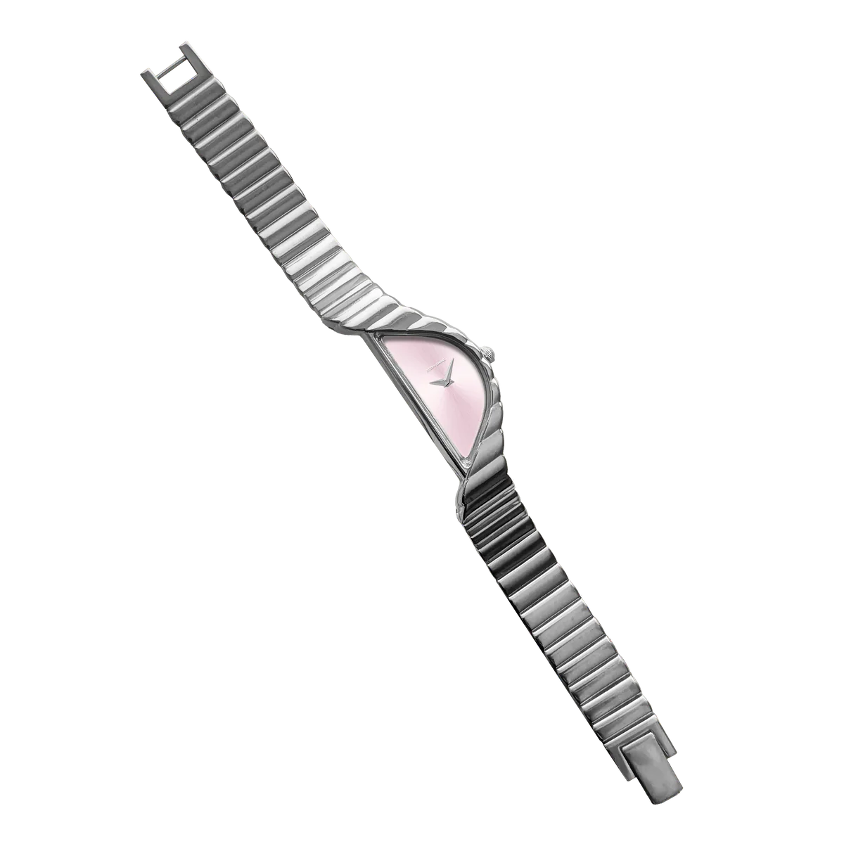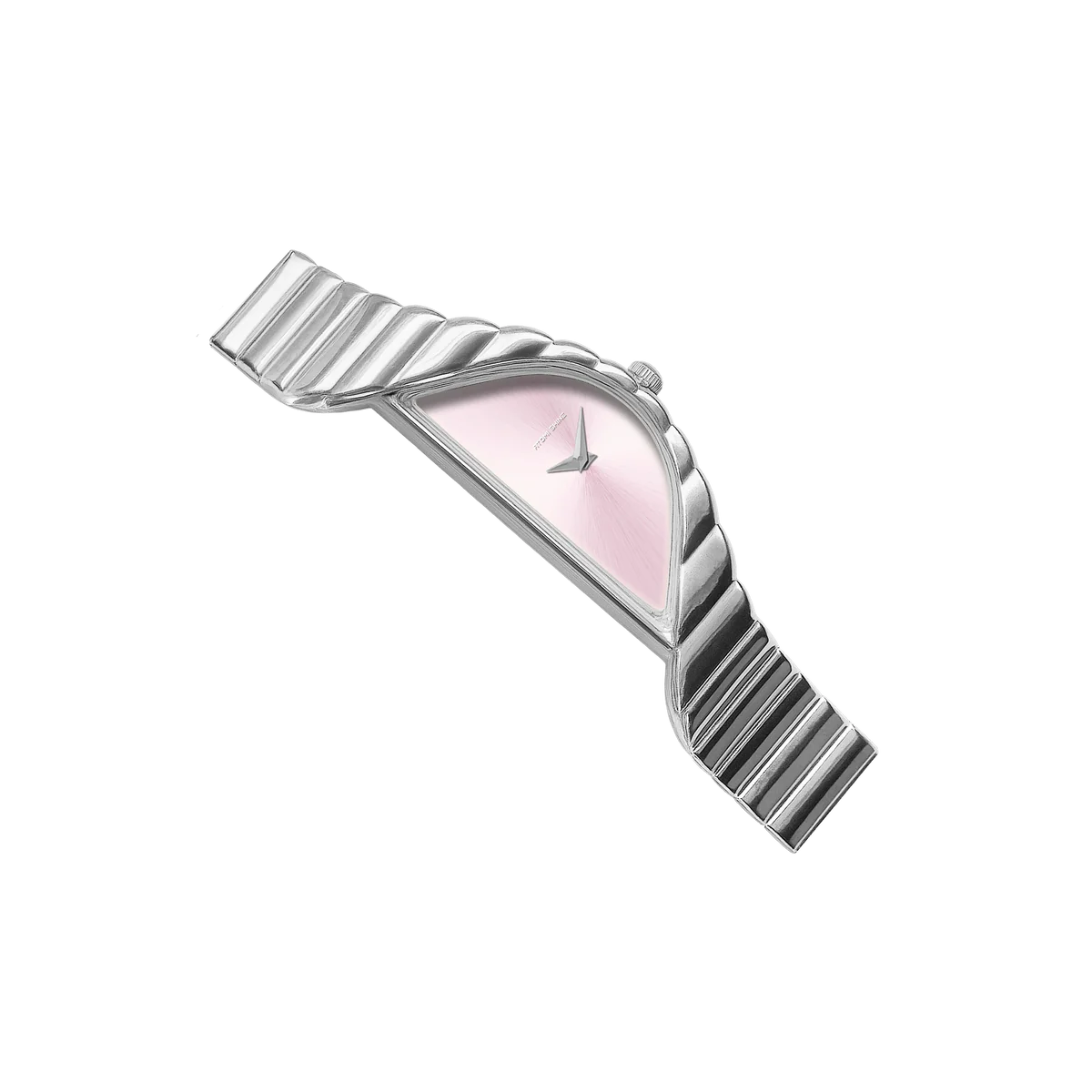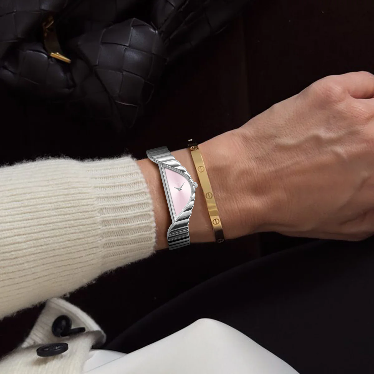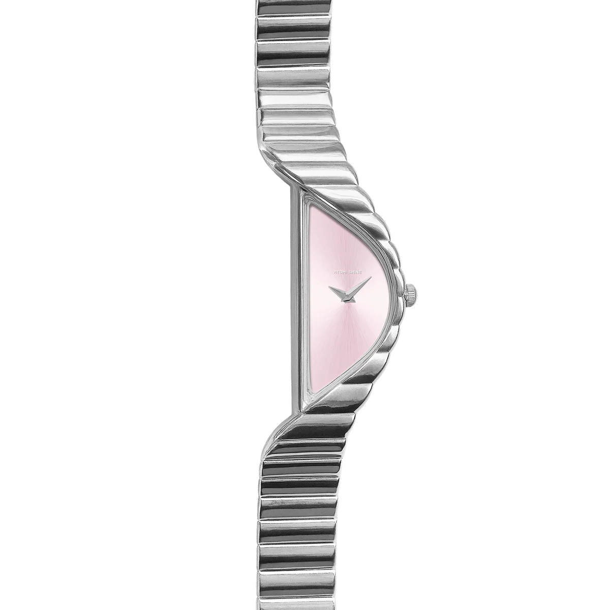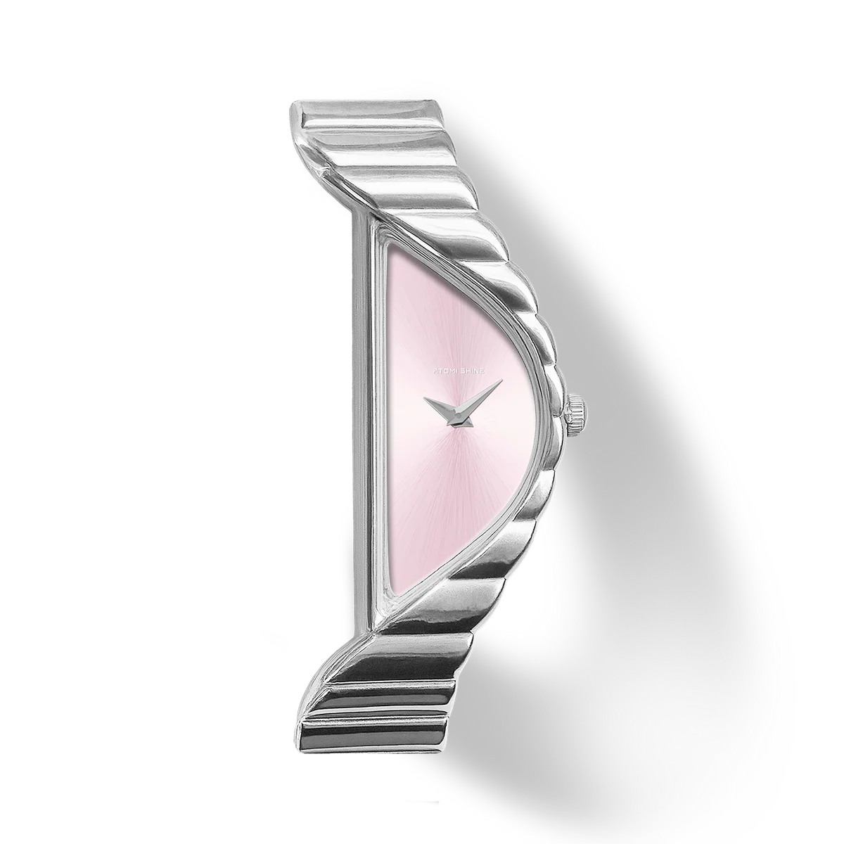 柔和的**太陽紋粉紅錶盤**在腕間流轉,散發溫暖氣息,如同黎明破曉時分的光芒。其簡約的設計,摒棄了數字和時標,充分展現了純粹的造型和精湛的細節工藝。獨特的新月輪廓不僅視覺上引人注目,更兼具舒適感,以雕塑般的平衡感自然地環繞腕間。