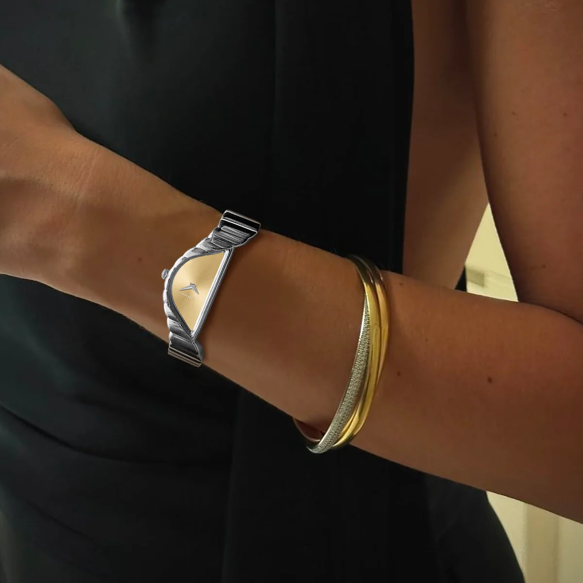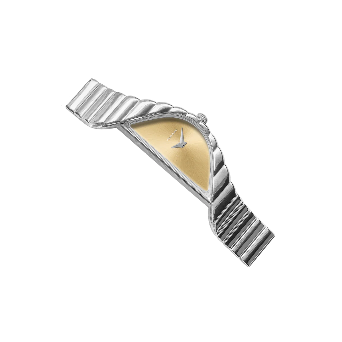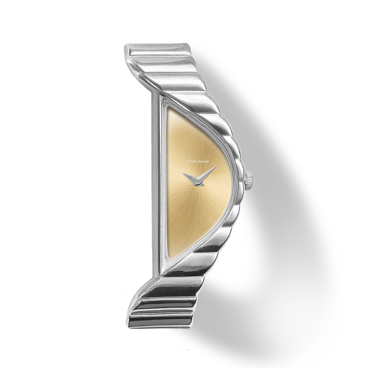 雕刻的銀色錶殼與波浪形錶鍊相得益彰,環繞著獨特的月牙形錶盤,錶盤沐浴在溫暖的淺金色色調中。旭日紋飾在每個動作中捕捉光芒,營造出柔和的光芒,令人聯想到黎明的第一道曙光。這款優雅現代的腕錶將藝術造型與雋永精緻融為一體,是欣賞低調而令人難忘的設計的人士的理想之選。