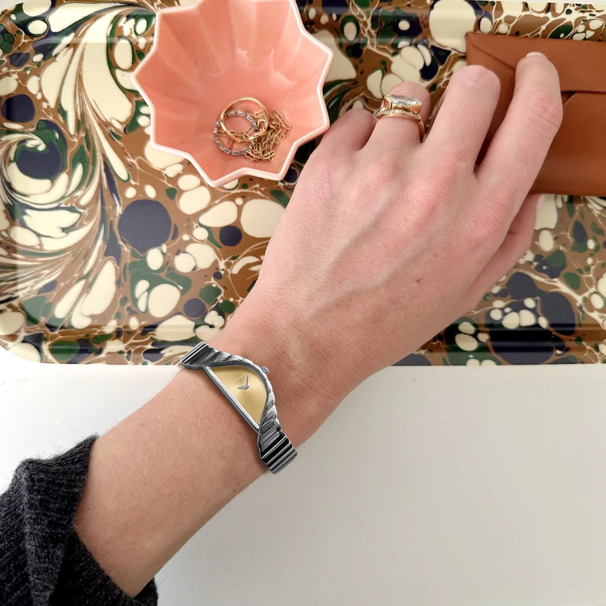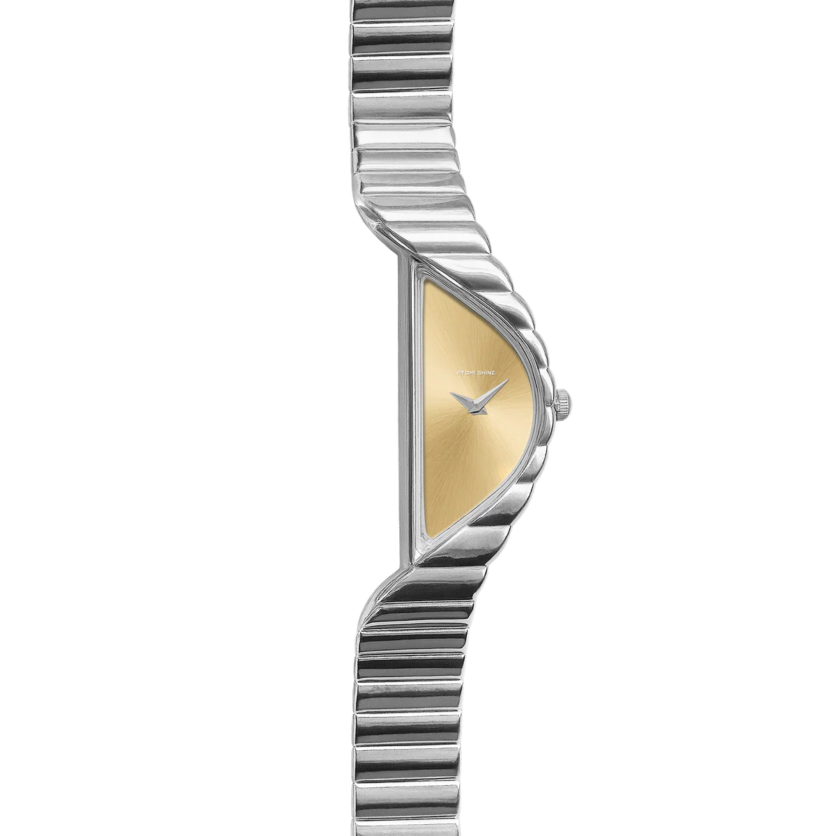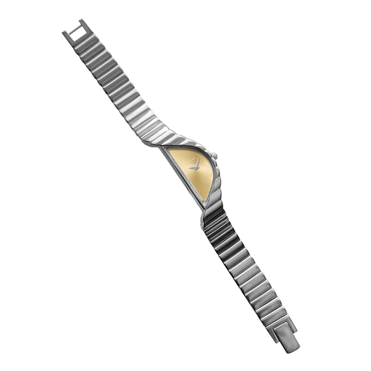 雕刻的銀色錶殼與波浪形錶鍊相得益彰,環繞著獨特的月牙形錶盤,錶盤沐浴在溫暖的淺金色色調中。旭日紋飾在每個動作中捕捉光芒,營造出柔和的光芒,令人聯想到黎明的第一道曙光。這款優雅現代的腕錶將藝術造型與雋永精緻融為一體,是欣賞低調而令人難忘的設計的人士的理想之選。