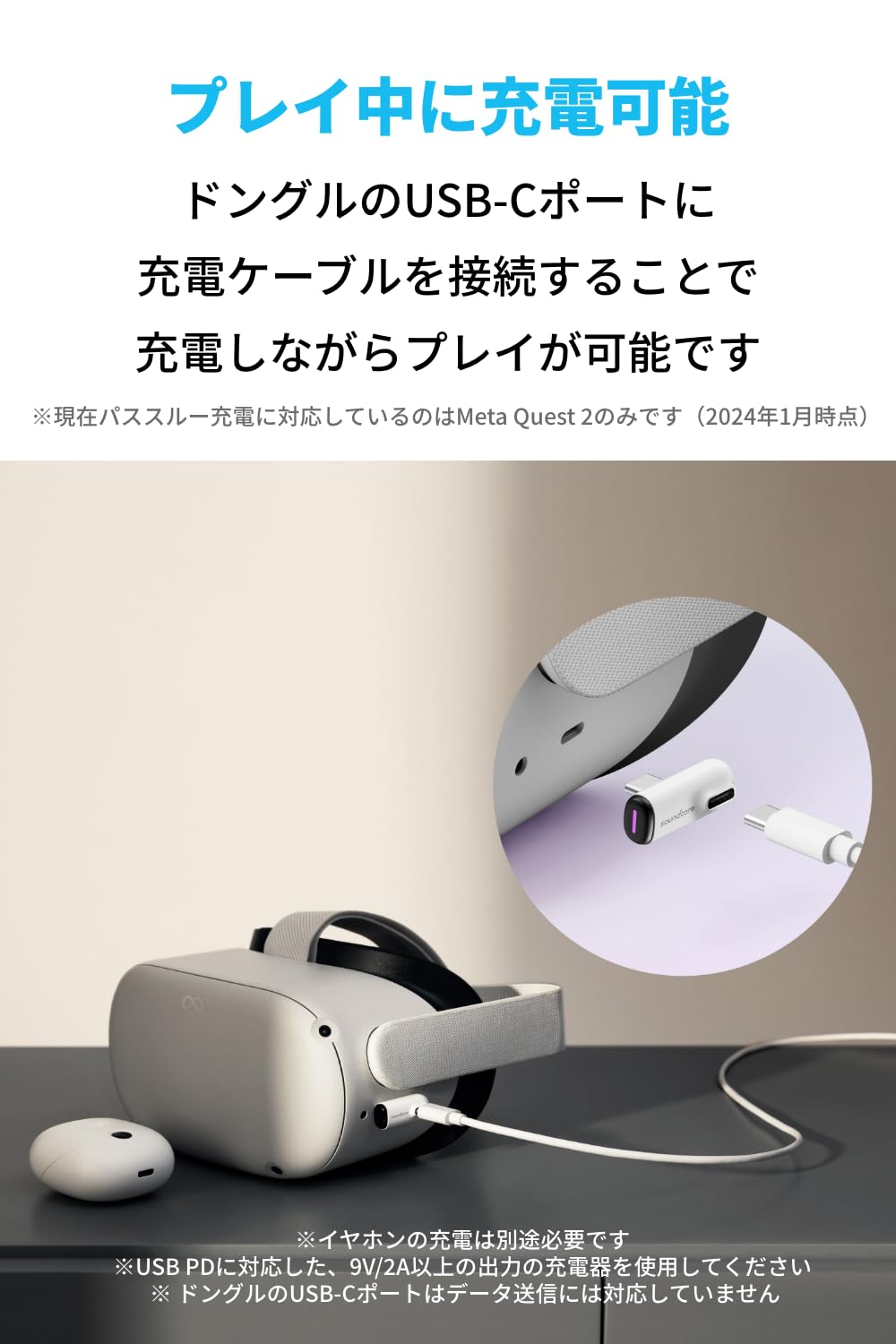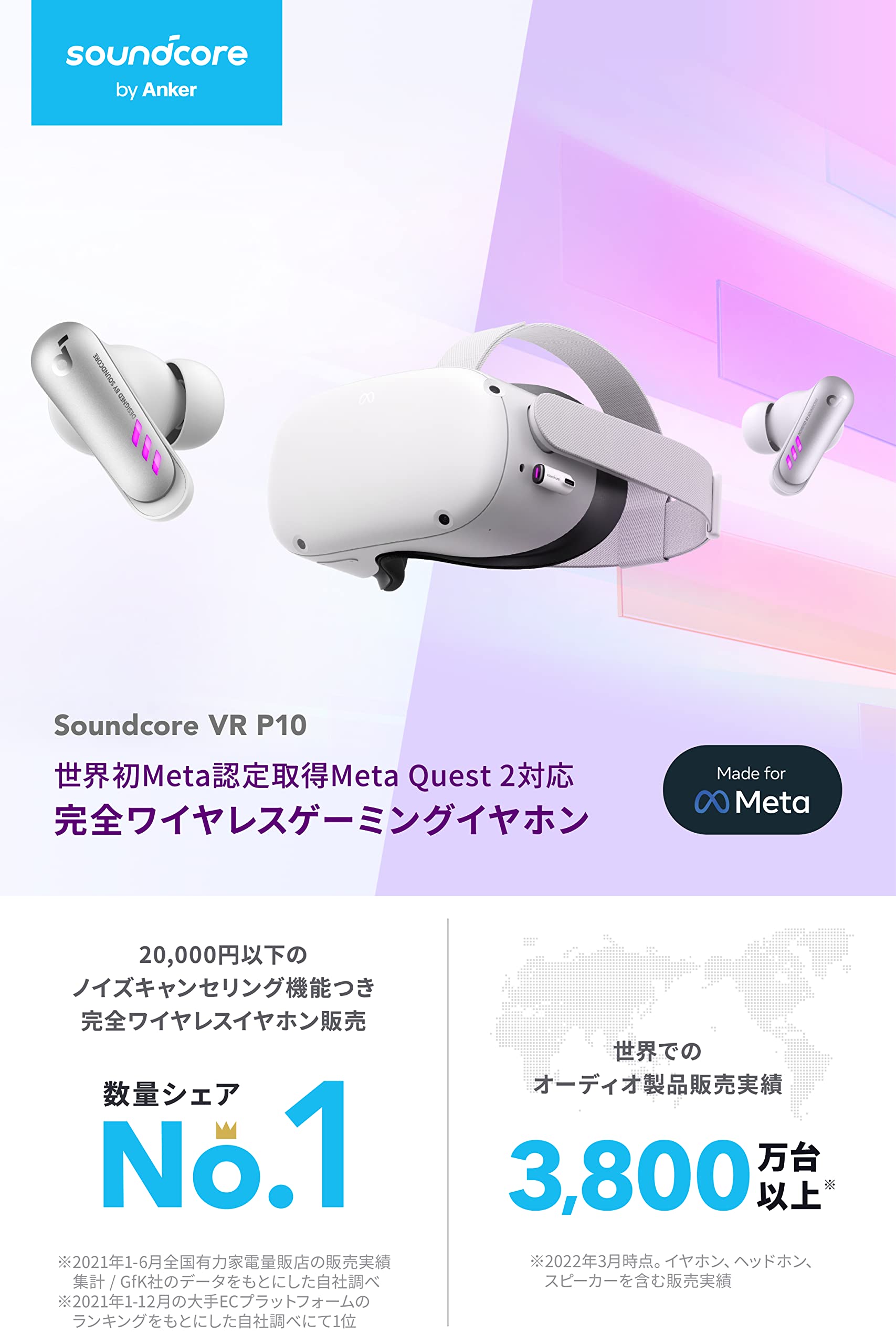 全球首款 Meta 認證,相容於 Meta Quest 2:Soundcore VR P10 是全球首款獲得「Made for Meta」認證的真無線遊戲耳機,是暢玩 Meta Quest 2 的理想選擇。 USB-C 轉接器連線便捷,延遲極低,帶來流暢的遊戲體驗。