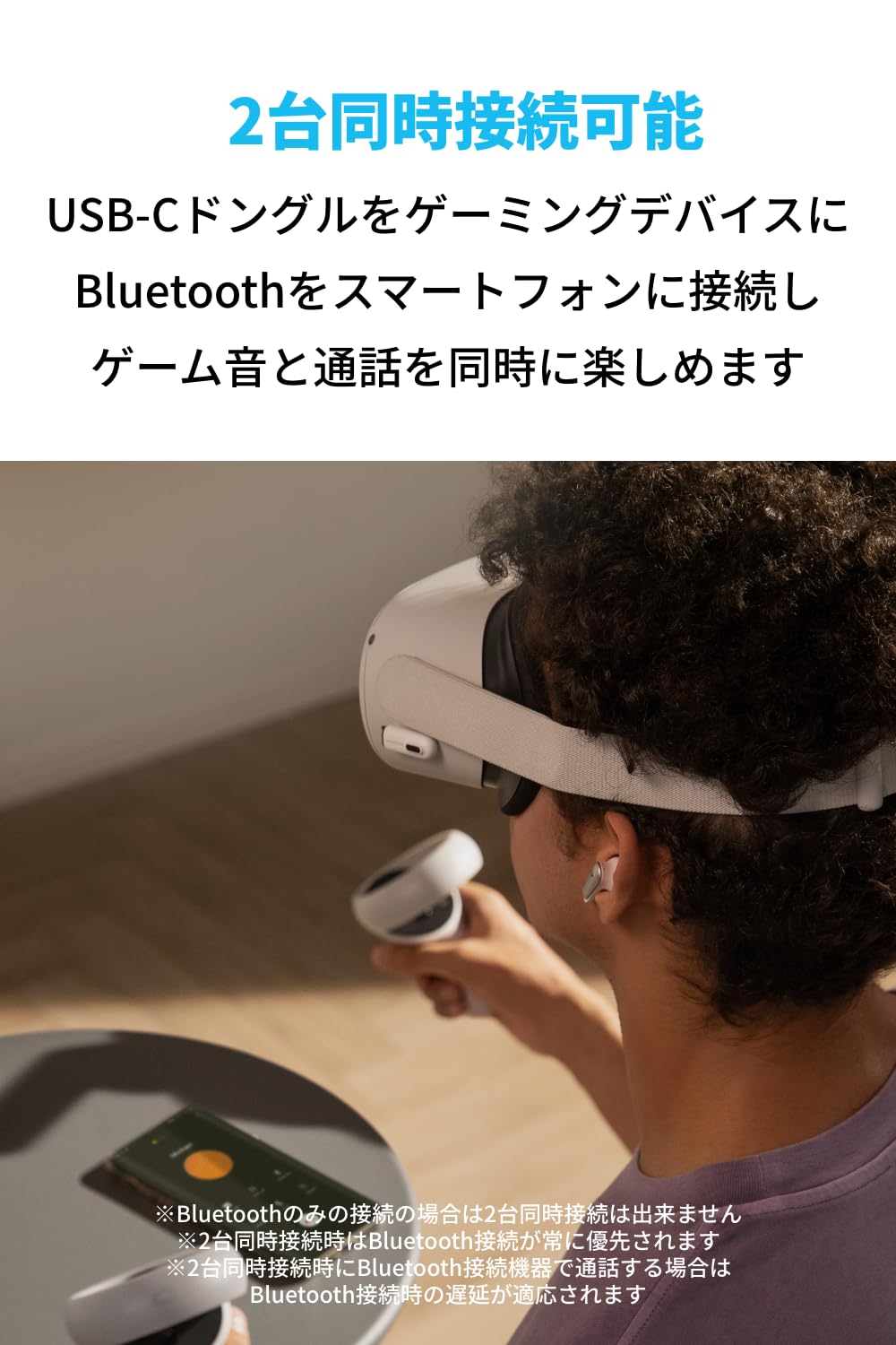 連接任何具有適配器和藍牙的設備:支援適配器連接,讓您可以連接到任何設備,包括不支援藍牙的 VR 眼鏡和遊戲主機。透過將轉接器同時連接到遊戲設備,並透過藍牙連接到智慧型手機,您可以在聆聽遊戲音訊的同時享受語音聊天和通話。