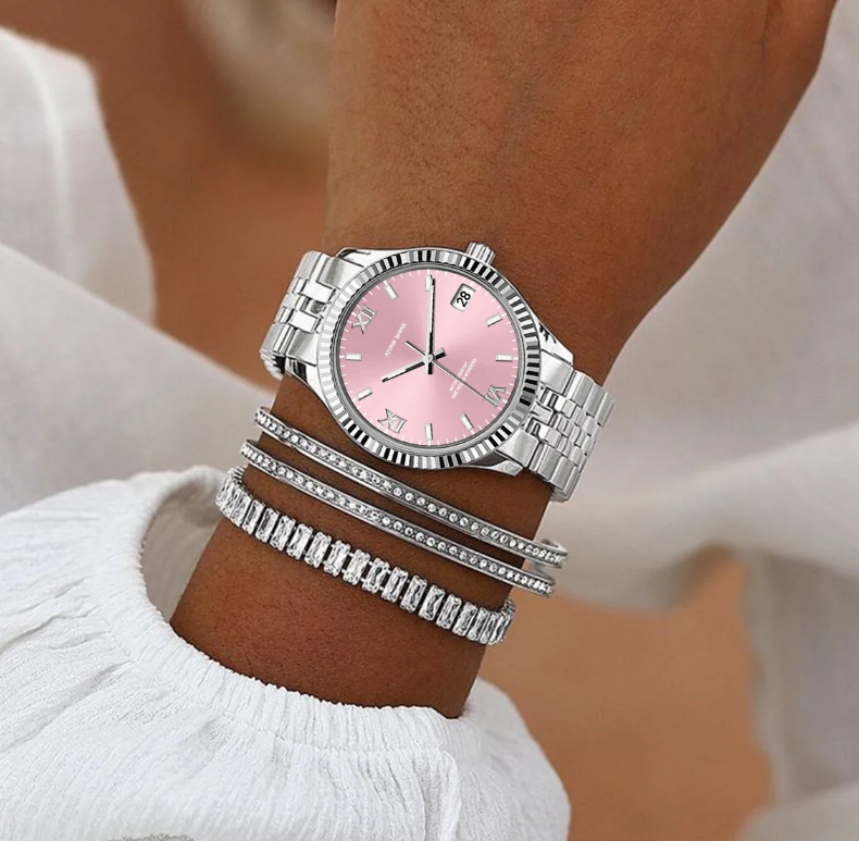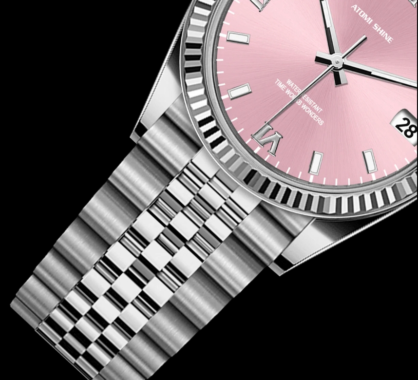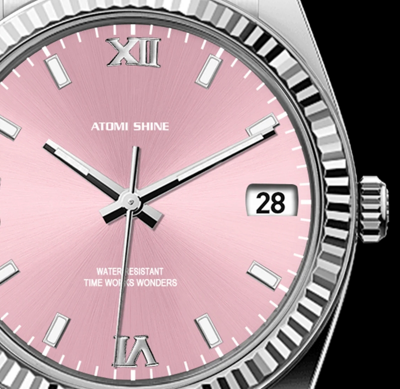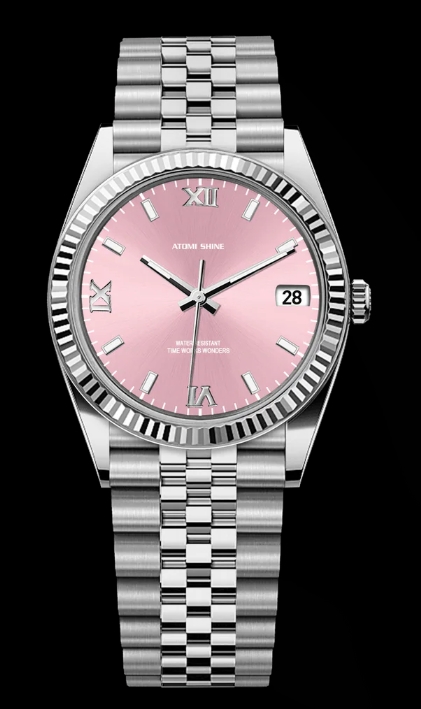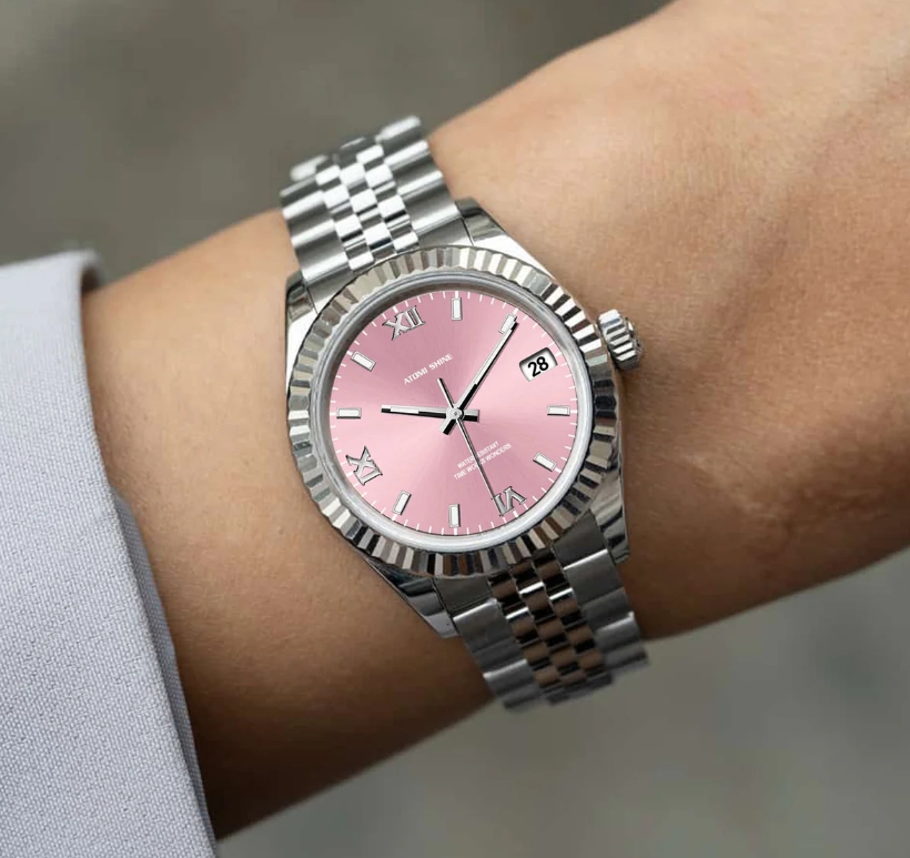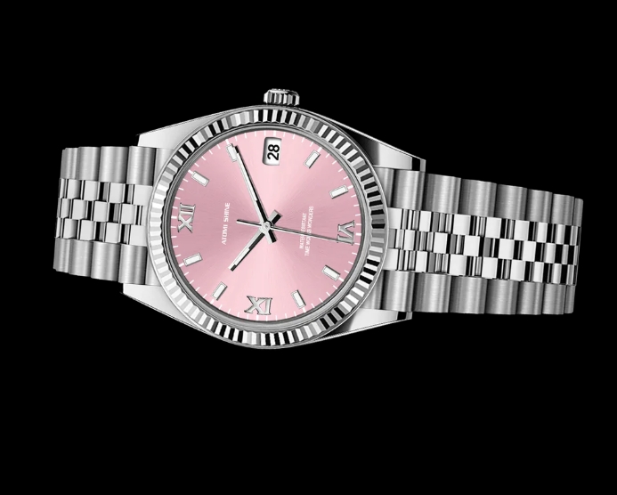 淺粉紅色錶盤營造出寧靜清爽的氛圍,與銀色時標和指針形成微妙的對比。這種柔和的色彩組合提升了易讀性,同時散發出沉穩優雅的氣息。 36毫米的錶殼尺寸確保了完美的平衡,佩戴舒適,佩戴在腕間更顯優雅。淺粉色腕錶外觀柔和而醒目,可為您的衣櫥增添一抹亮色,同時又不會喧賓奪主。