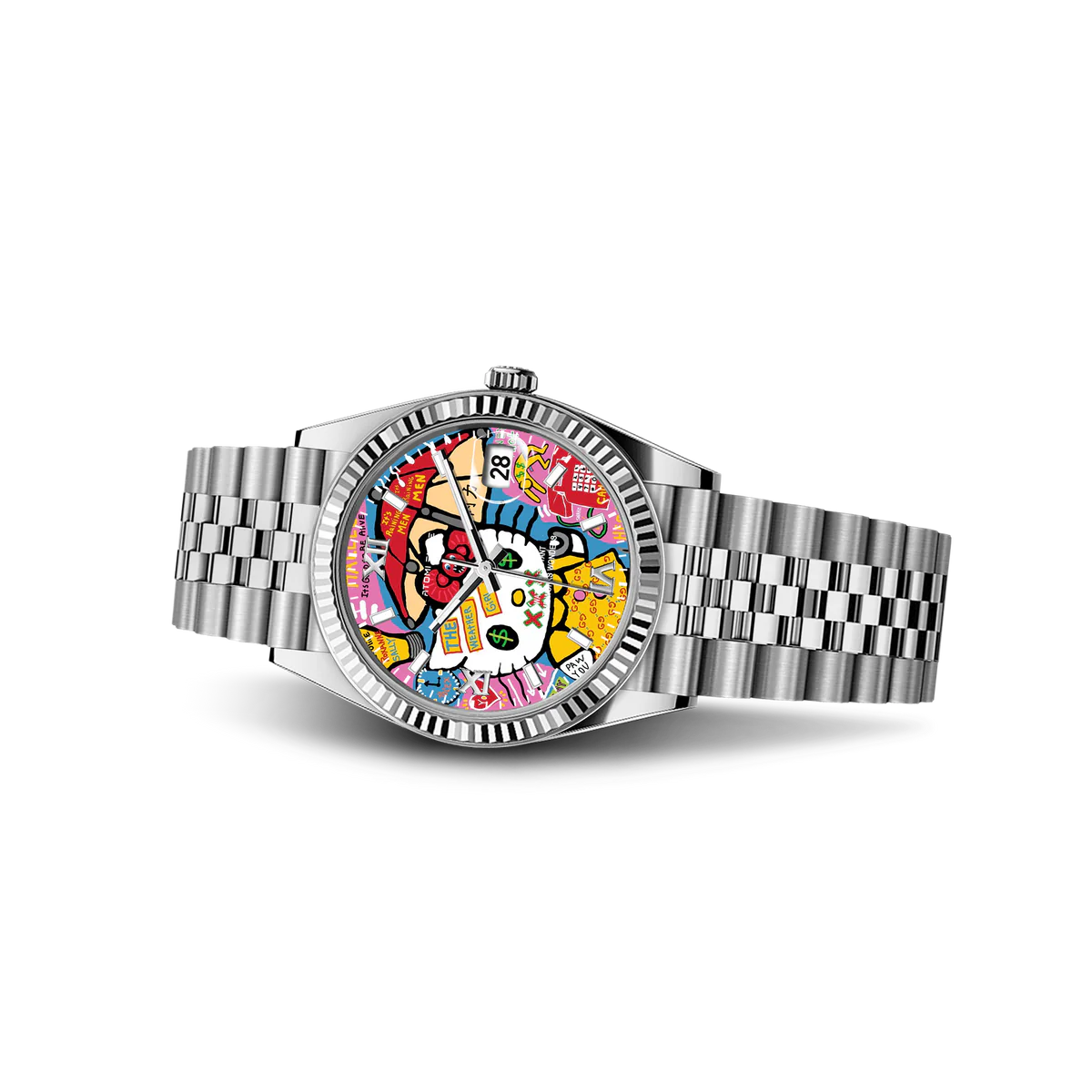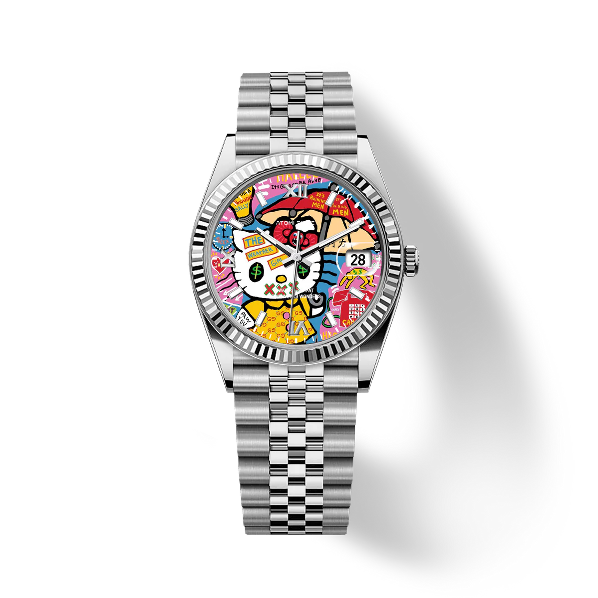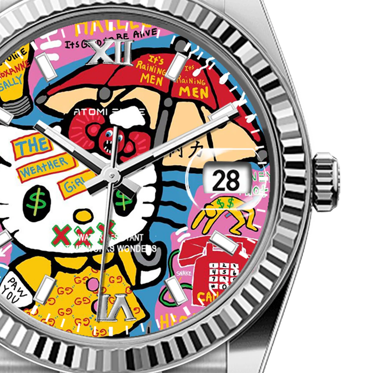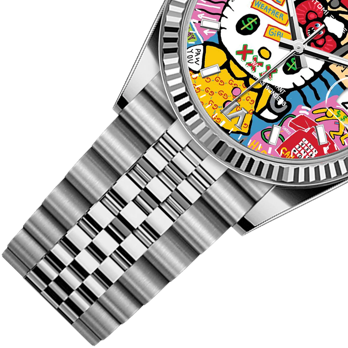 這款腕錶採用拋光銀錶殼和五鍊式錶鍊,將雋永的正式感與奔放的都會格調完美融合。錶盤格外吸睛——以不羈的視角重新詮釋了人們熟悉的貓咪形象,周圍環繞著大膽的塗鴉、美元符號、卡通眼睛、流行語彙和繽紛的色彩。每一次凝視,都能展現出一層層新的故事、叛逆的氣息和視覺的智慧。