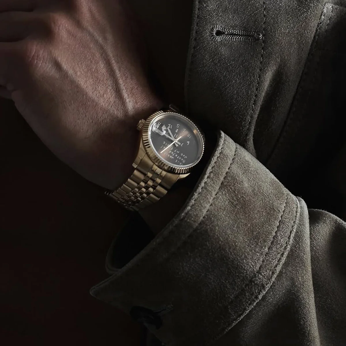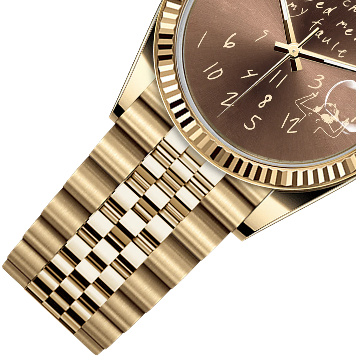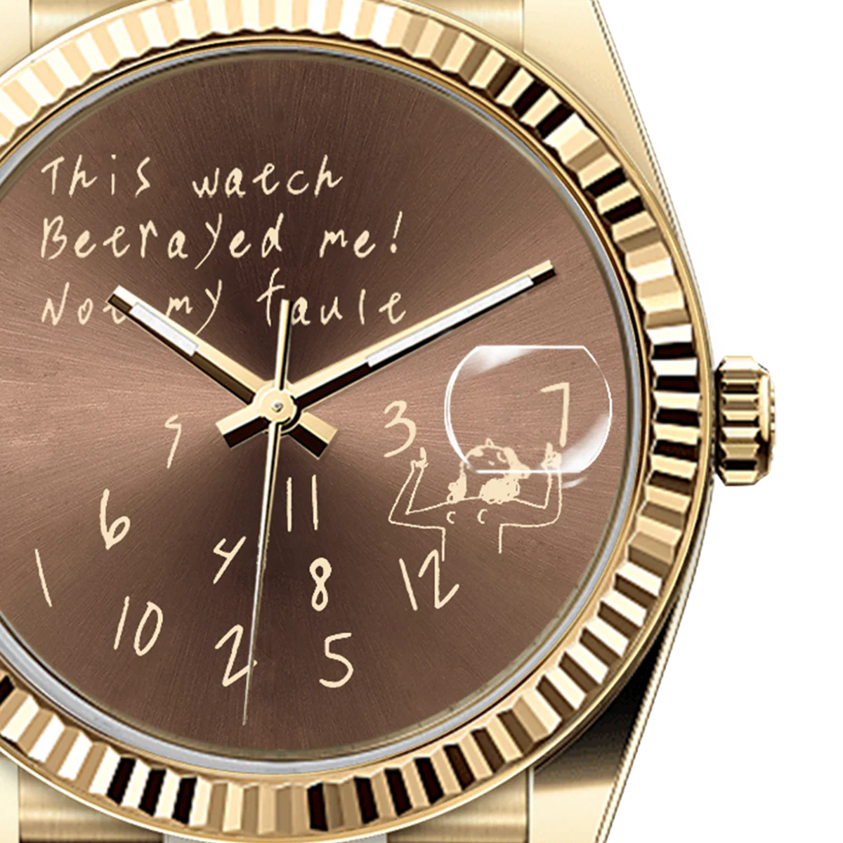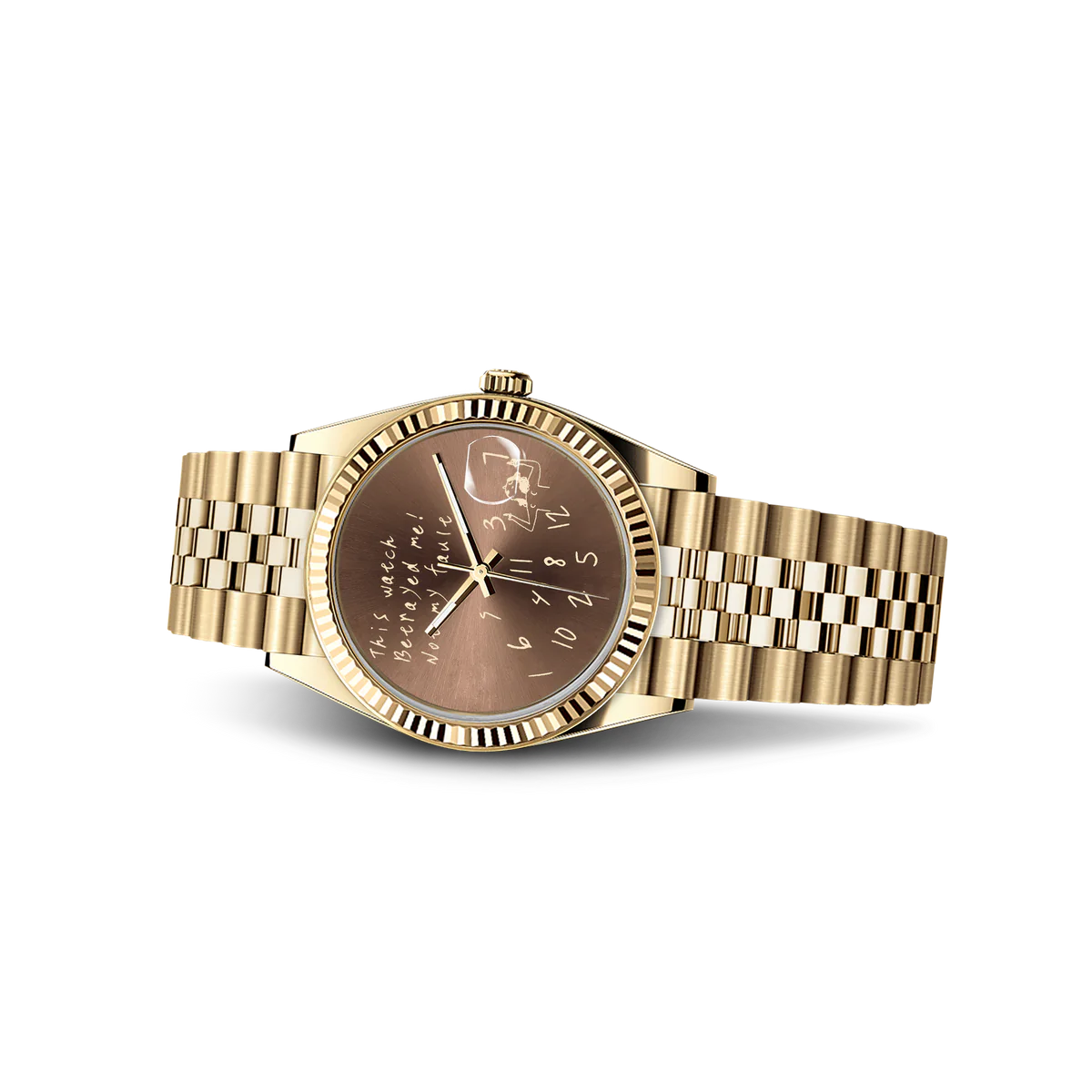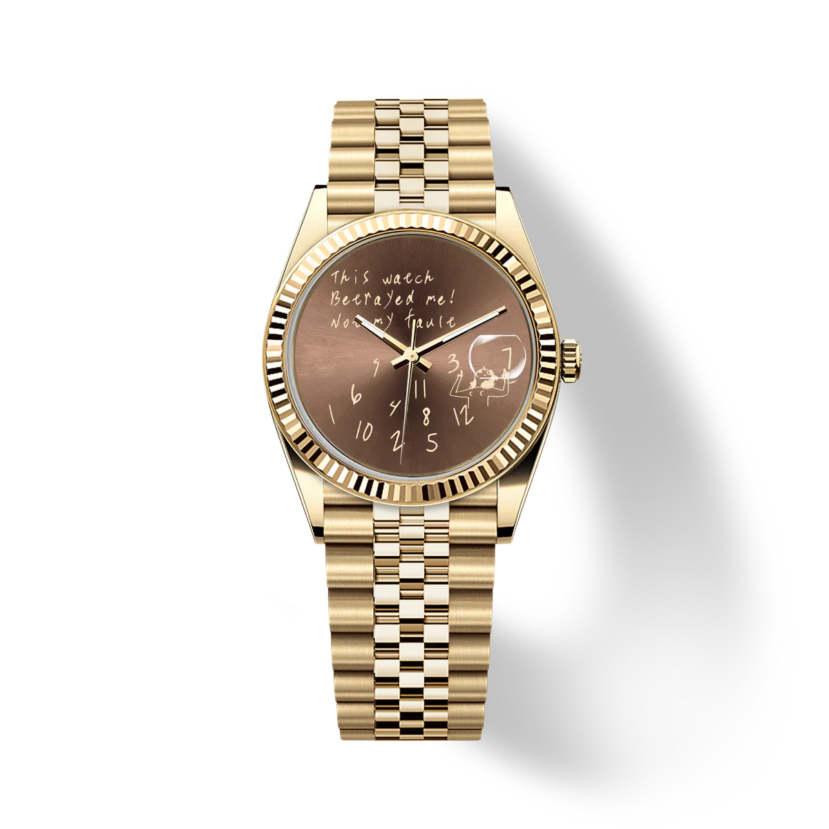 這款36毫米金色不鏽鋼腕錶打破常規,不只是一塊腕錶,更是一份宣言。在濃鬱的棕色錶盤上,醒目的「這塊錶背叛了我,不是我的錯」字樣,挑戰著計時的常規。時標散落在錶盤下半部分,錯落有致,反映時間的變化。這款腕錶擁有時尚的金色錶殼和實用的日期顯示,專為追求個性和不落俗套的人士打造。