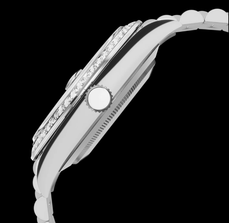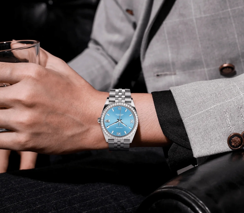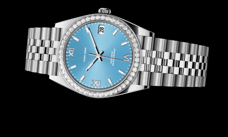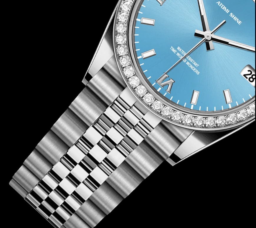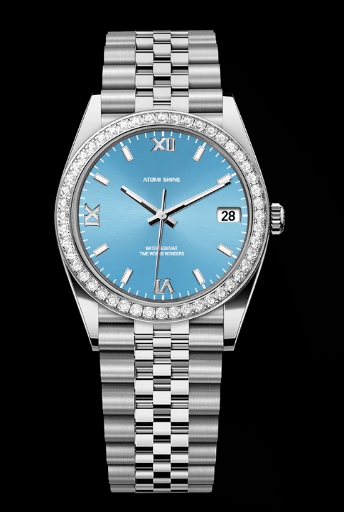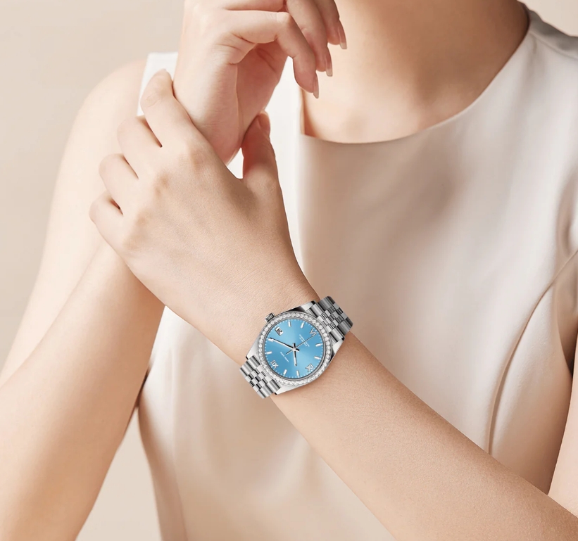 這款精緻的36毫米腕錶採用金色316不鏽鋼錶殼和錶鍊,搭配鑲鑽錶圈,共鑲嵌1.3克拉鑽石。鮮豔的湖藍色錶盤增添一抹清新的色彩,腕錶搭載精準的石英機芯,並配備日期顯示功能。夜光琺瑯時標和指針確保在低光源環境下清晰易讀。奢華、優雅與實用的完美融合。