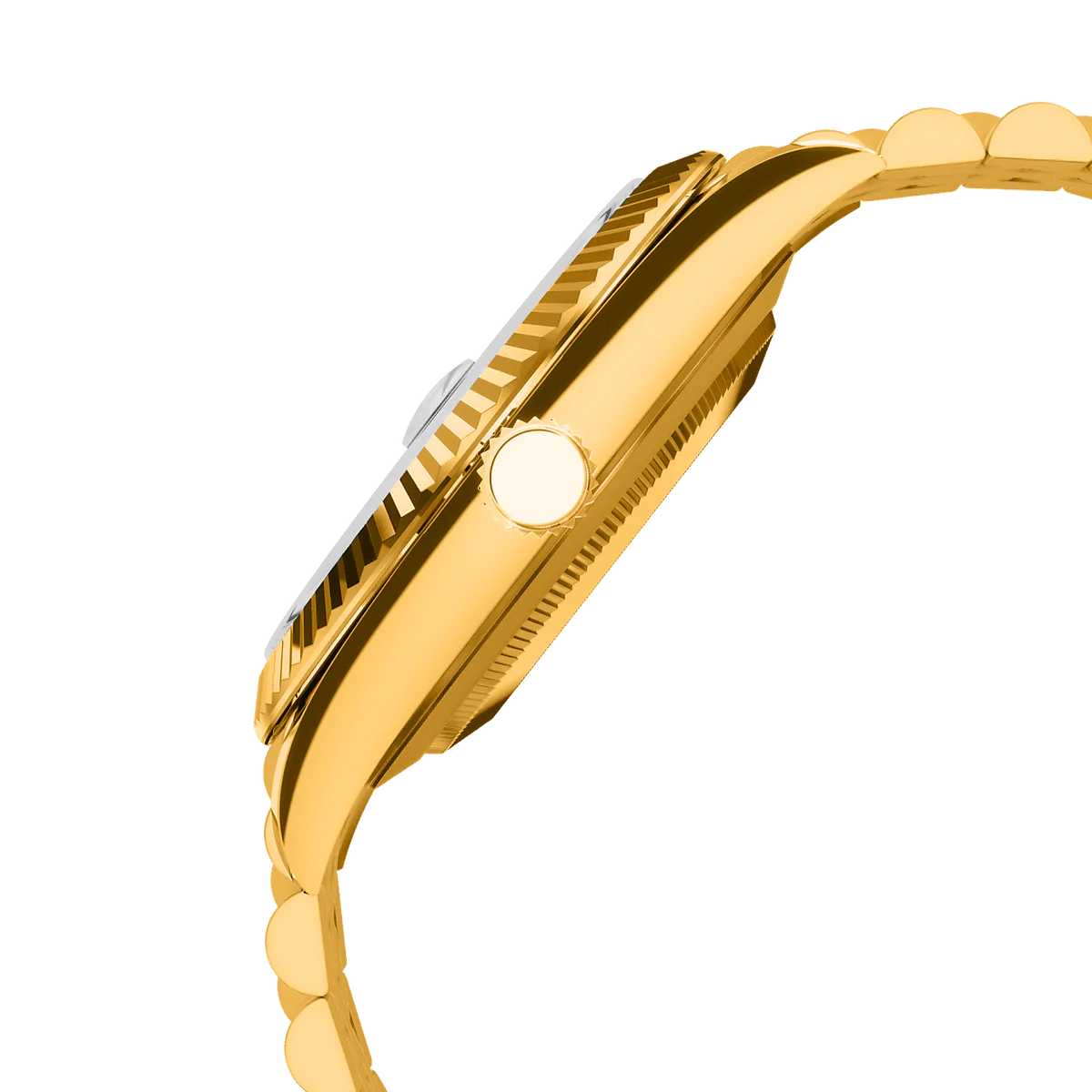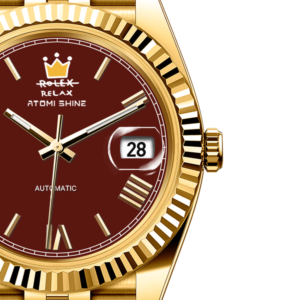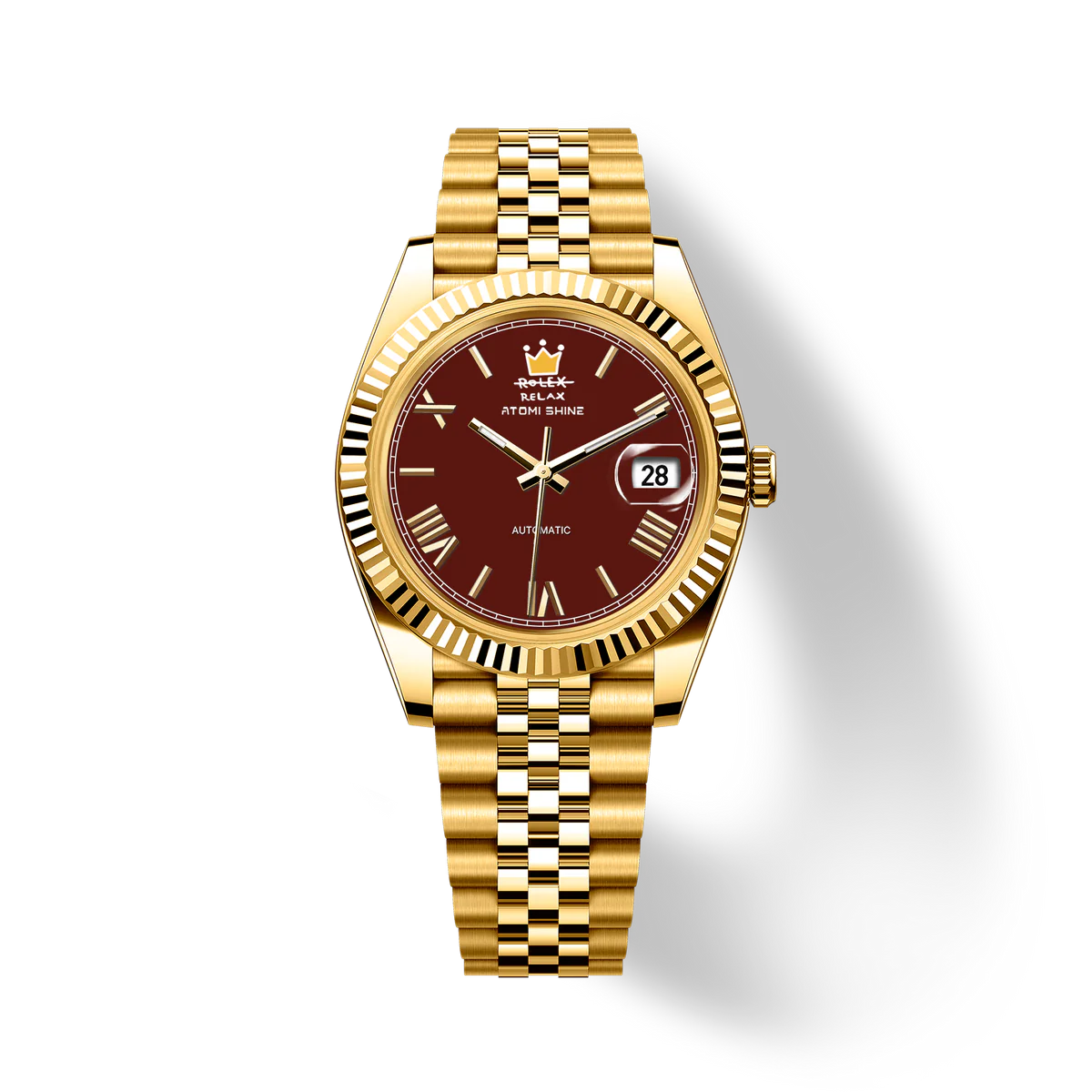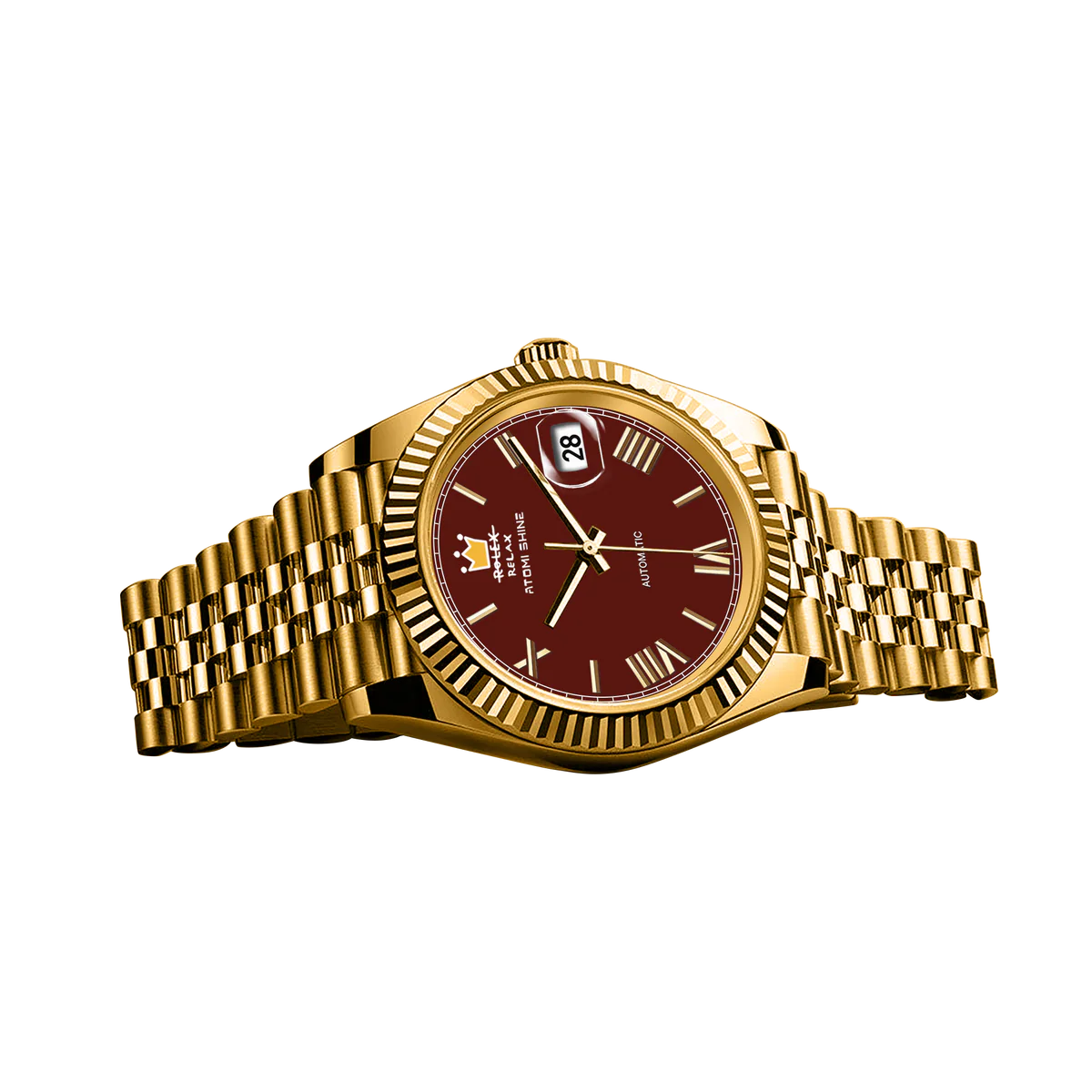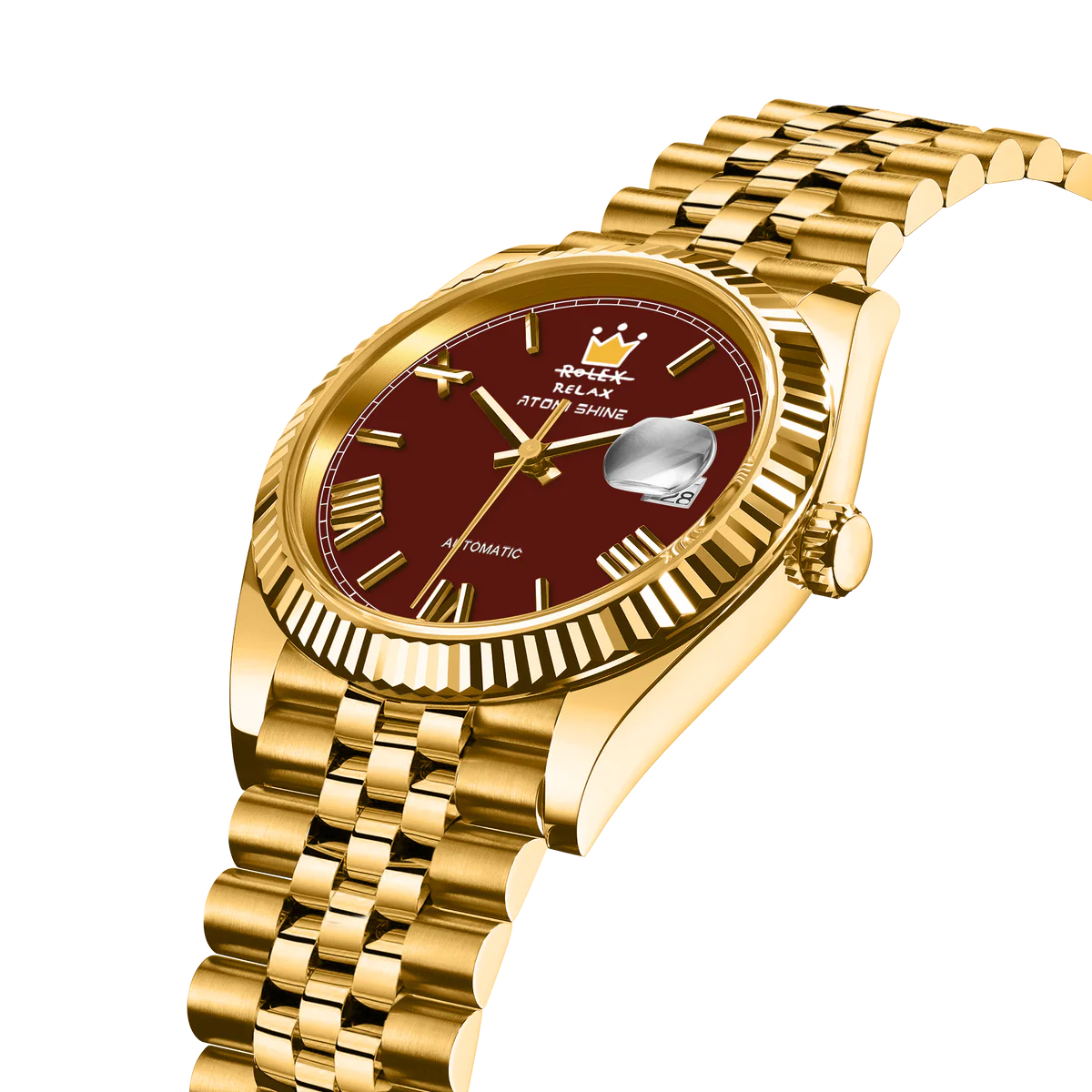 金色不鏽鋼錶殼搭配禧年風格錶鍊,散發出永恆奢華的氣息,深紅色錶盤則與醒目的精緻對比形成鮮明對比。 12點鐘位置,手繪黃色錶冠更添藝術氣息與個性,同時巧妙地重新詮釋了傳統,將熟悉的字樣巧妙地改為“RELAX”(放鬆)字樣。凹槽錶圈環繞錶盤,提升了整體的風格,3點鐘位置的放大日期視窗則確保了清晰實用的顯示效果。
