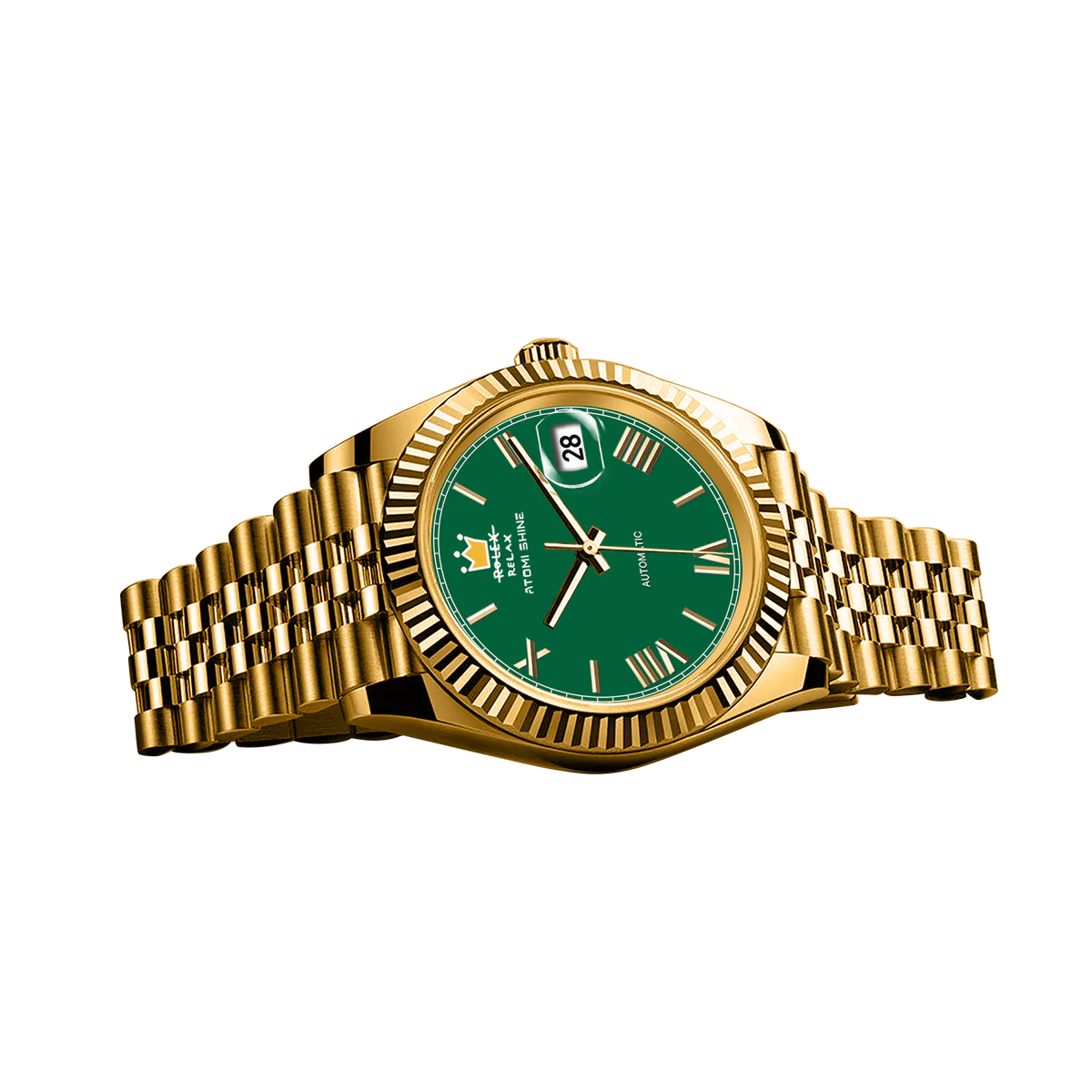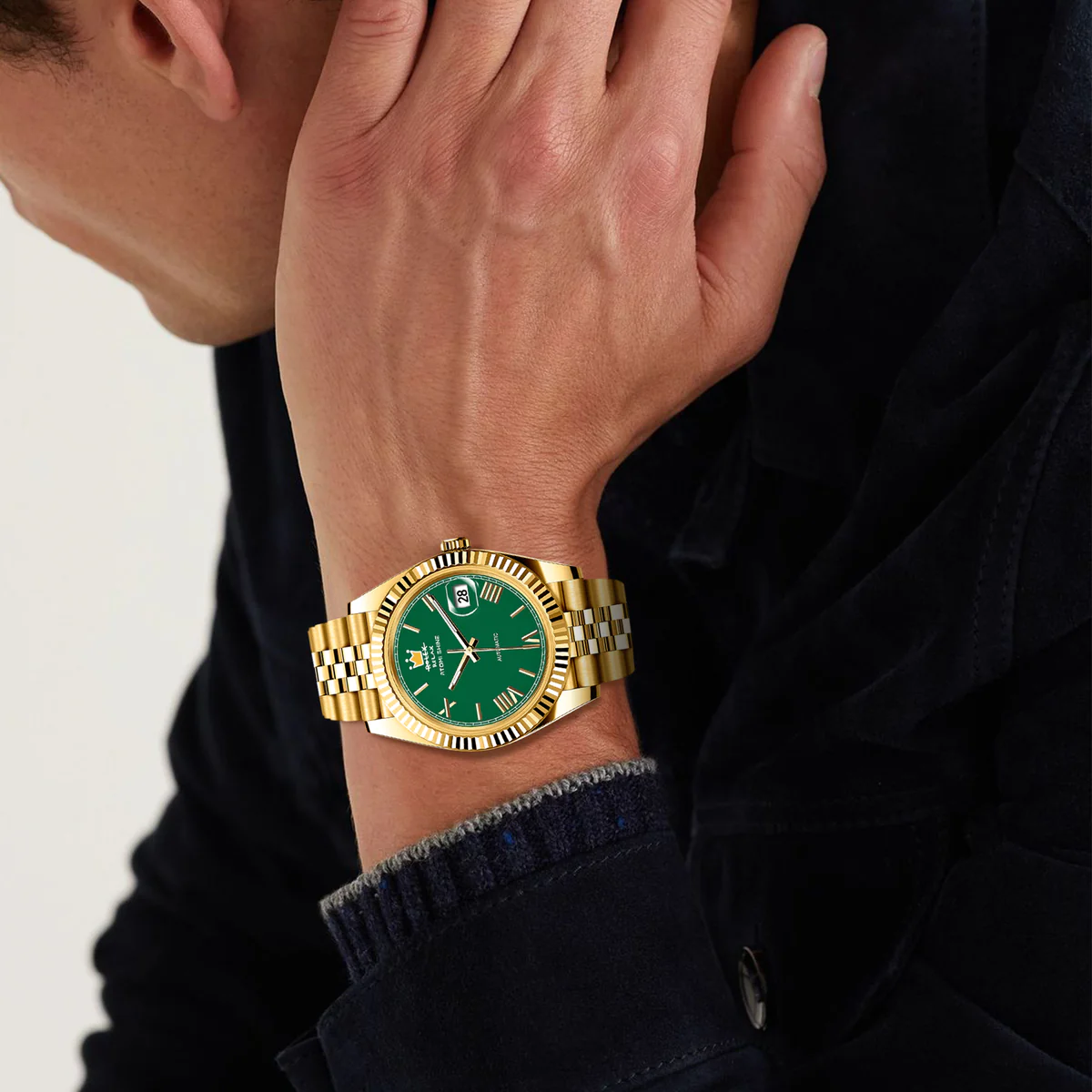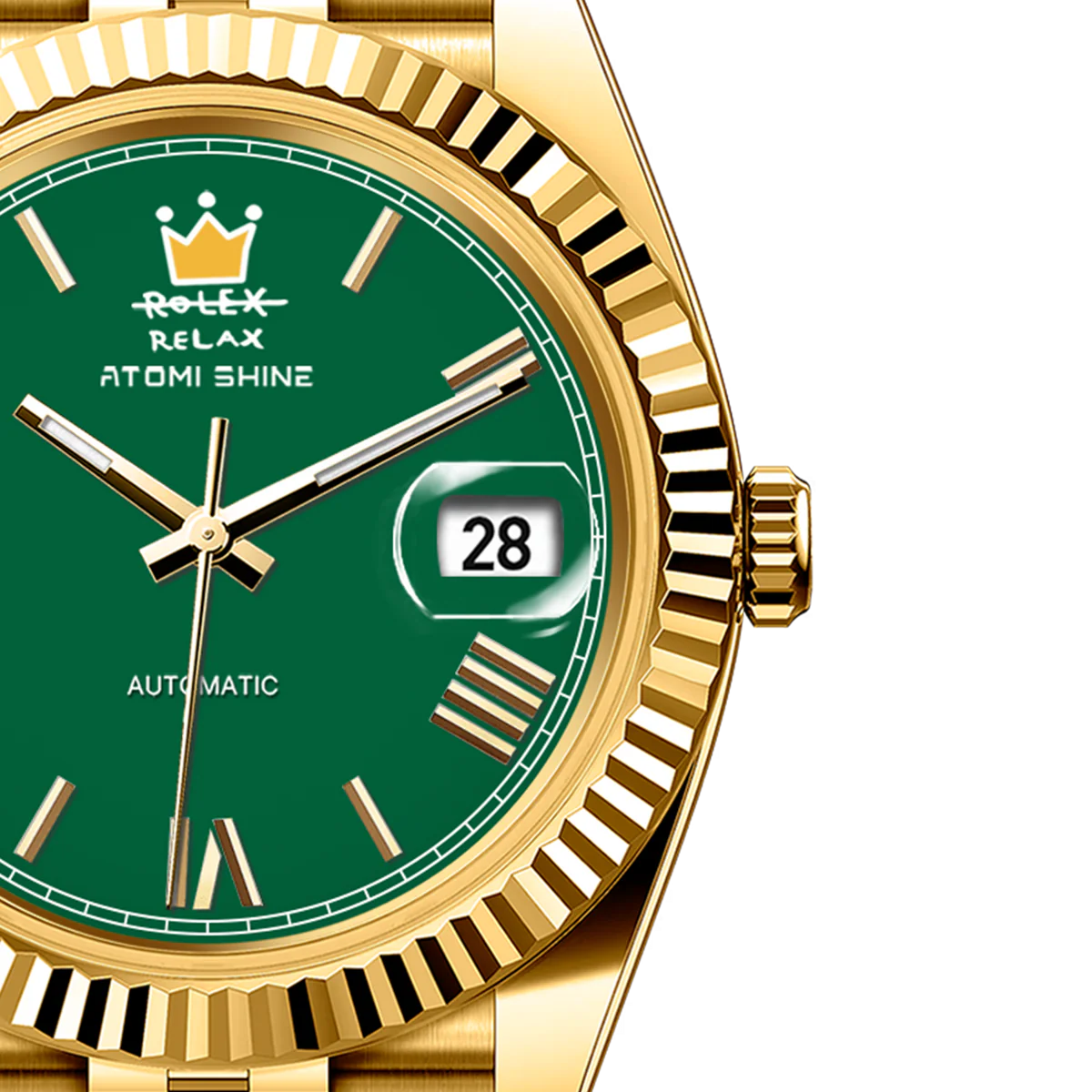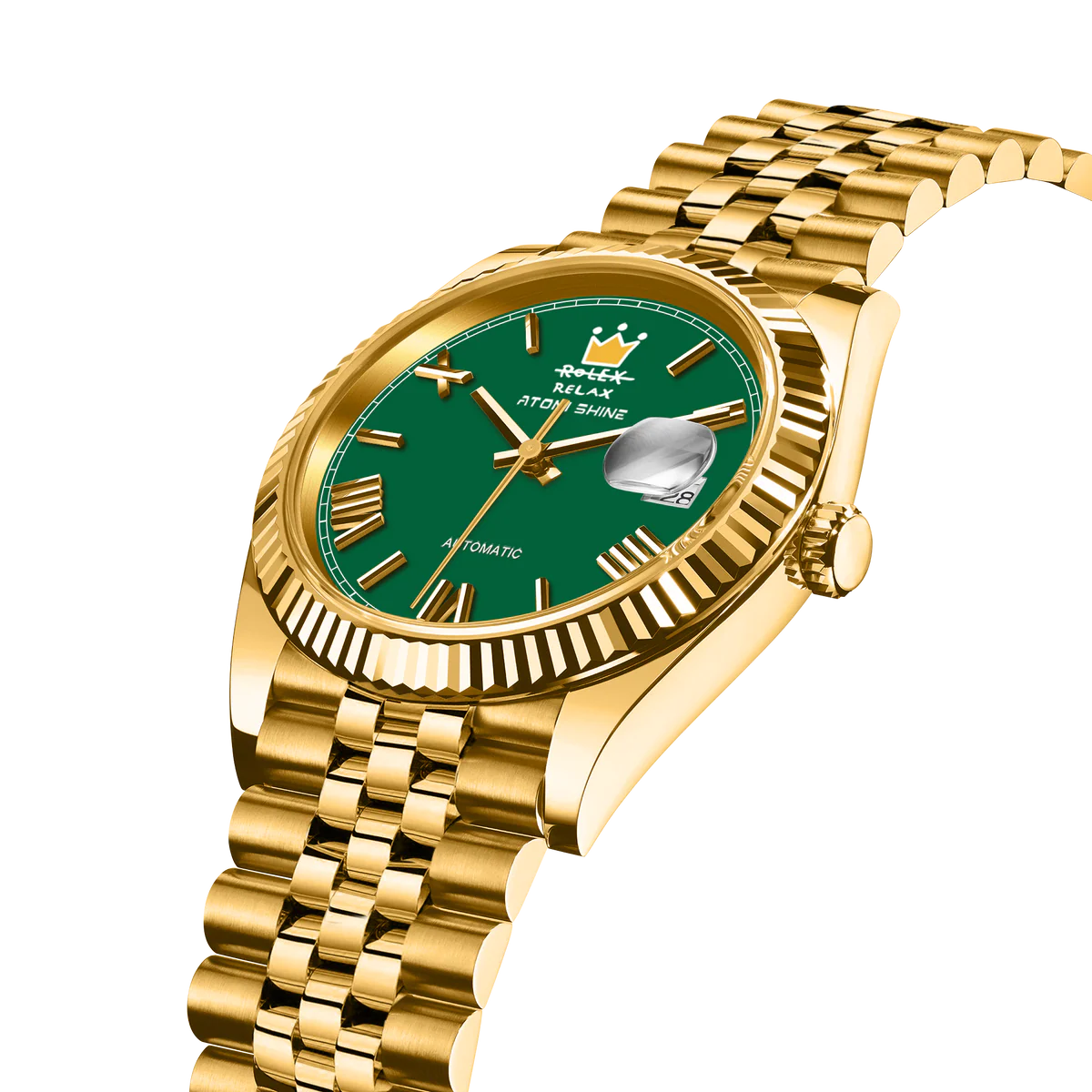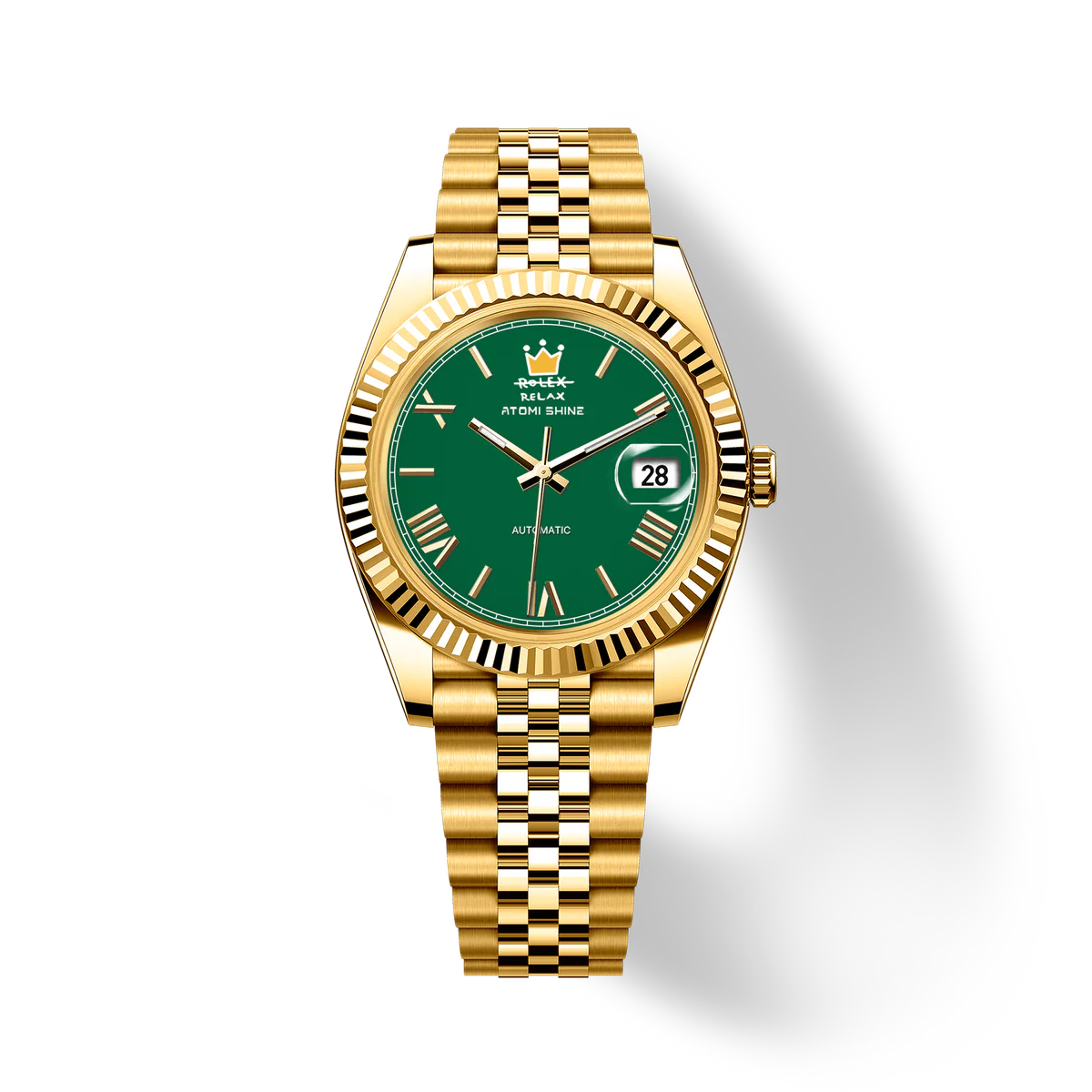 金色不鏽鋼錶殼搭配禧年風格錶鍊,散發著雋永的精緻氣質,深邃的祖母綠錶盤則散發著活力與非凡的氣質。 12點鐘位置,手繪黃色錶冠更添藝術氣息,巧妙地將文字“RELAX”(放鬆)巧妙地重新詮釋,使其更具趣味性。凹槽錶圈將錶盤襯托得光彩奪目,3點鐘位置的放大日期窗口則兼具經典實用性,確保清晰易讀。