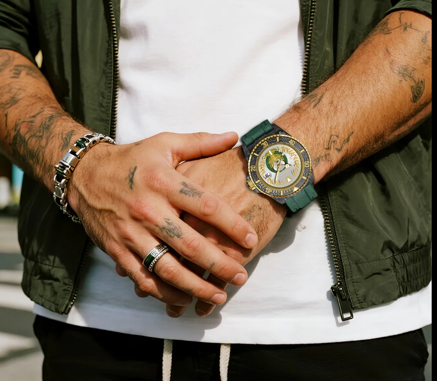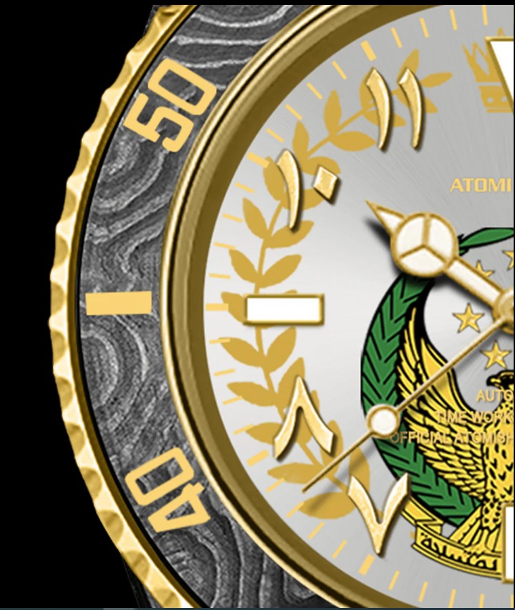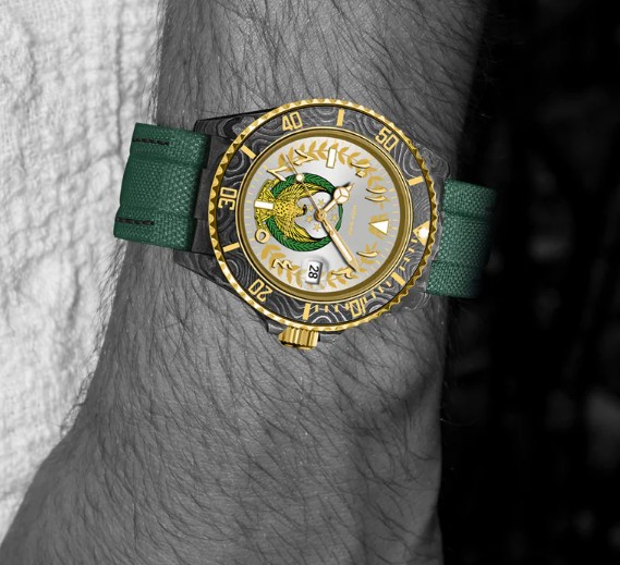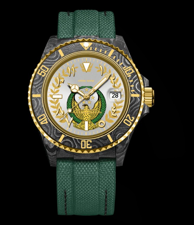 這款40毫米腕錶採用碳纖維材質打造,重量僅58克,輕盈、強勁、意義非凡,性能卓越,絕不妥協。單向碳纖維錶圈搭配撞色計時刻度,展現大膽的戰術風格。銀色錶盤飾有阿聯酋武裝部隊肩章,以強烈的視覺效果致敬其勇氣與奉獻精神。搭配堅固的軍綠色尼龍錶帶,這款腕錶經久耐用,兼具象徵意義。搭載可靠的日本精工NH35自動上鍊機芯,將精密工藝與愛國情操完美融合。
