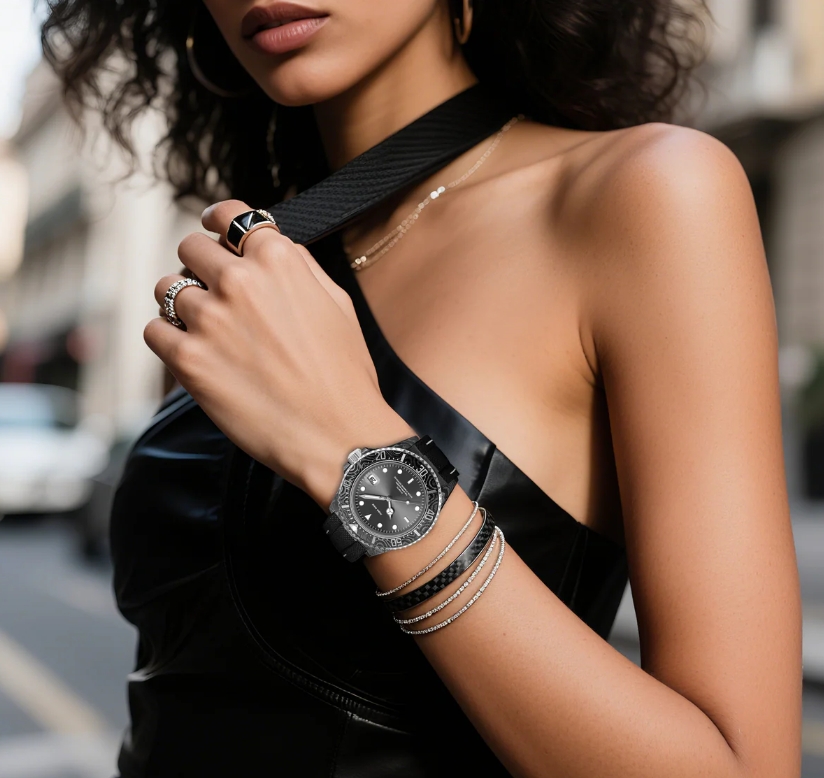 這款腕錶的黑色錶圈和黑色錶盤營造出統一醒目的外觀,使其成為欣賞簡潔設計和大膽簡約風格人士的理想之選。錶盤上方的時間顯示窗確保輕鬆計時,為腕錶的經典魅力增添一抹現代氣息。全黑設計彰顯精緻,碳纖維結構則兼具耐用性和時尚感。