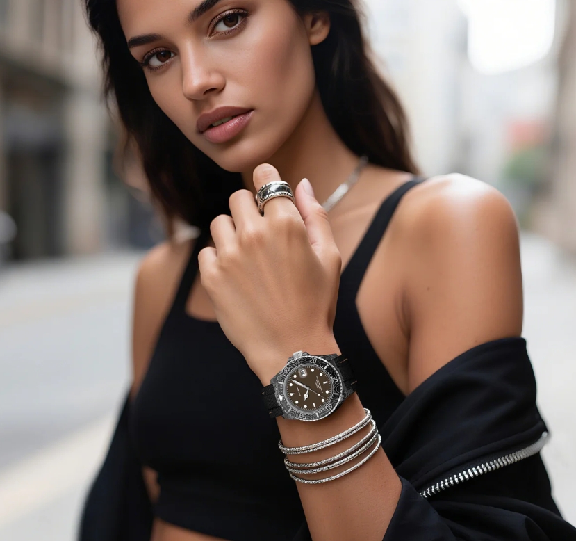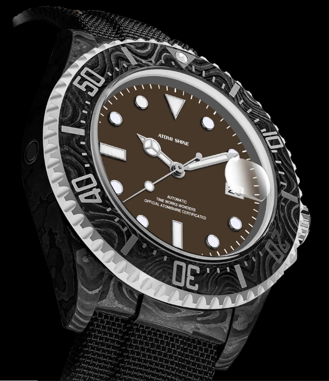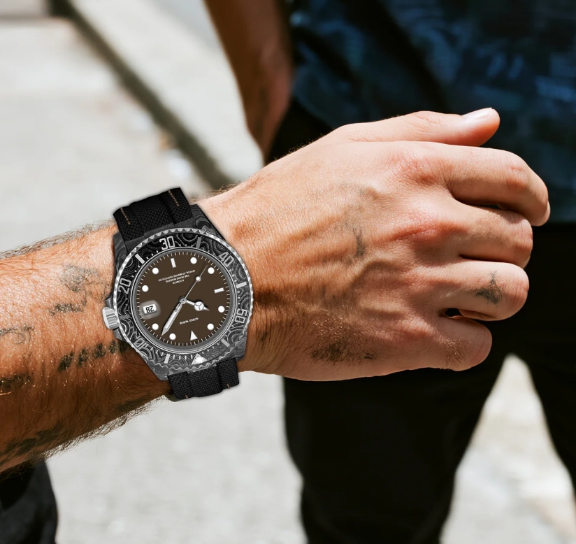 這款腕錶採用黑色錶帶和光滑的黑色碳纖維錶殼,展現力量與精緻,是兼具性能與設計感的腕錶愛好者的理想之選。黑色錶圈與大膽的碳纖維美學相得益彰,深棕色錶盤則營造出濃鬱溫暖的對比,賦予腕錶深邃的氣質和獨特的個性。錶盤上的時間顯示窗增強了腕錶的功能性,在保持簡潔外觀的同時,方便讀取時間。