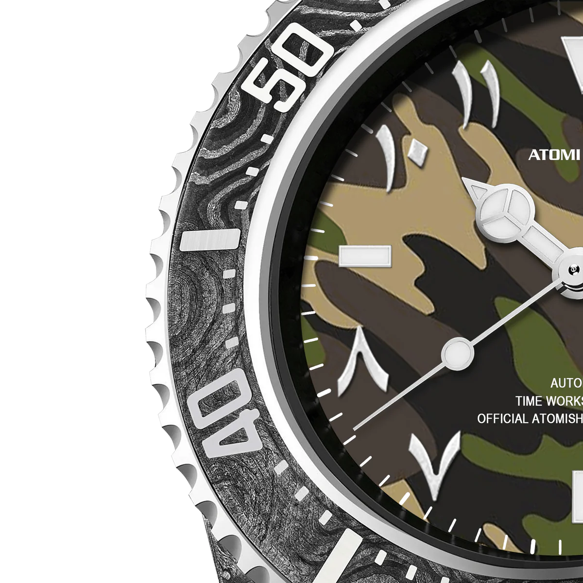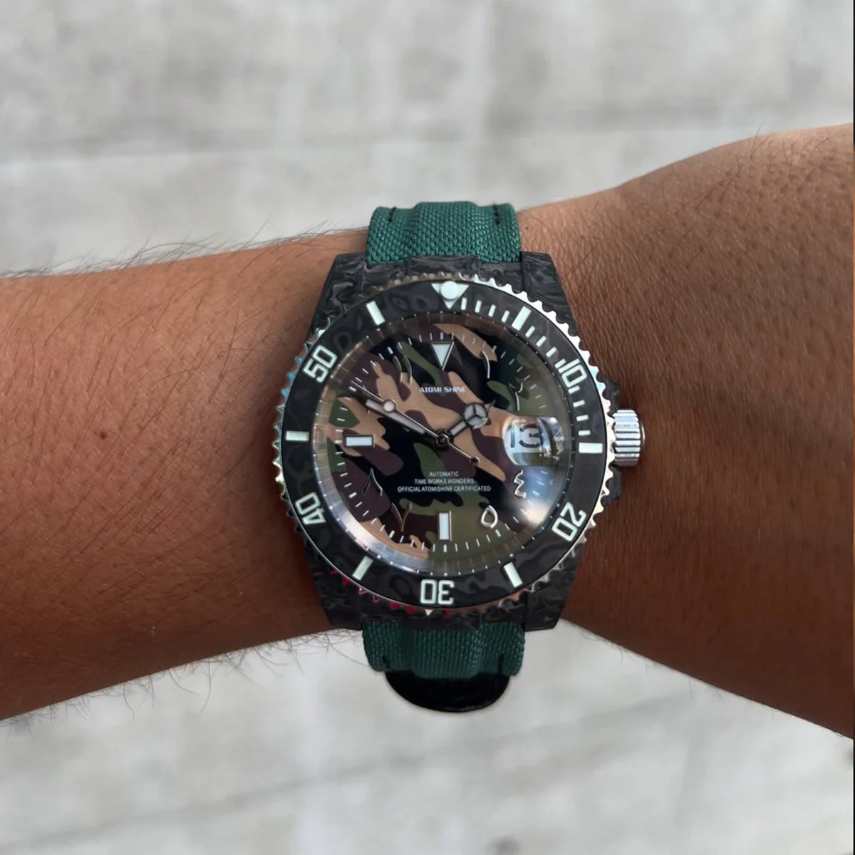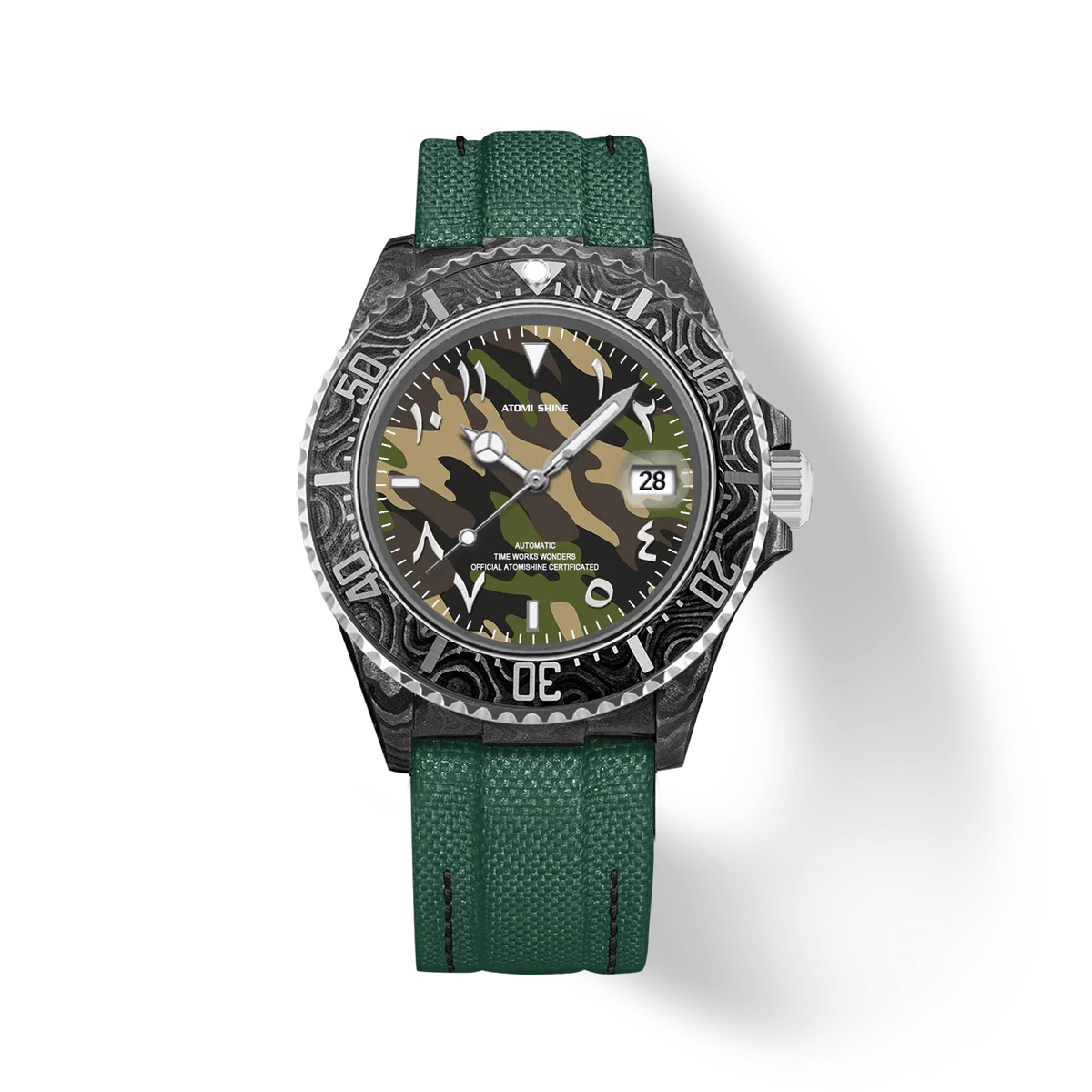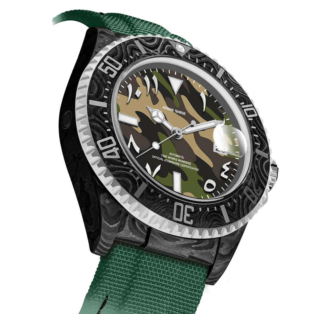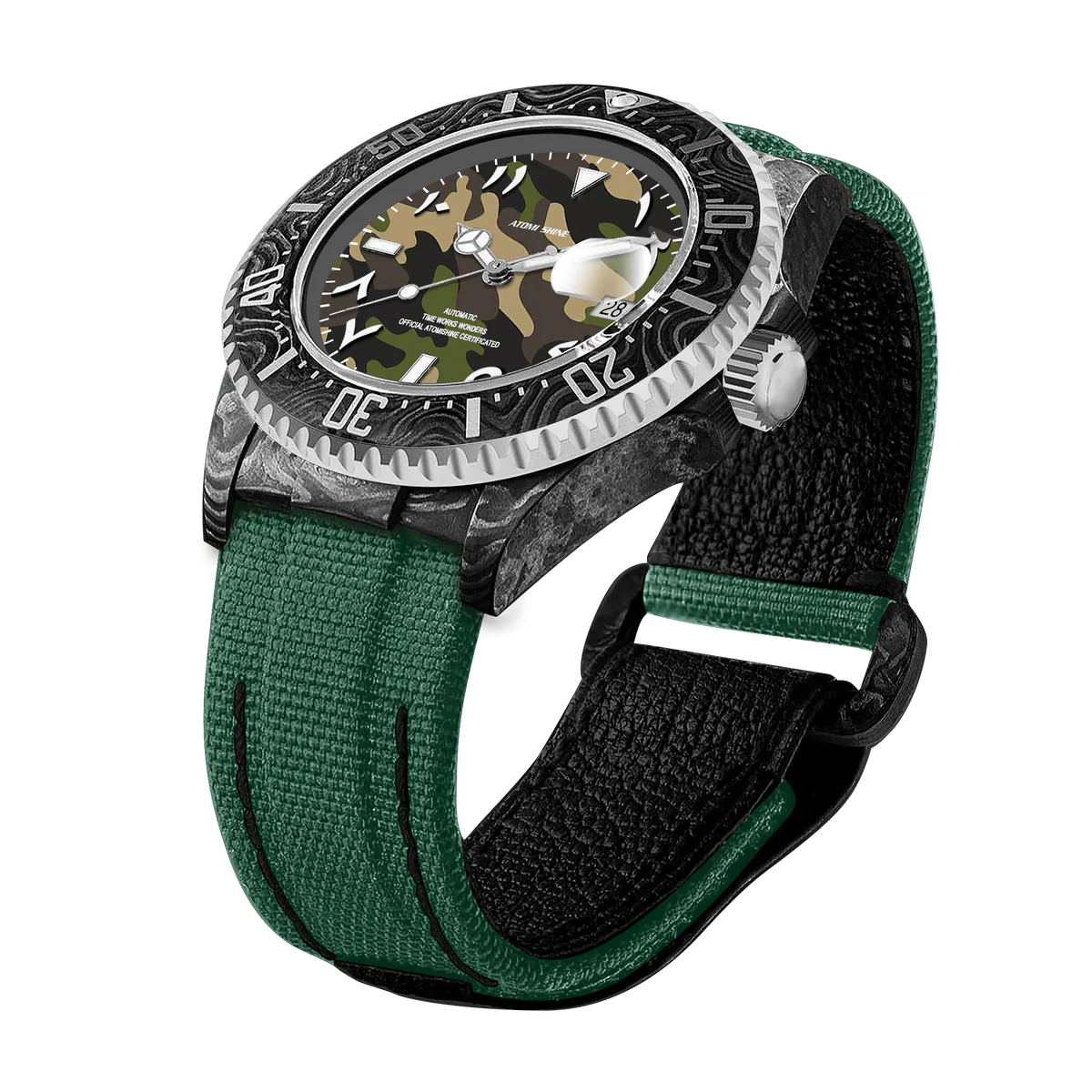 這款碳纖維戰術腕錶專為勇於冒險的人士打造。其碳纖維錶殼重量僅 58 克,堅固耐用,卻不失輕盈。搭載精密自動機芯,確保在任何環境下都能可靠運作。錶盤飾有迷彩圖案,更添粗的軍旅風美感。搭配飾有黑色縫線的深綠色尼龍錶帶,完美融合了硬朗與時尚。