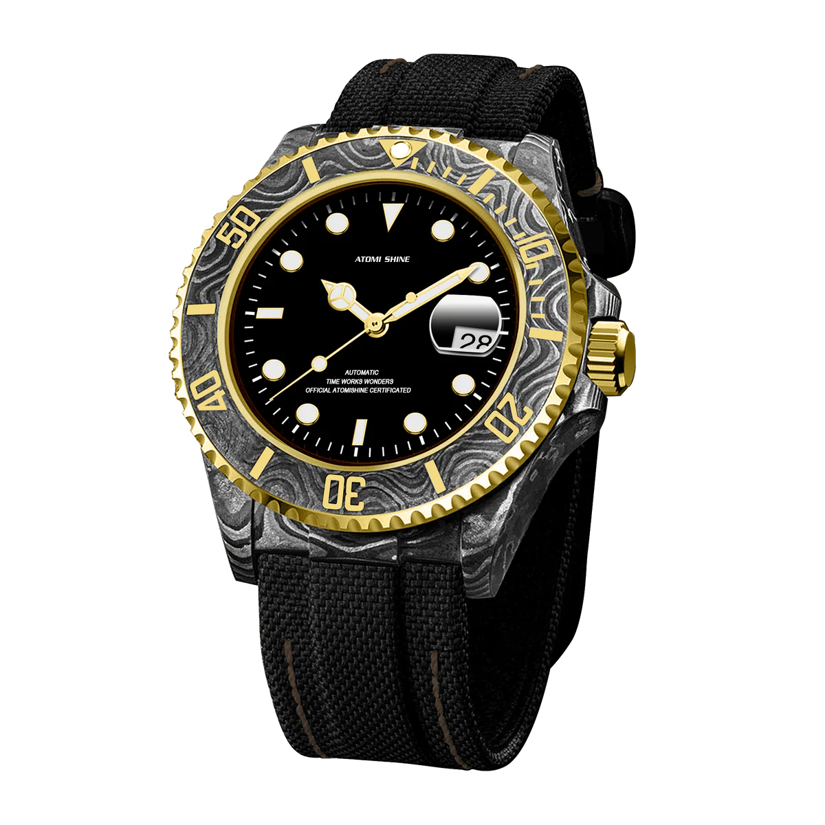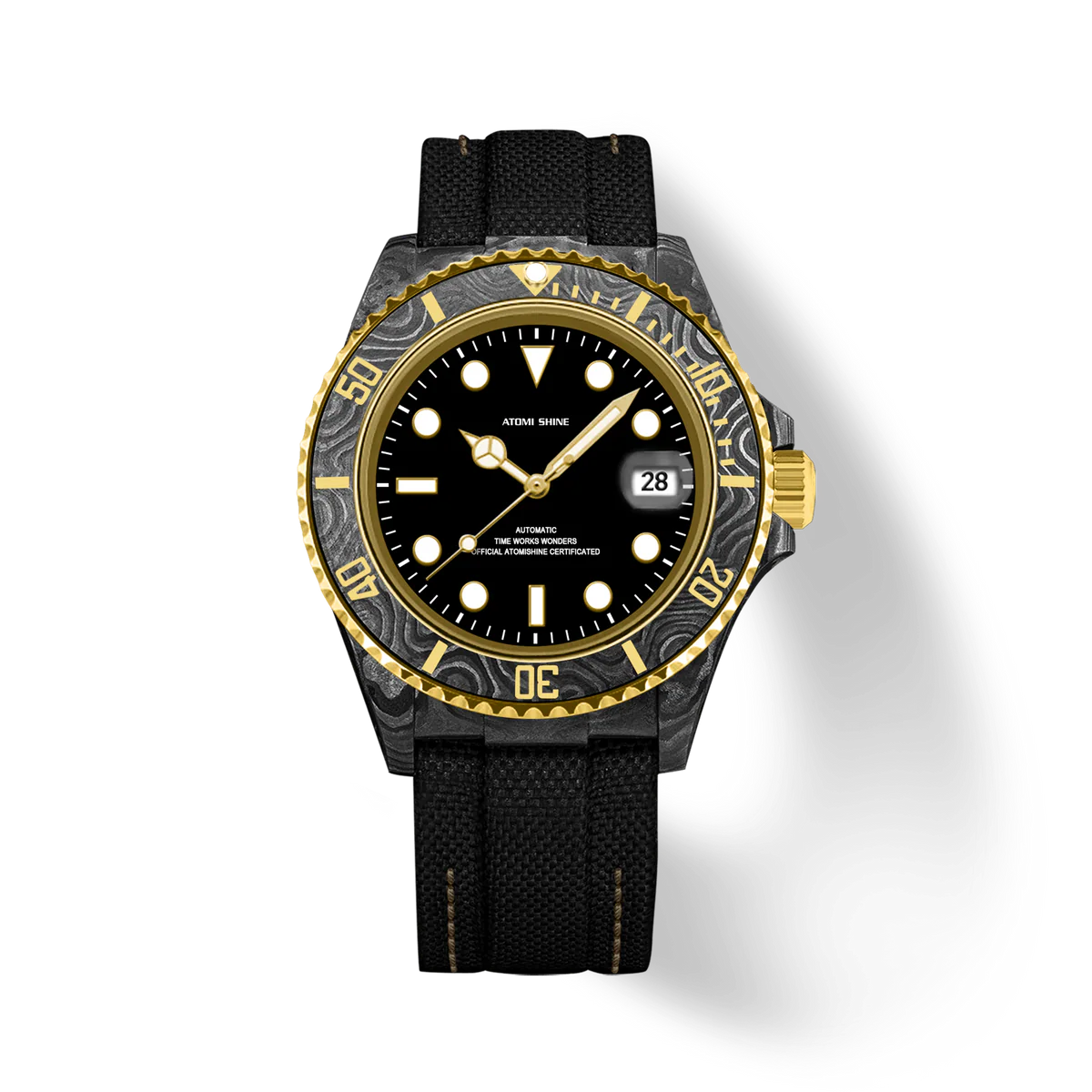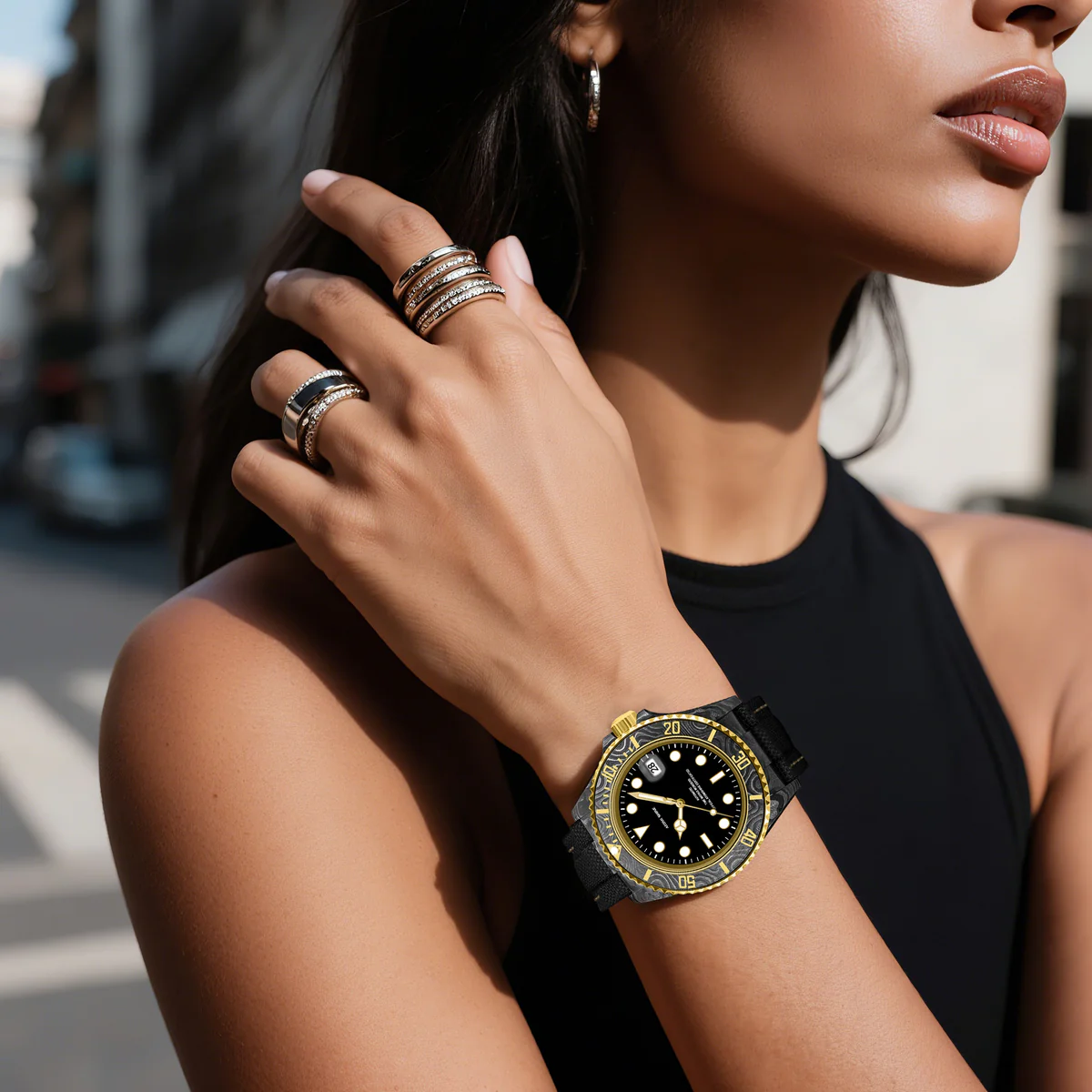 這款 40 毫米碳纖維腕錶兼具精準、耐用和輕巧的性能。重量僅 58 克,配備單向旋轉碳纖維錶圈,飾有金色標記和邊緣,搭配金色錶冠,展現精緻大膽的美感。搭載可靠的日本精工 NH35 自動機芯,確保精準耐用。黑色尼龍錶帶更添硬朗質感,將優雅與冒險完美融合。