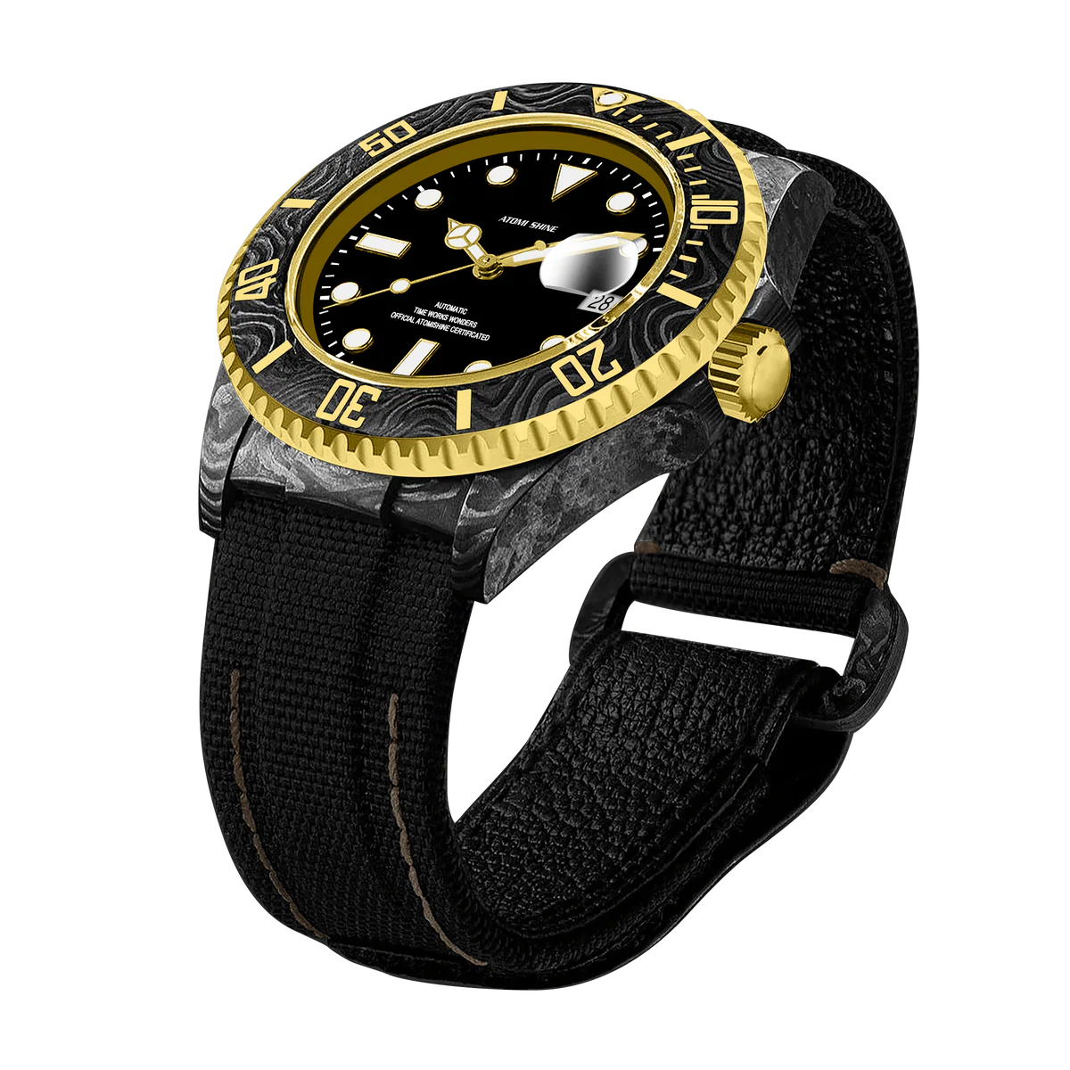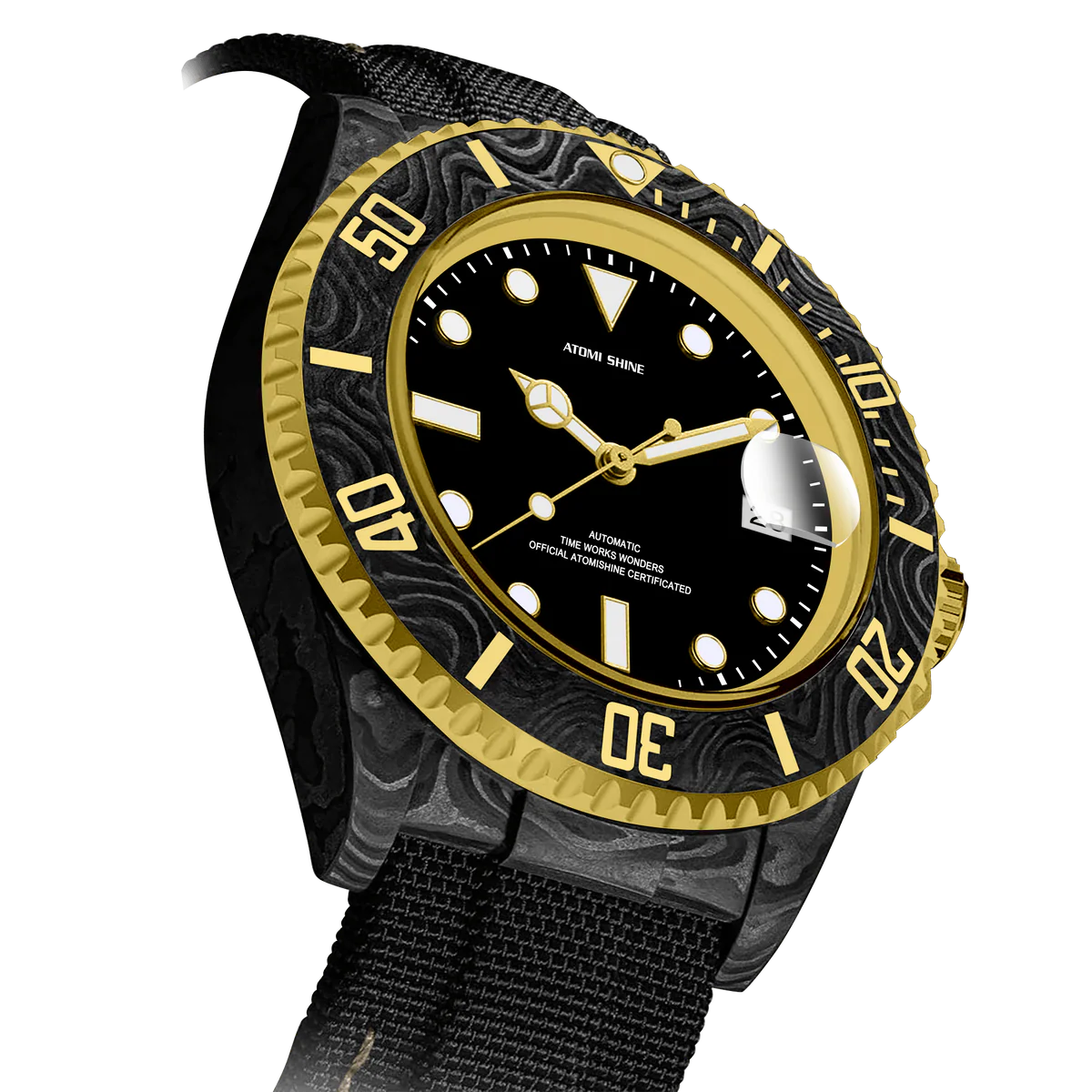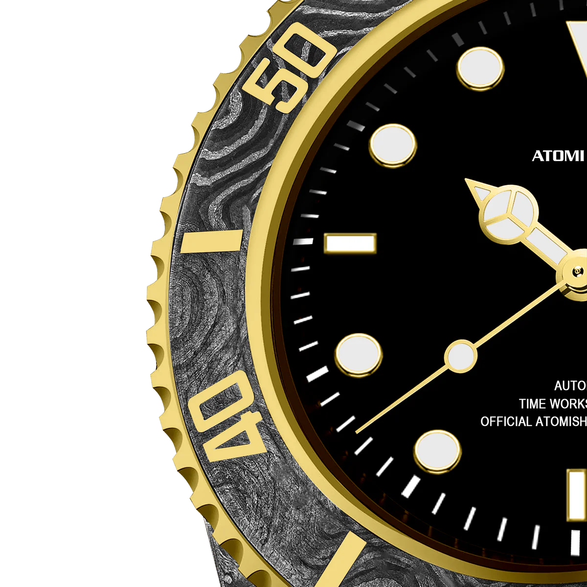 這款 40 毫米碳纖維腕錶兼具精準、耐用和輕巧的性能。重量僅 58 克,配備單向旋轉碳纖維錶圈,飾有金色標記和邊緣,搭配金色錶冠,展現精緻大膽的美感。搭載可靠的日本精工 NH35 自動機芯,確保精準耐用。黑色尼龍錶帶更添硬朗質感,將優雅與冒險完美融合。
