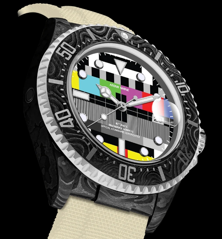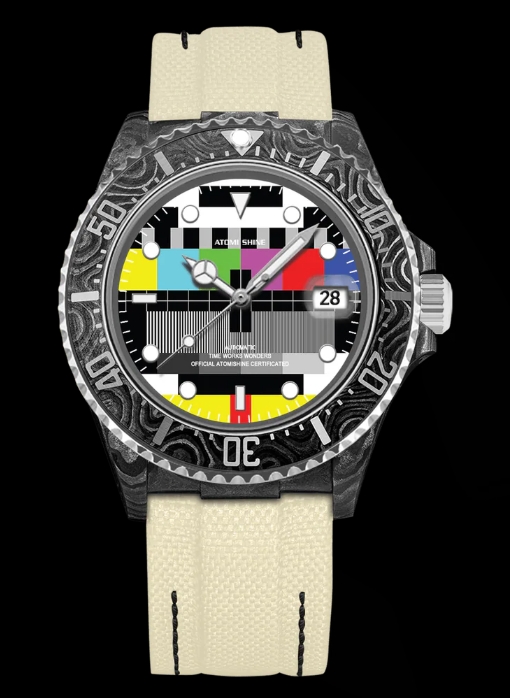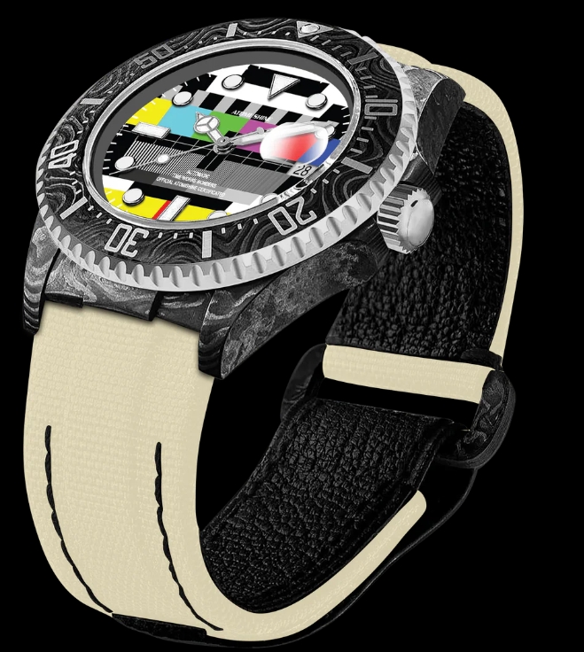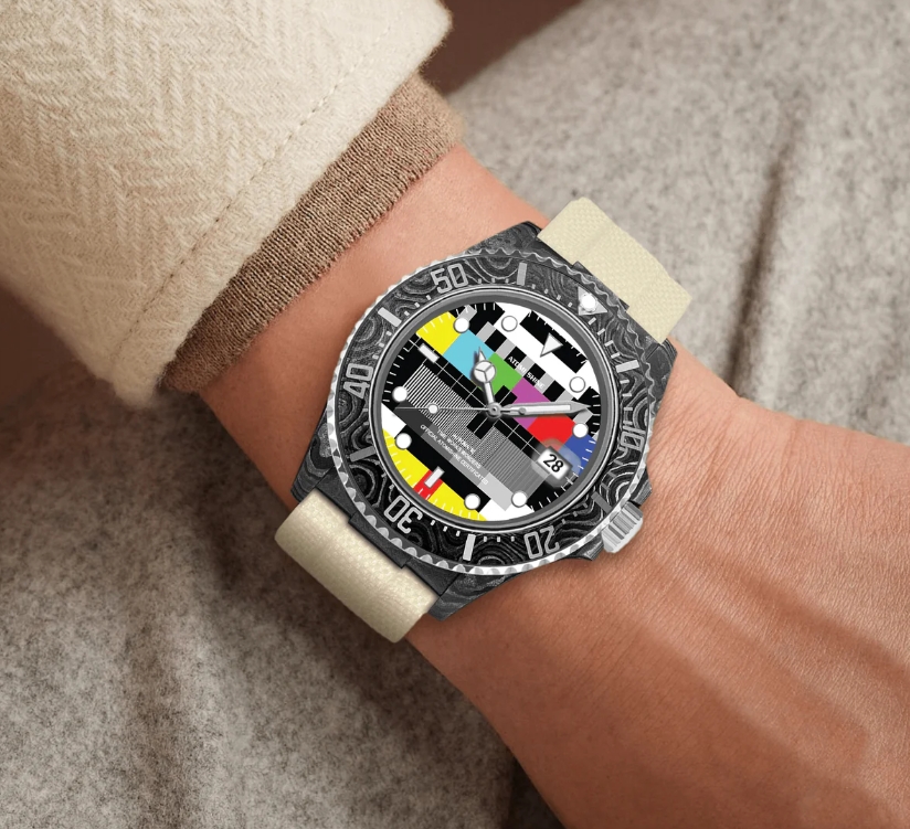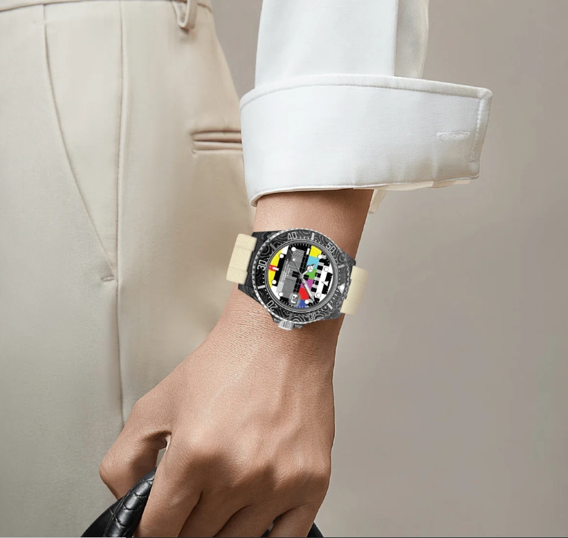 這款令人驚豔的腕錶採用航空級碳纖維錶殼和米色尼龍錶帶。錶盤飾有復古風格的馬賽克圖案,令人聯想到八九十年代電視上的靜電靜電。腕錶搭載自動上鍊機芯,配備日期顯示功能,並配有夜光琺瑯時標和指針,即使在黑暗中也能清晰可見。復古、精準與現代風格的完美融合。