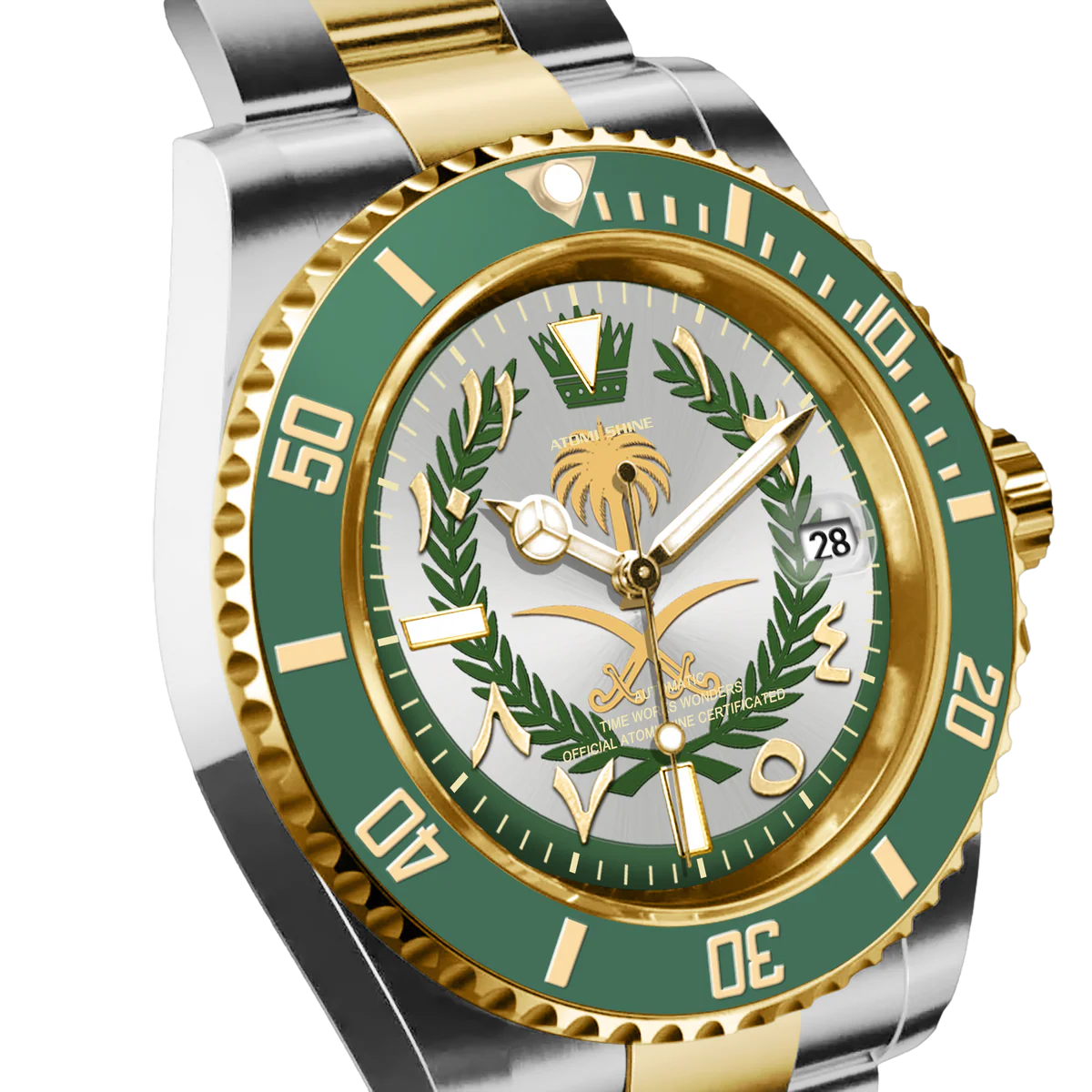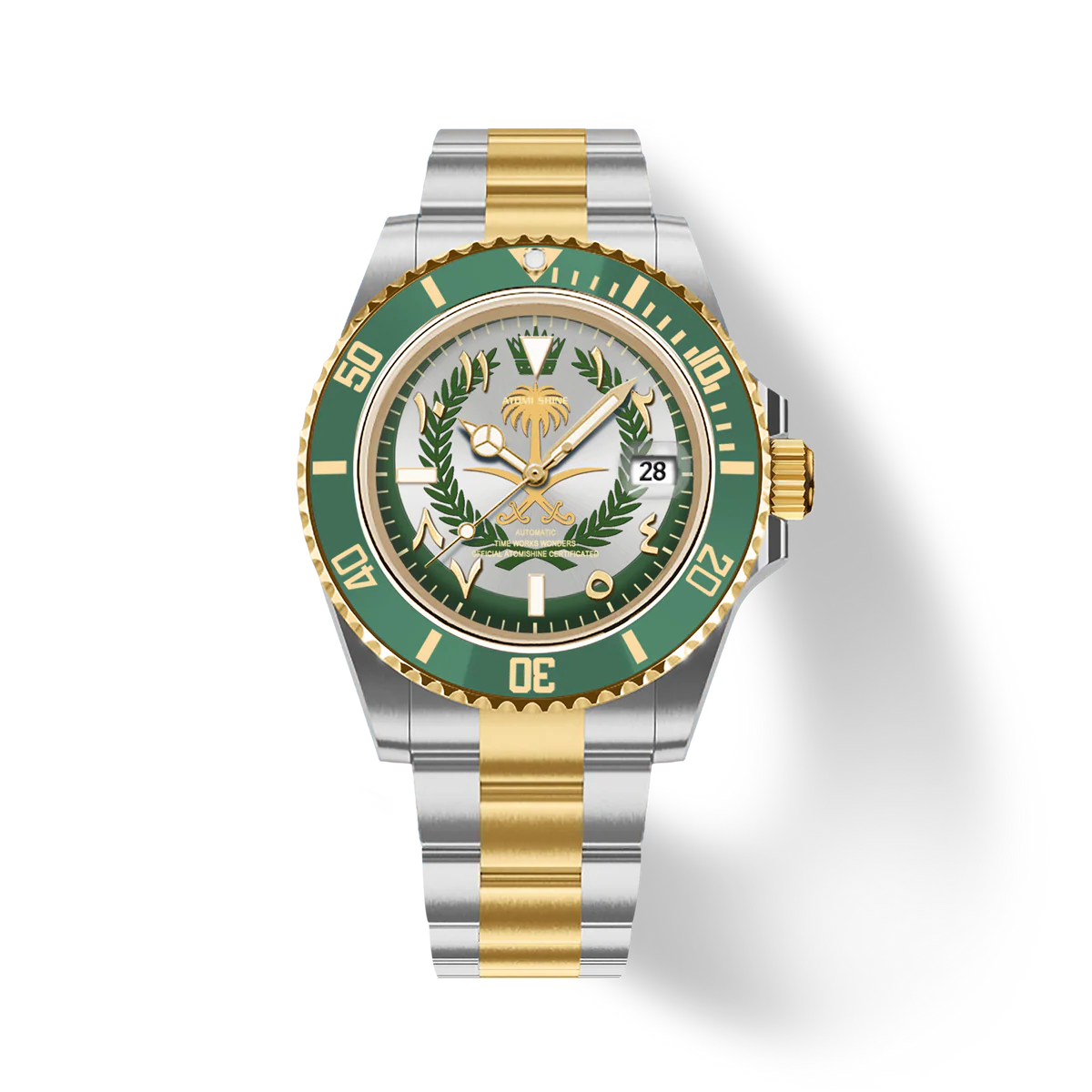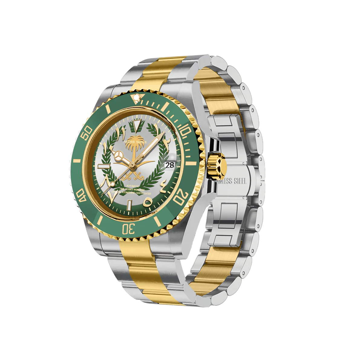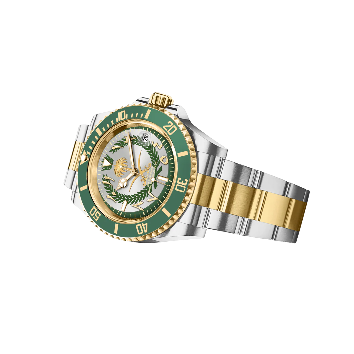 這款腕錶採用40毫米錶殼,採用優質316L不鏽鋼材質,並飾以銀金雙色飾面,兼具耐用性和精緻美感。單向旋轉的綠色錶圈飾以金色時標,彰顯品牌的悠久傳承和精準計時的精準度。腕錶搭載精工NH35自動上鍊機芯,以其可靠性和流暢的機械性能而聞名。錶盤大膽融入沙烏地阿拉伯國徽元素,象徵團結、傳統和力量。腕錶搭配與之相配的雙色錶鍊,每個細節都彰顯優雅氣質和文化自豪感。
