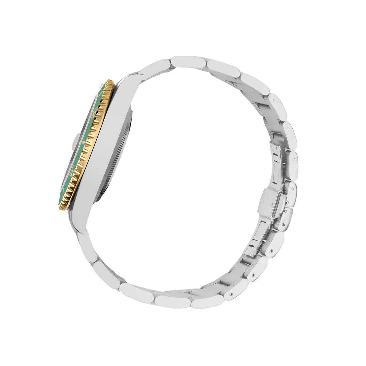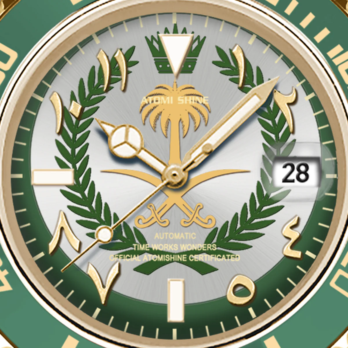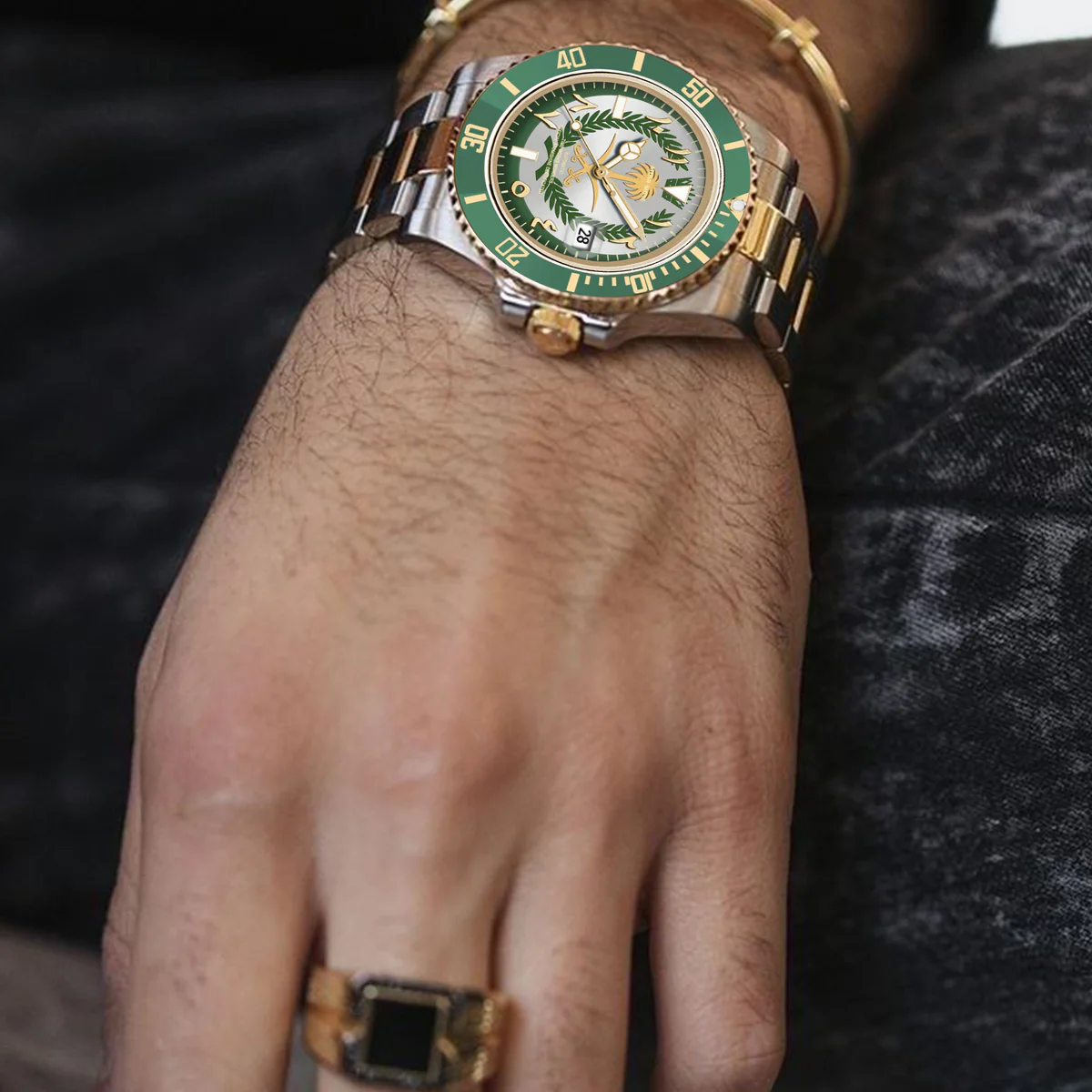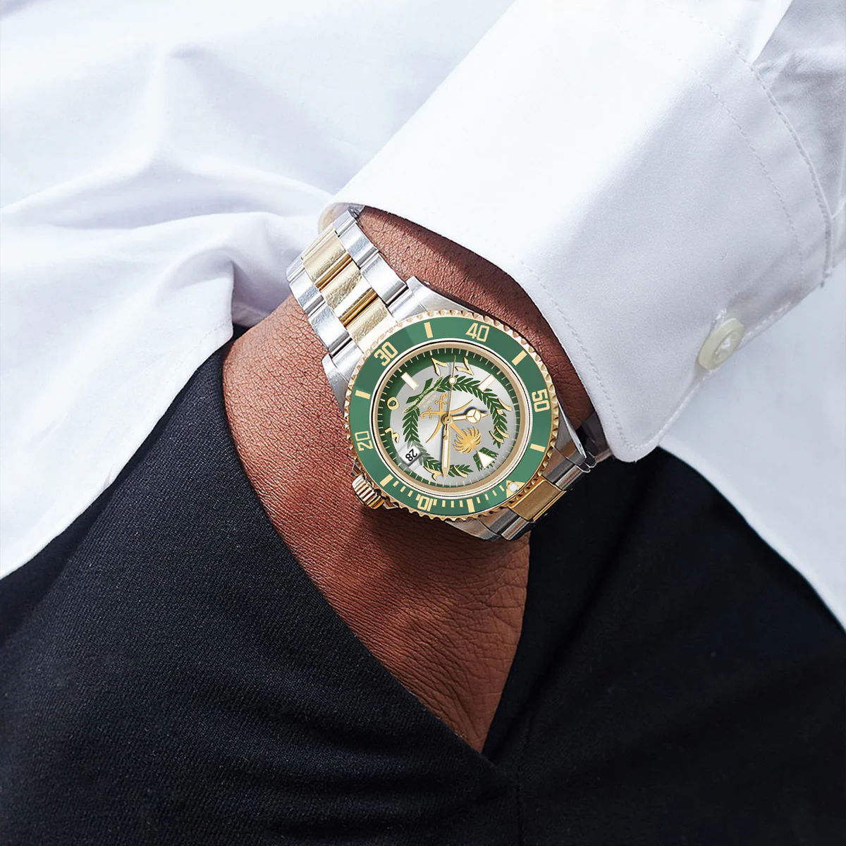 這款腕錶採用40毫米錶殼,採用優質316L不鏽鋼材質,並飾以銀金雙色飾面,兼具耐用性和精緻美感。單向旋轉的綠色錶圈飾以金色時標,彰顯品牌的悠久傳承和精準計時的精準度。腕錶搭載精工NH35自動上鍊機芯,以其可靠性和流暢的機械性能而聞名。錶盤大膽融入沙烏地阿拉伯國徽元素,象徵團結、傳統和力量。腕錶搭配與之相配的雙色錶鍊,每個細節都彰顯優雅氣質和文化自豪感。