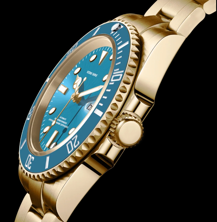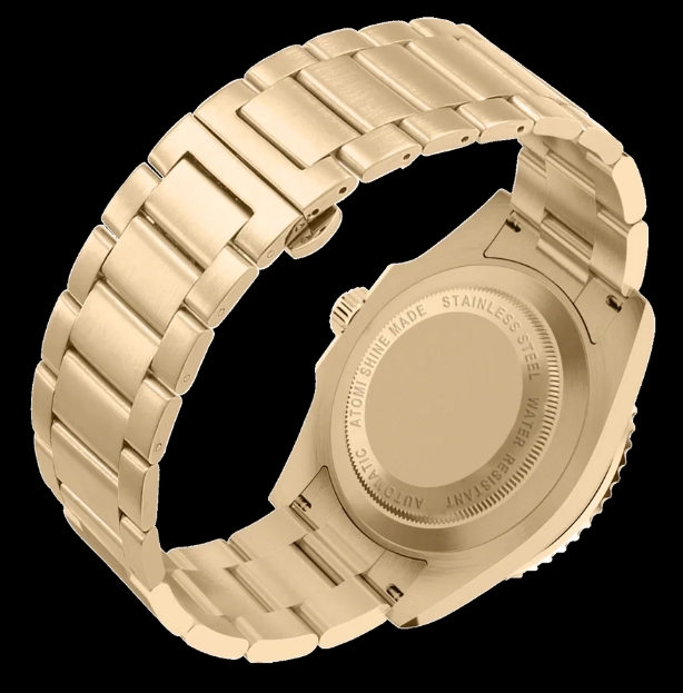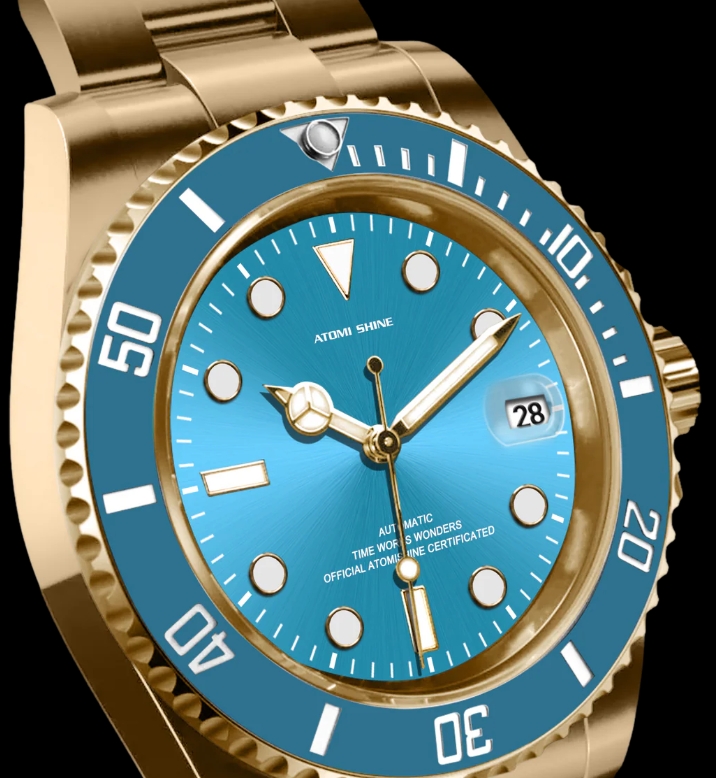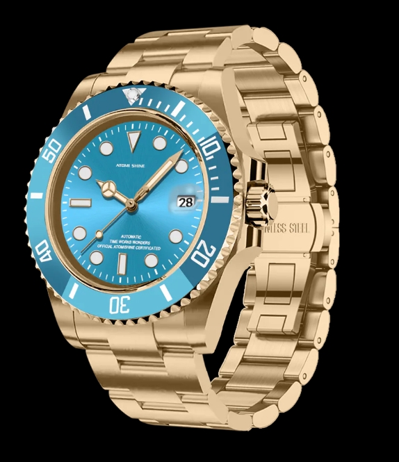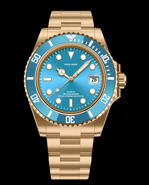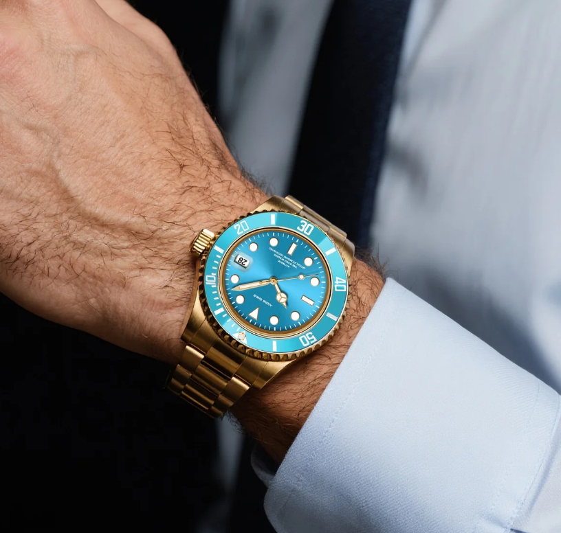 這款腕錶專為品味不凡的人士設計,搭配奢華的金色錶帶,散發著精緻優雅的氣息,百搭百搭,無論是正式場合還是休閒出遊,都能完美駕馭。柔和的淺藍色錶圈與錶盤形成靜謐的對比,將目光吸引至與之相配的淺藍色錶盤。這種低調而醒目的色彩組合,既營造出沉穩優雅的氛圍,又不失現代感。錶盤上方,時尚的指針顯示時間,方便一目了然,為這款復古風格的腕錶增添了一抹現代氣息。