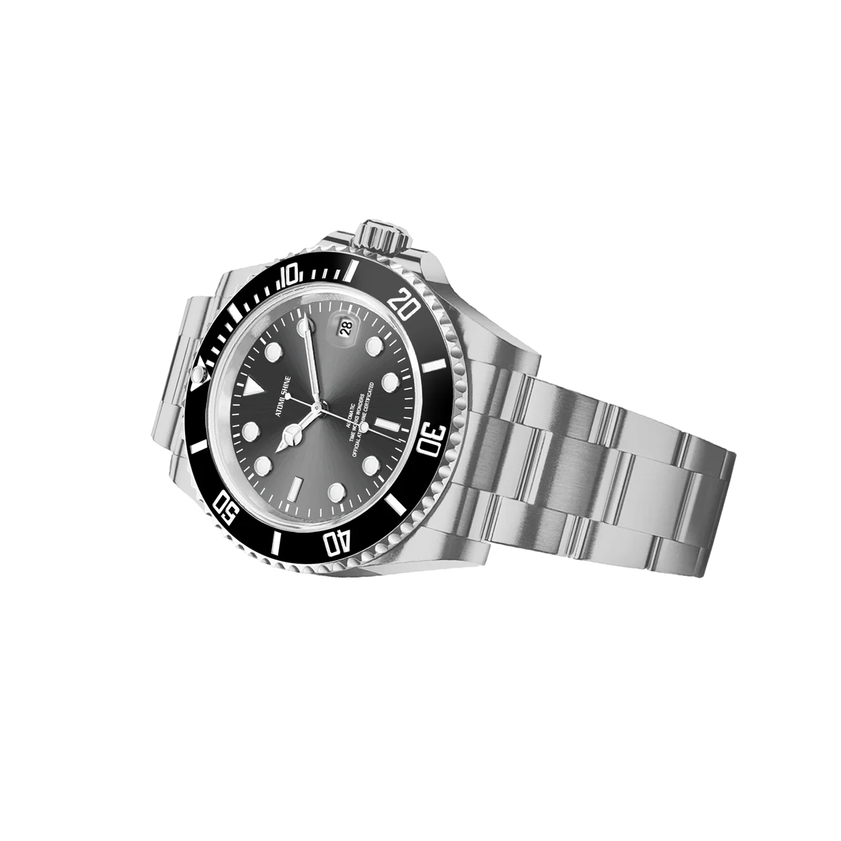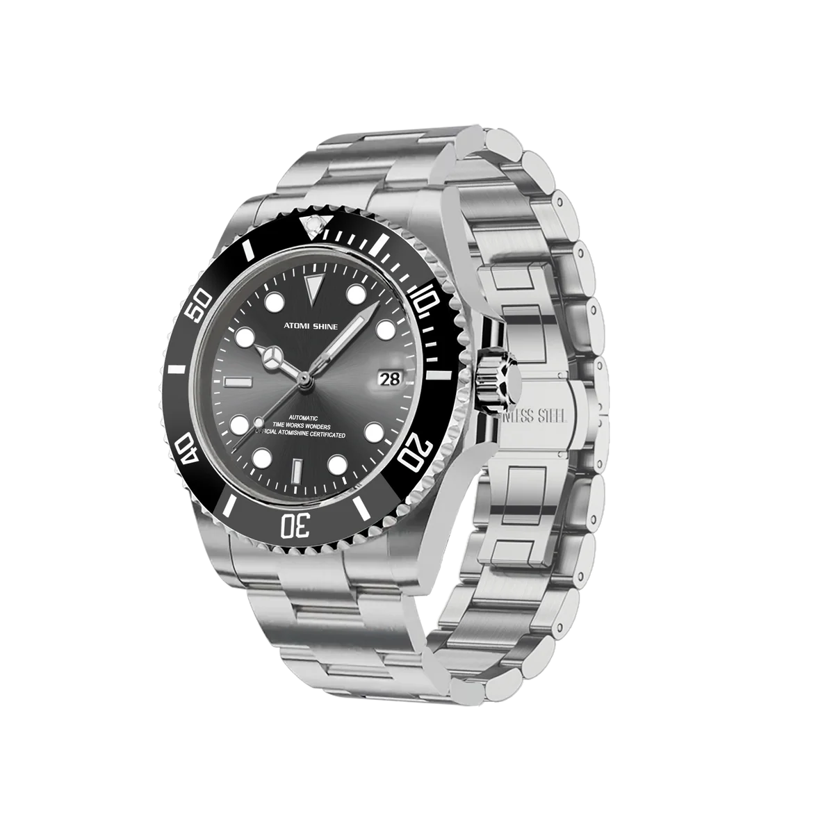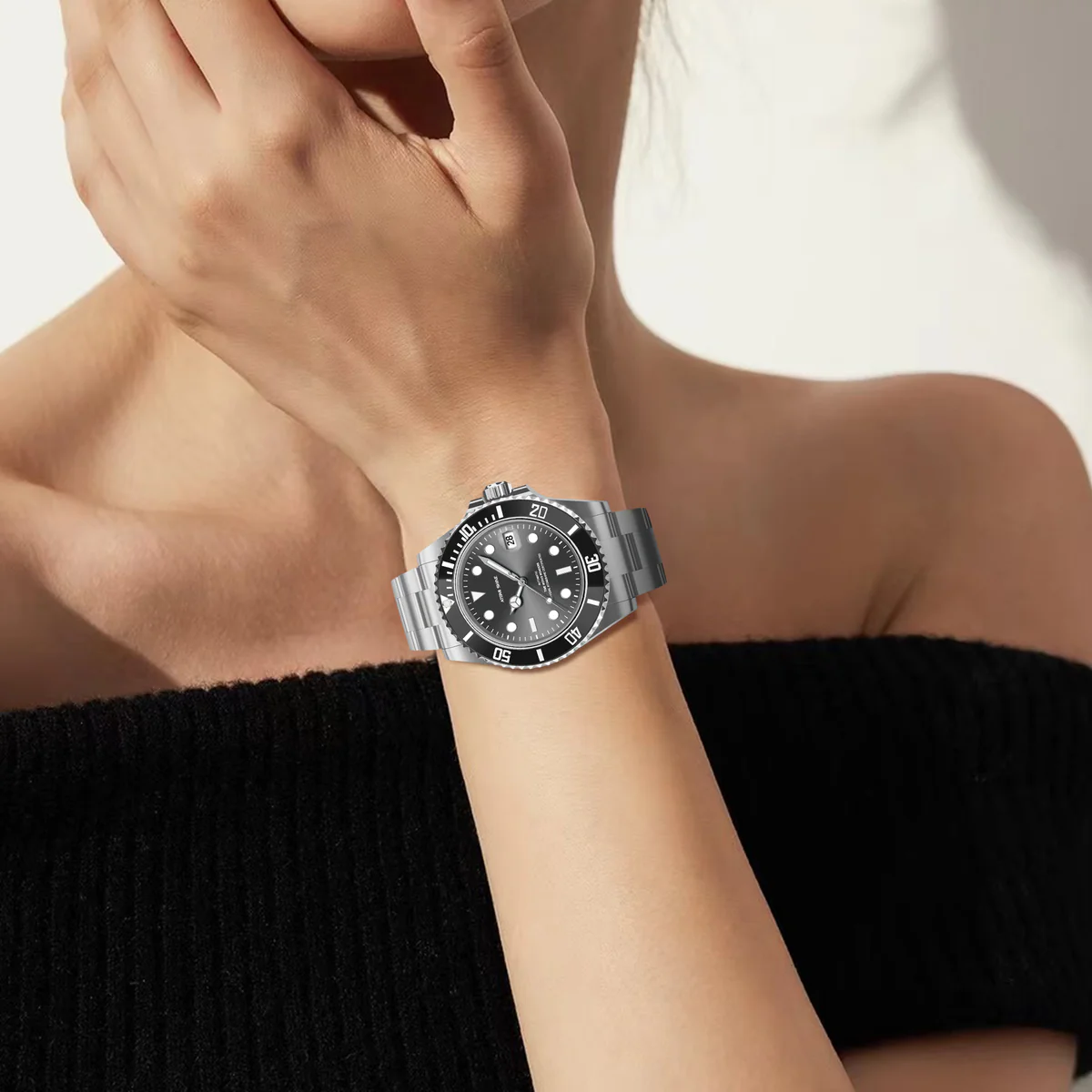 不鏽鋼錶殼和錶鍊彰顯力量,醒目的黑色錶圈環繞著太陽放射紋錶盤,每個角度都閃耀著璀璨光芒。醒目的時標和夜光指針確保在任何環境下清晰易讀,3點鐘位置的日期視窗則更顯實用功能。這款腕錶搭載自動上鍊機芯,防水性能卓越,展現深邃、耐用和雋永魅力。