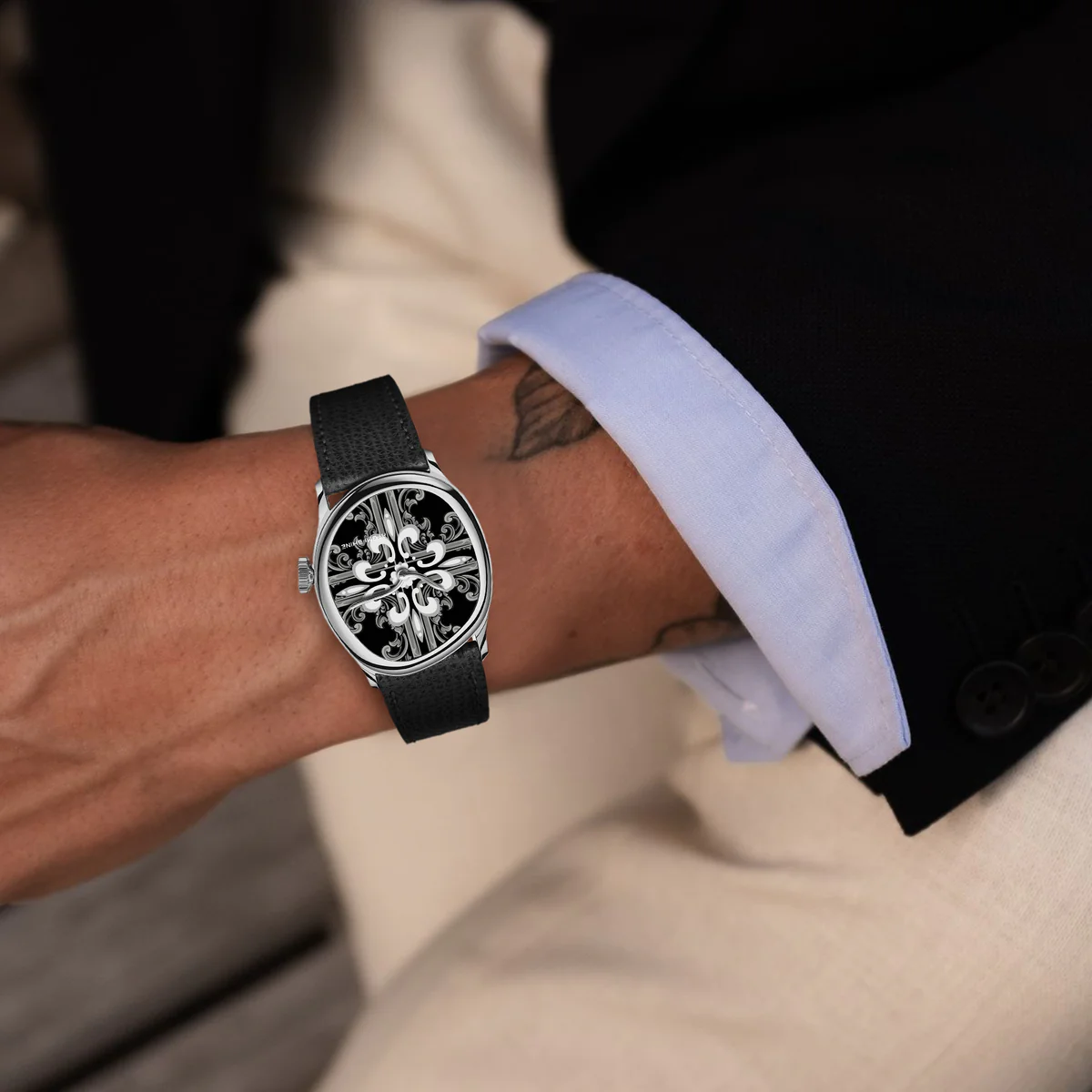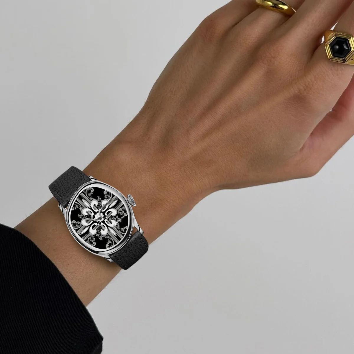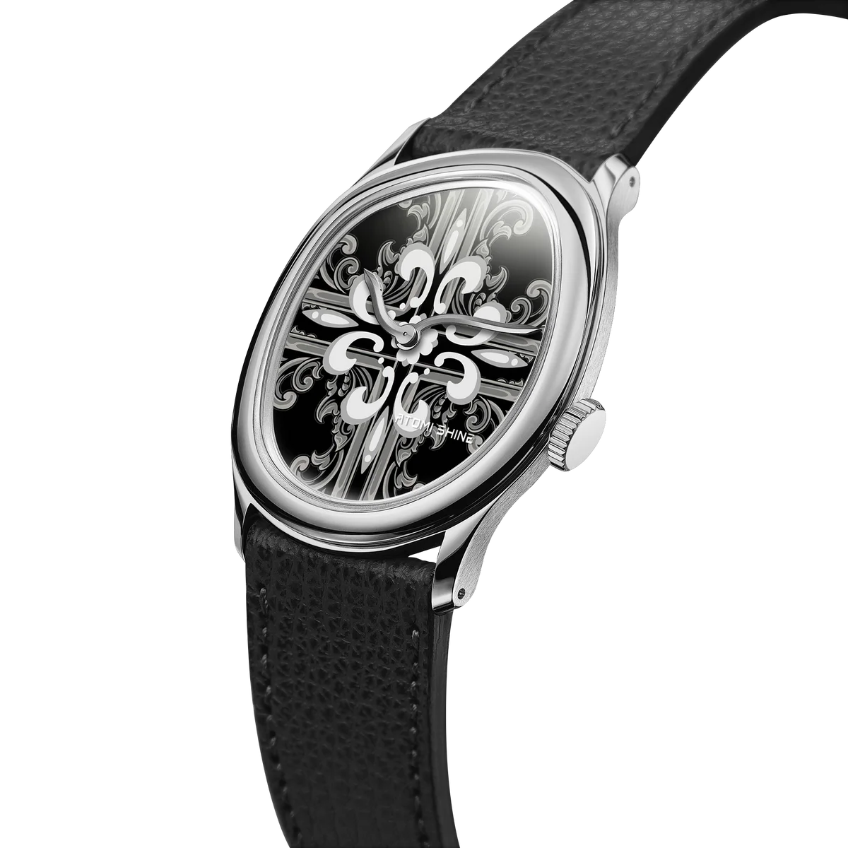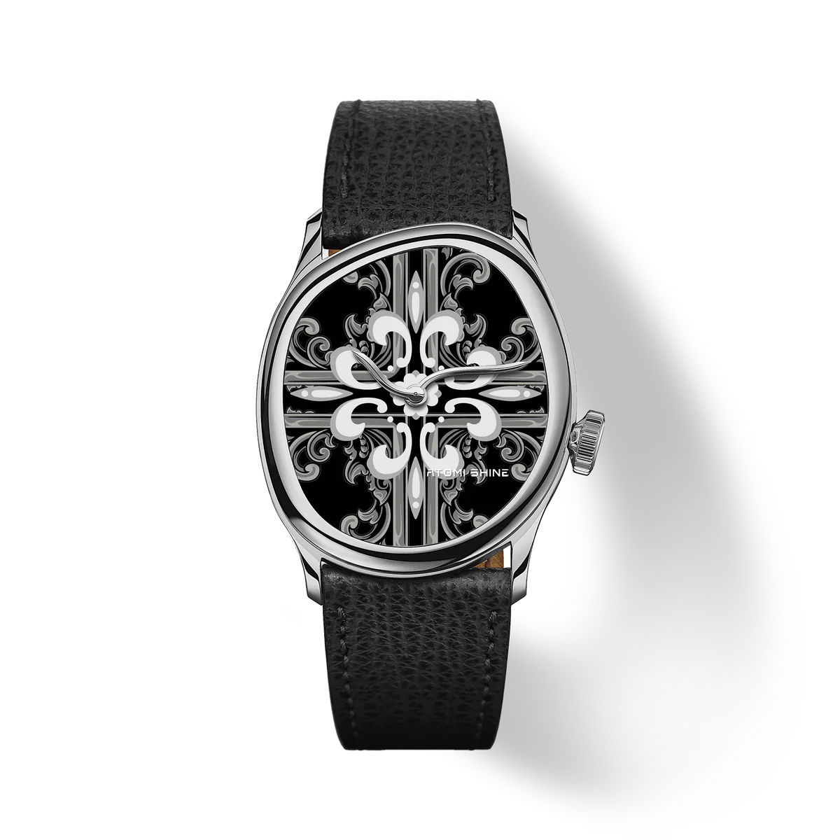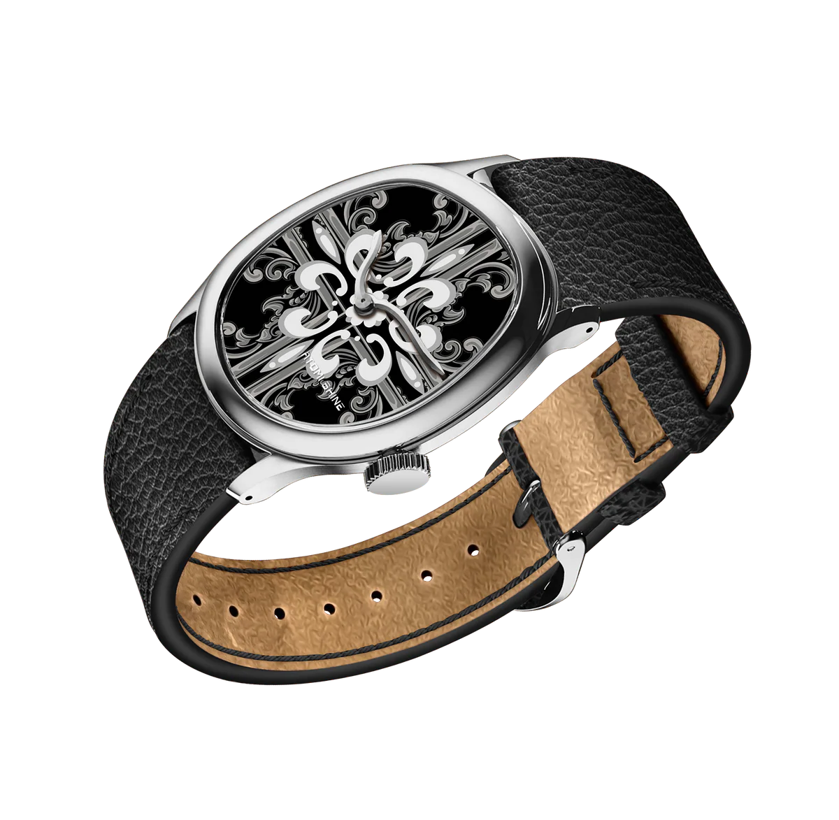 拋光銀錶殼環繞著墨黑色錶盤,迷人的十字架花卉圖案在銀灰色層層遞進間緩緩展開。鏡面對稱的設計令人聯想到大教堂窗戶和貴族徽章的神秘感,營造出既莊嚴又神秘的視覺效果。