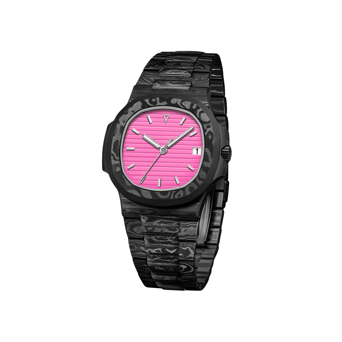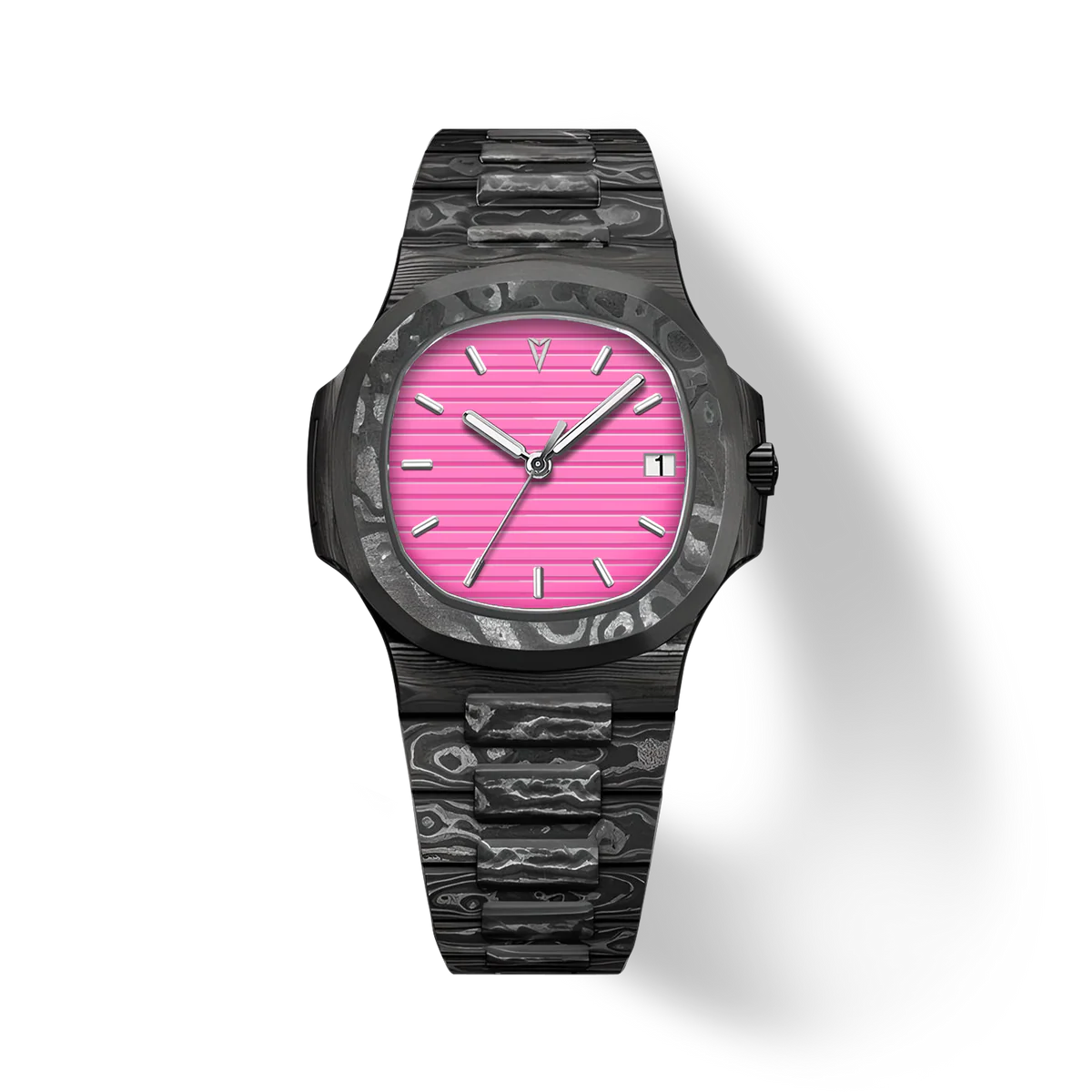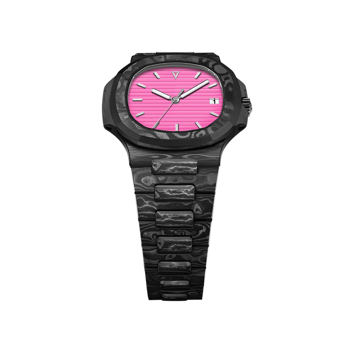 TechNautic系列採用全碳纖維錶殼和錶帶,兼具卓越強度和輕盈設計,重新定義了性能與風格。腕錶採用醒目的船形錶圈,靈感源自經典航海元素,而活力四射的亮粉色錶盤則更顯大膽動感。錶盤的浮雕紋理模仿海洋的漣漪,更顯其視覺衝擊力。這款腕錶配備日期顯示,並搭載自動上鍊機芯,確保精準可靠的計時。