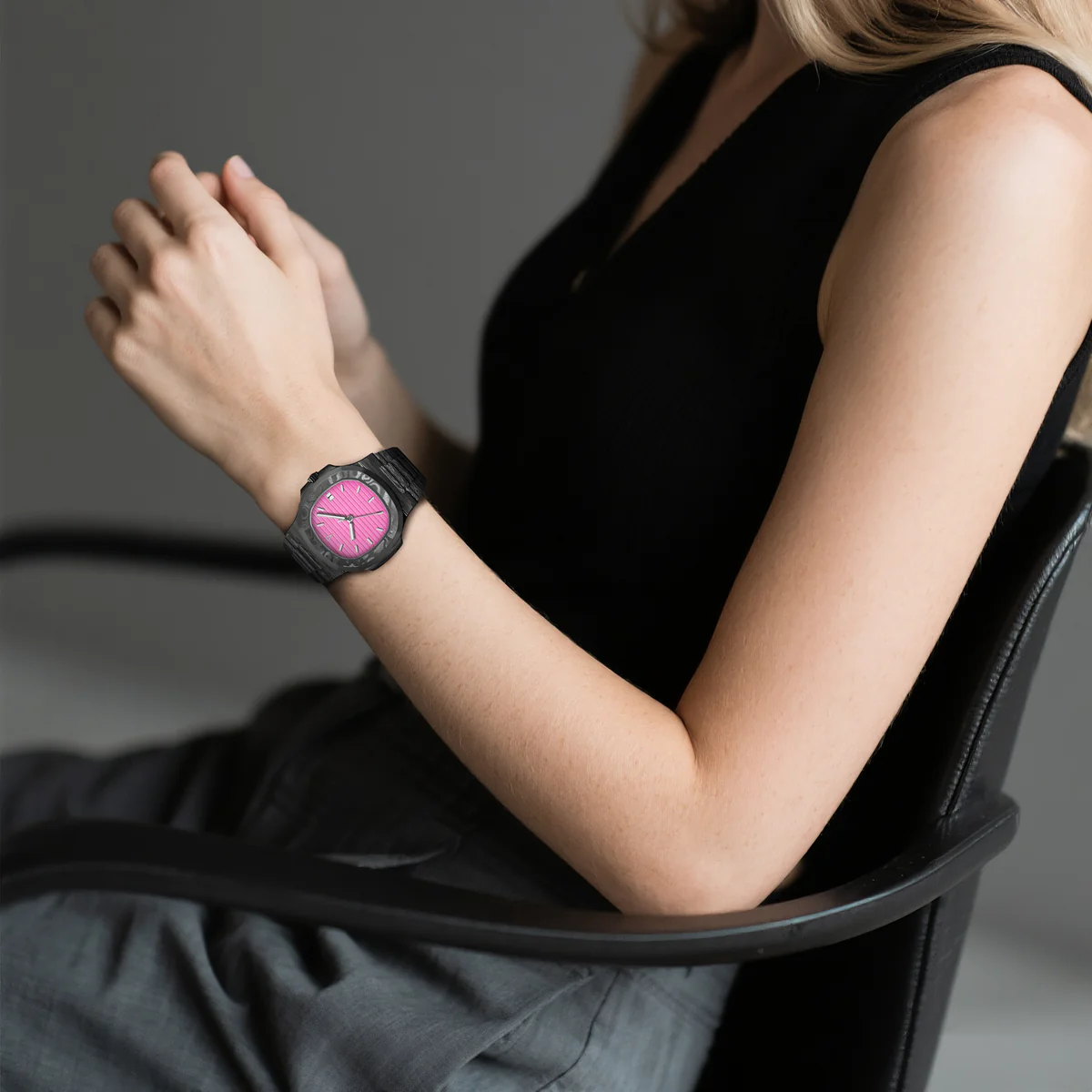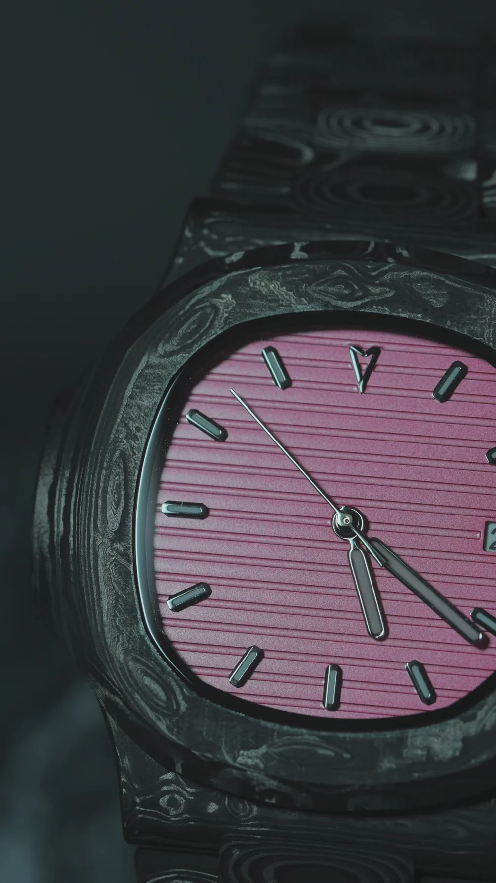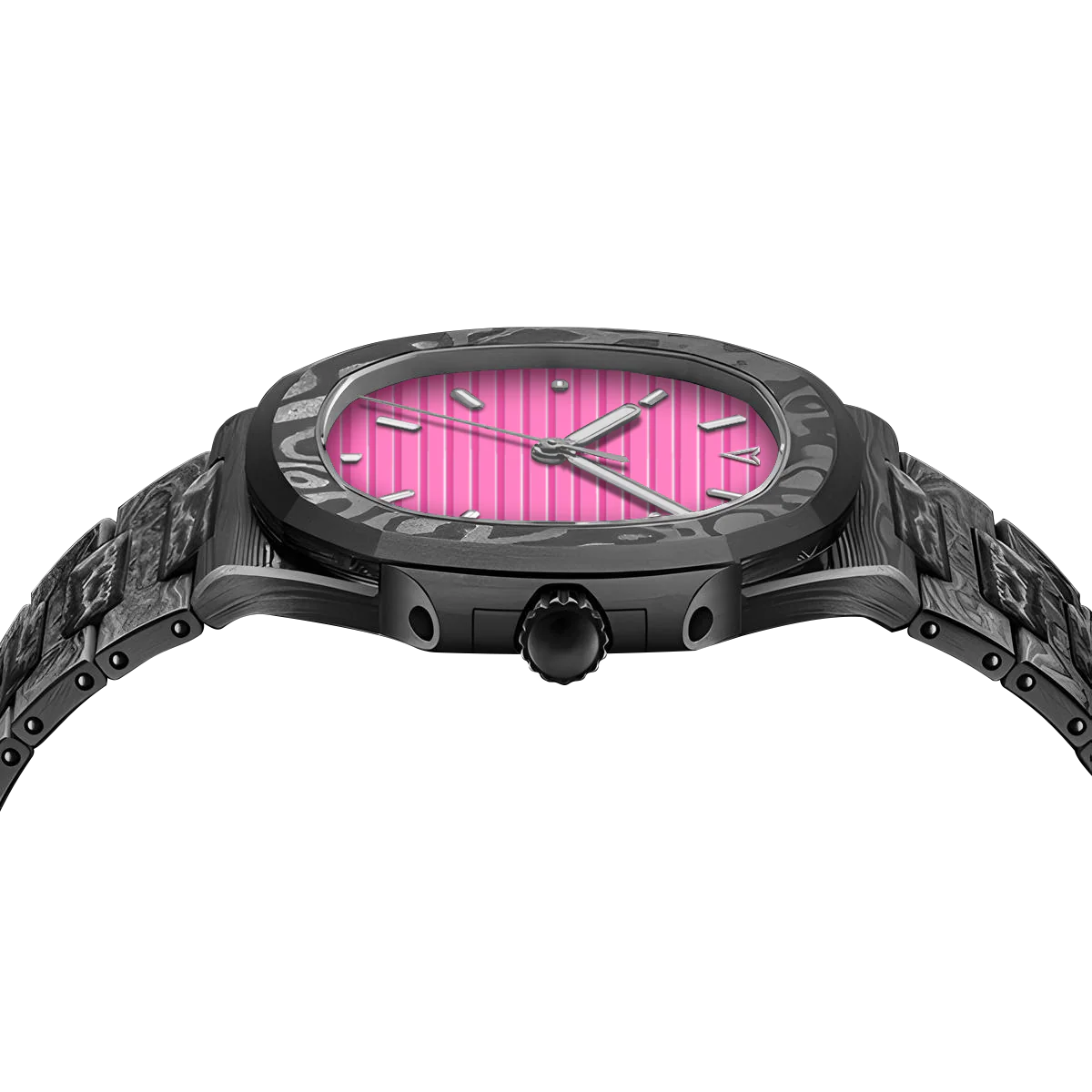 TechNautic系列採用全碳纖維錶殼和錶帶,兼具卓越強度和輕盈設計,重新定義了性能與風格。腕錶採用醒目的船形錶圈,靈感源自經典航海元素,而活力四射的亮粉色錶盤則更顯大膽動感。錶盤的浮雕紋理模仿海洋的漣漪,更顯其視覺衝擊力。這款腕錶配備日期顯示,並搭載自動上鍊機芯,確保精準可靠的計時。