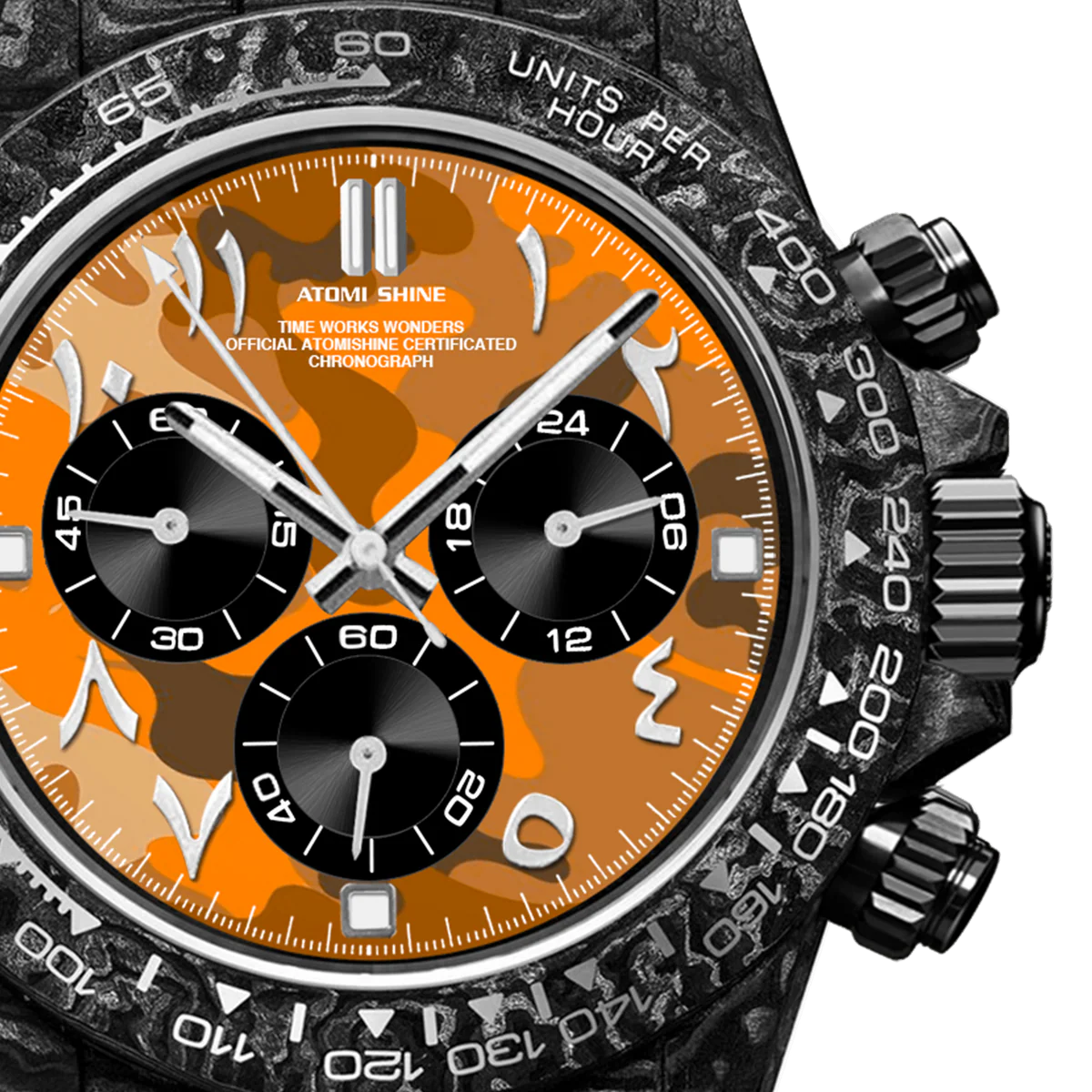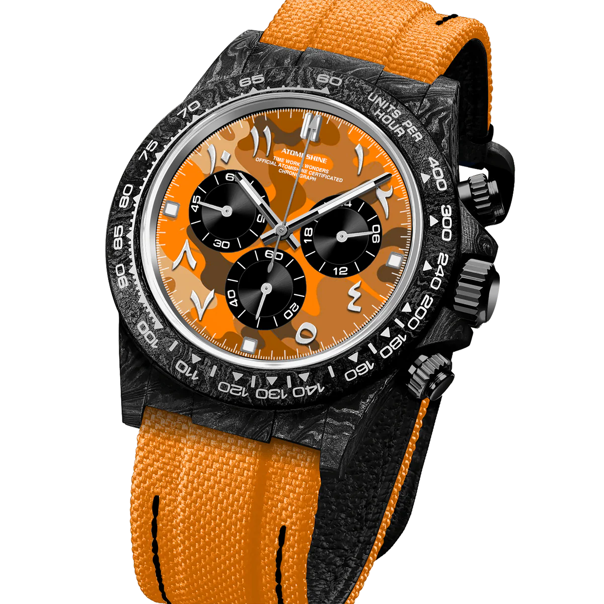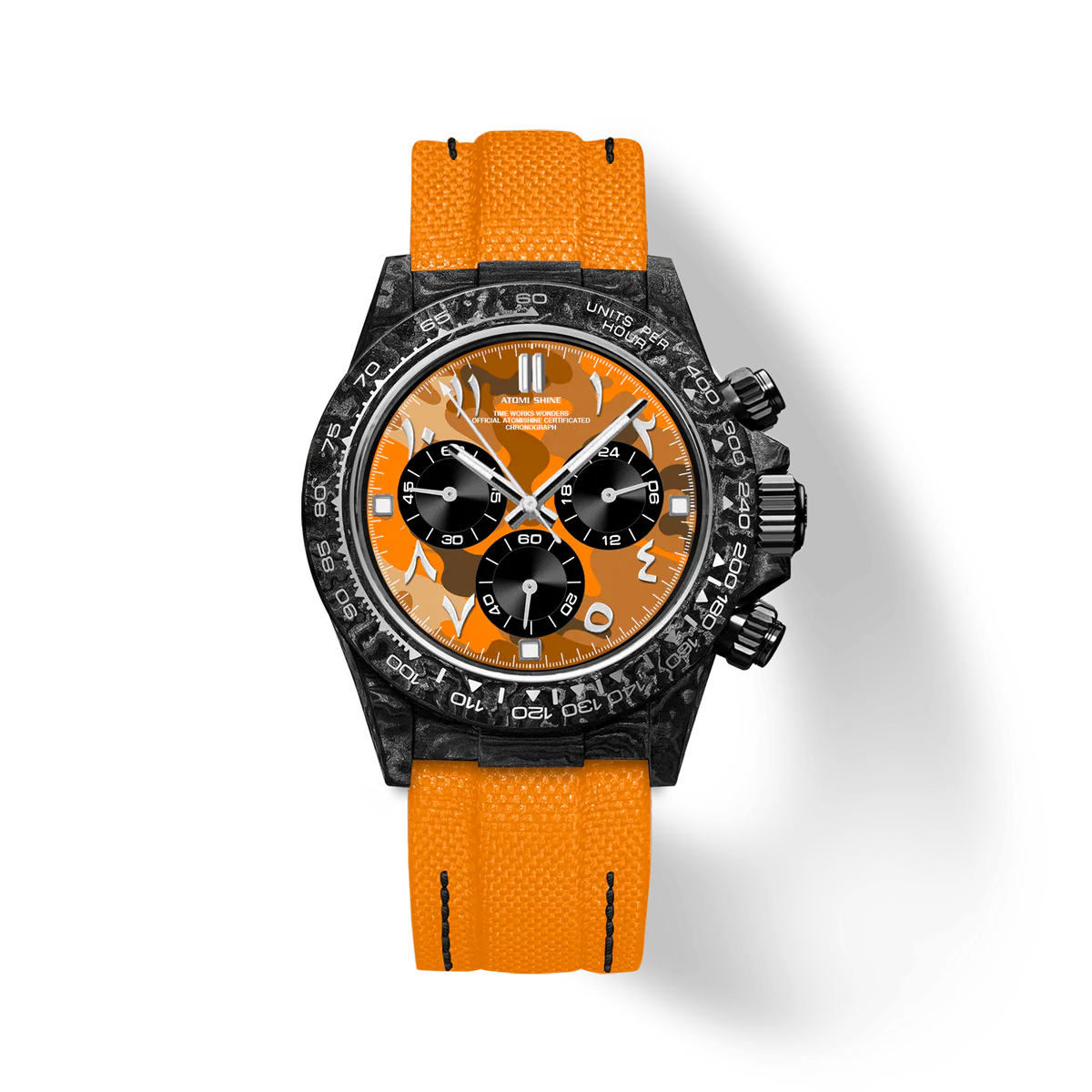 這款碳纖維計時腕錶兼具性能與時尚,僅重 37 克,輕盈舒適,適合全天佩戴。大膽的迷彩錶盤更添冒險氣息,搭配黑色縫線的橘色尼龍錶帶更添驚人美感。精密計時機芯專為運動員和探險家設計,確保分秒精準。是耐用性、速度和無畏能量的象徵。