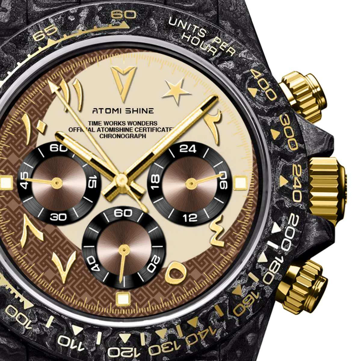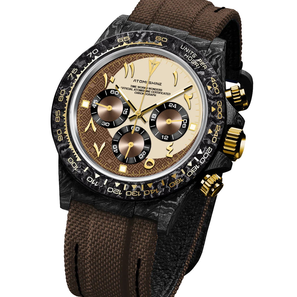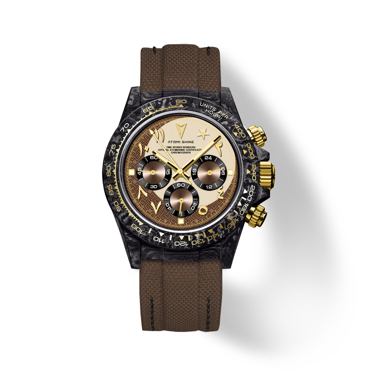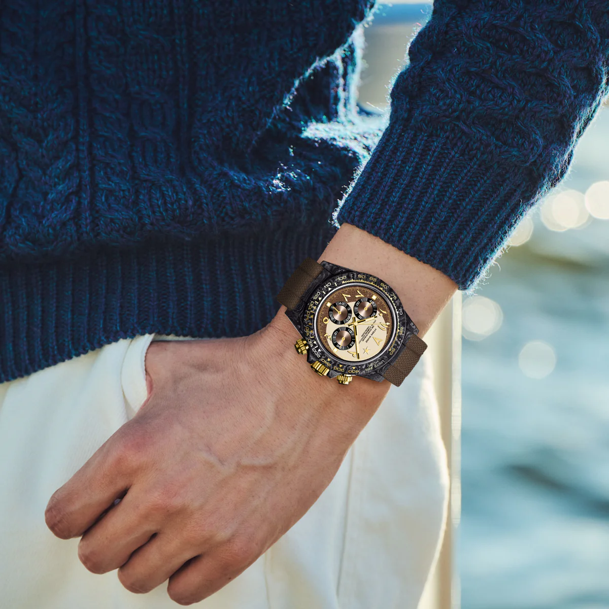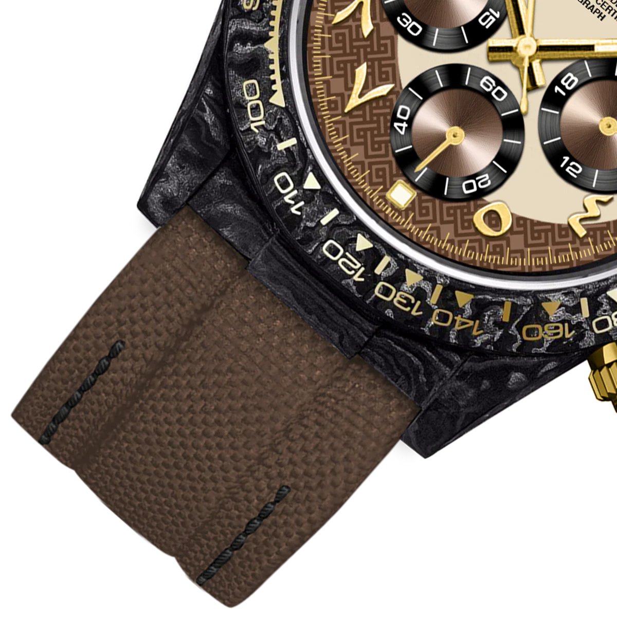 棕色尼龍錶帶與輕盈的黑色碳纖維錶殼渾然一體,金色按鈕和錶冠更添奢華氣息。錶盤上設有三個計時小錶盤,環繞著一彎深棕色新月,1點鐘位置則點綴著一顆璀璨的星辰,令人聯想到沙漠之夜和金色地平線的壯麗景色。這款腕錶具有精湛的細節和溫暖的色調,既是精密儀器,也是藝術品。