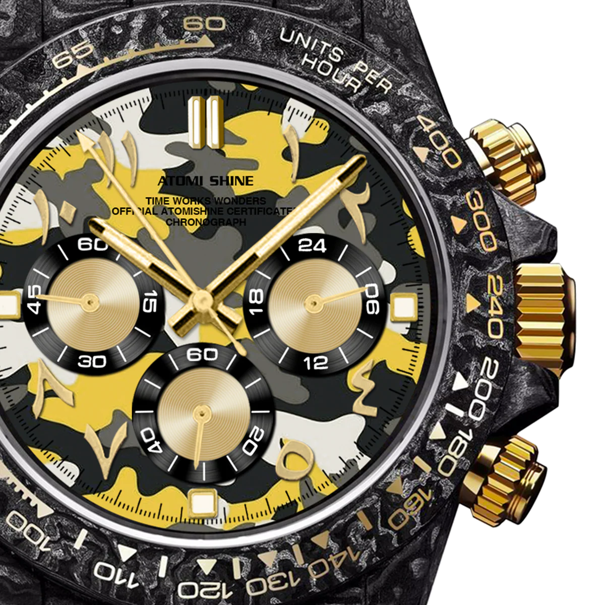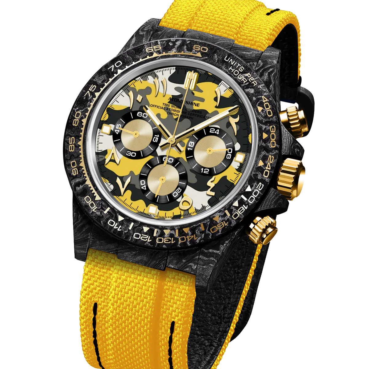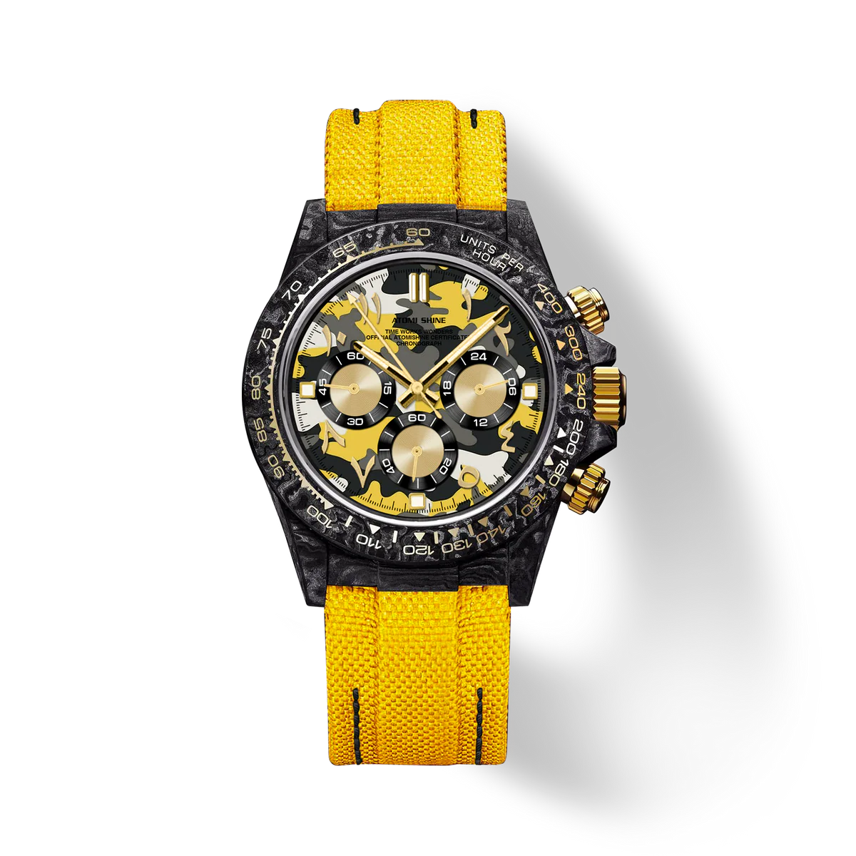這款39毫米計時碼錶將戰術設計與街頭美學融為一體。輕盈的碳纖維錶殼搭配鮮豔的黃色尼龍錶帶,耐用,對比鮮明。錶盤採用醒目的黃、灰、黑、白四色迷彩圖案,營造出動感與現代活力。金色指針更添精緻,部分時標(124578、10和11)則採用阿拉伯數字,彰顯大膽的文化氣息。 12、3、6和9點鐘位置覆有夜光琺瑯,確保夜間清晰可見。這款腕錶搭載可靠的Miyota OS20石英計時機芯,專為那些以精準、強勁和獨特風格穿梭於世界各地的人士而設計。