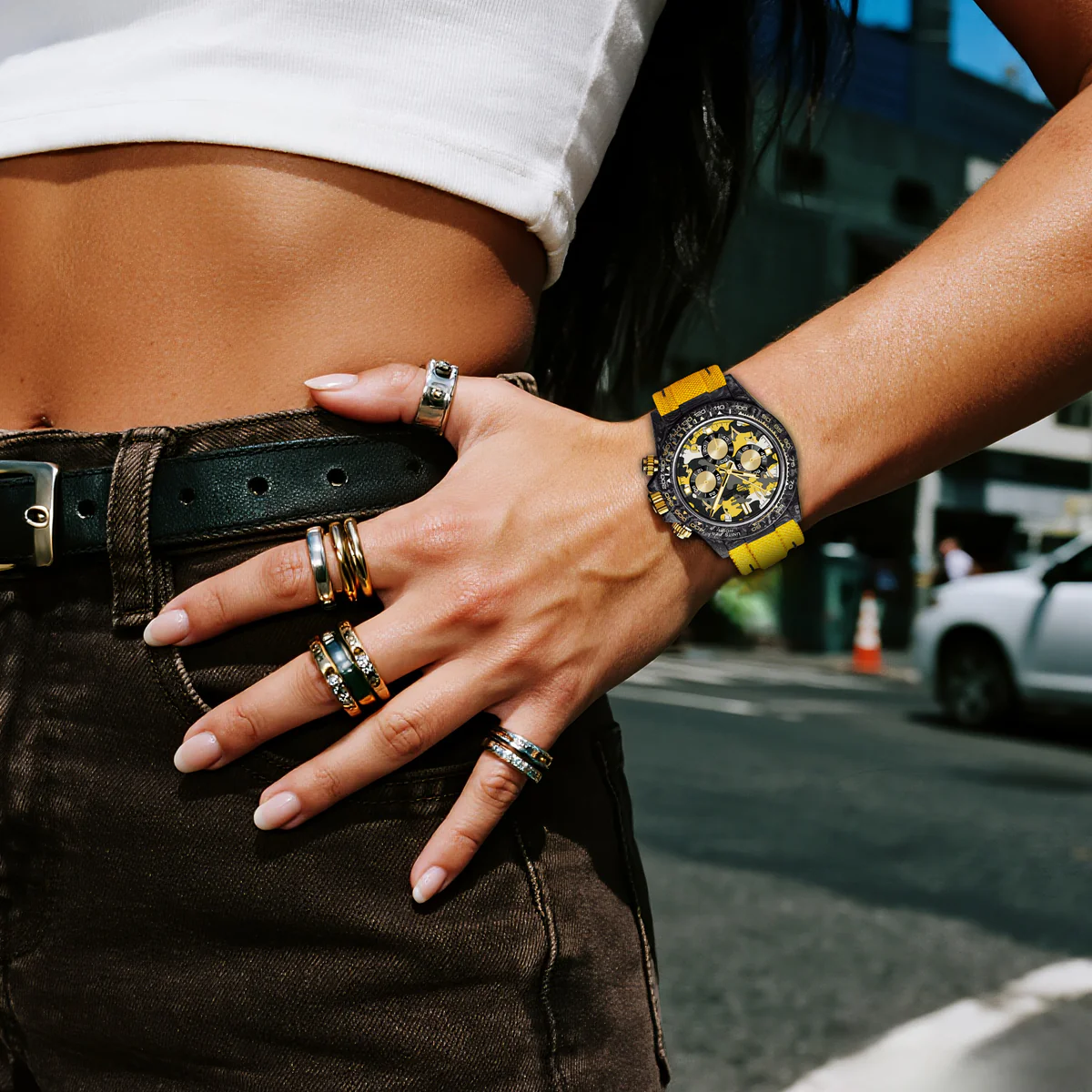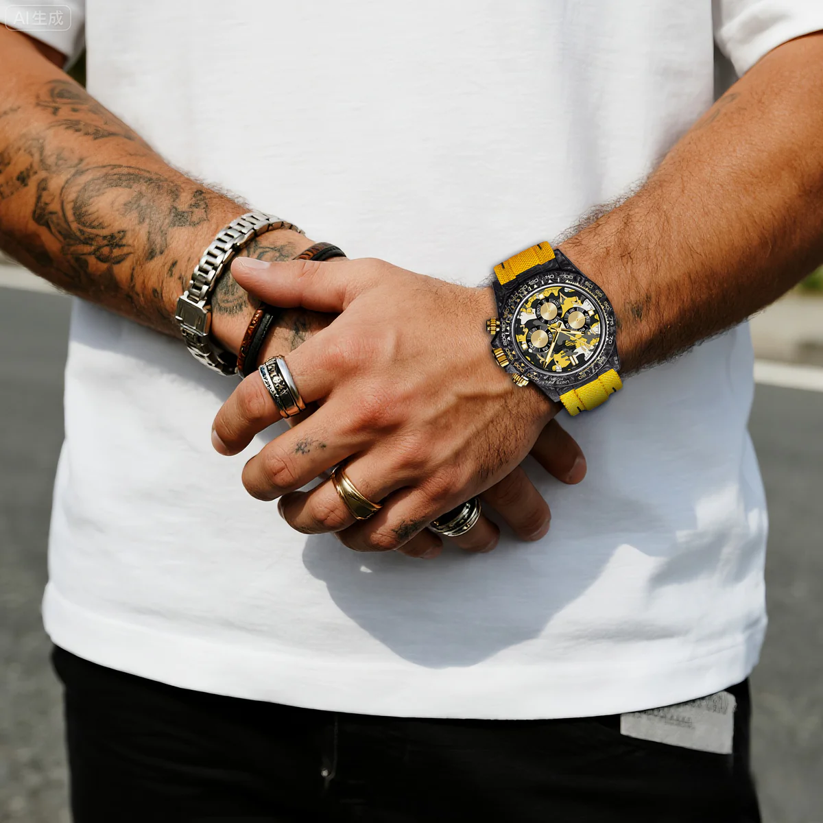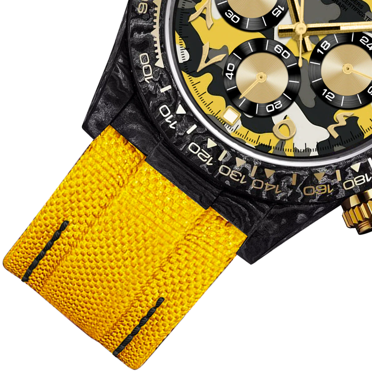 這款39毫米計時碼錶將戰術設計與街頭美學融為一體。輕盈的碳纖維錶殼搭配鮮豔的黃色尼龍錶帶,耐用,對比鮮明。錶盤採用醒目的黃、灰、黑、白四色迷彩圖案,營造出動感與現代活力。金色指針更添精緻,部分時標(124578、10和11)則採用阿拉伯數字,彰顯大膽的文化氣息。 12、3、6和9點鐘位置覆有夜光琺瑯,確保夜間清晰可見。這款腕錶搭載可靠的Miyota OS20石英計時機芯,專為那些以精準、強勁和獨特風格穿梭於世界各地的人士而設計。