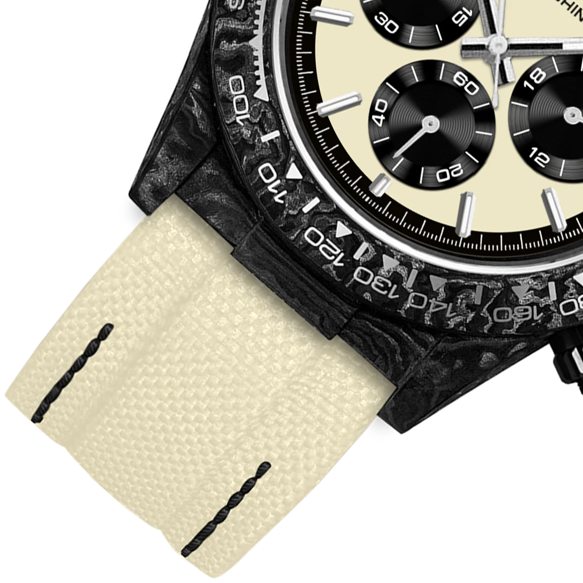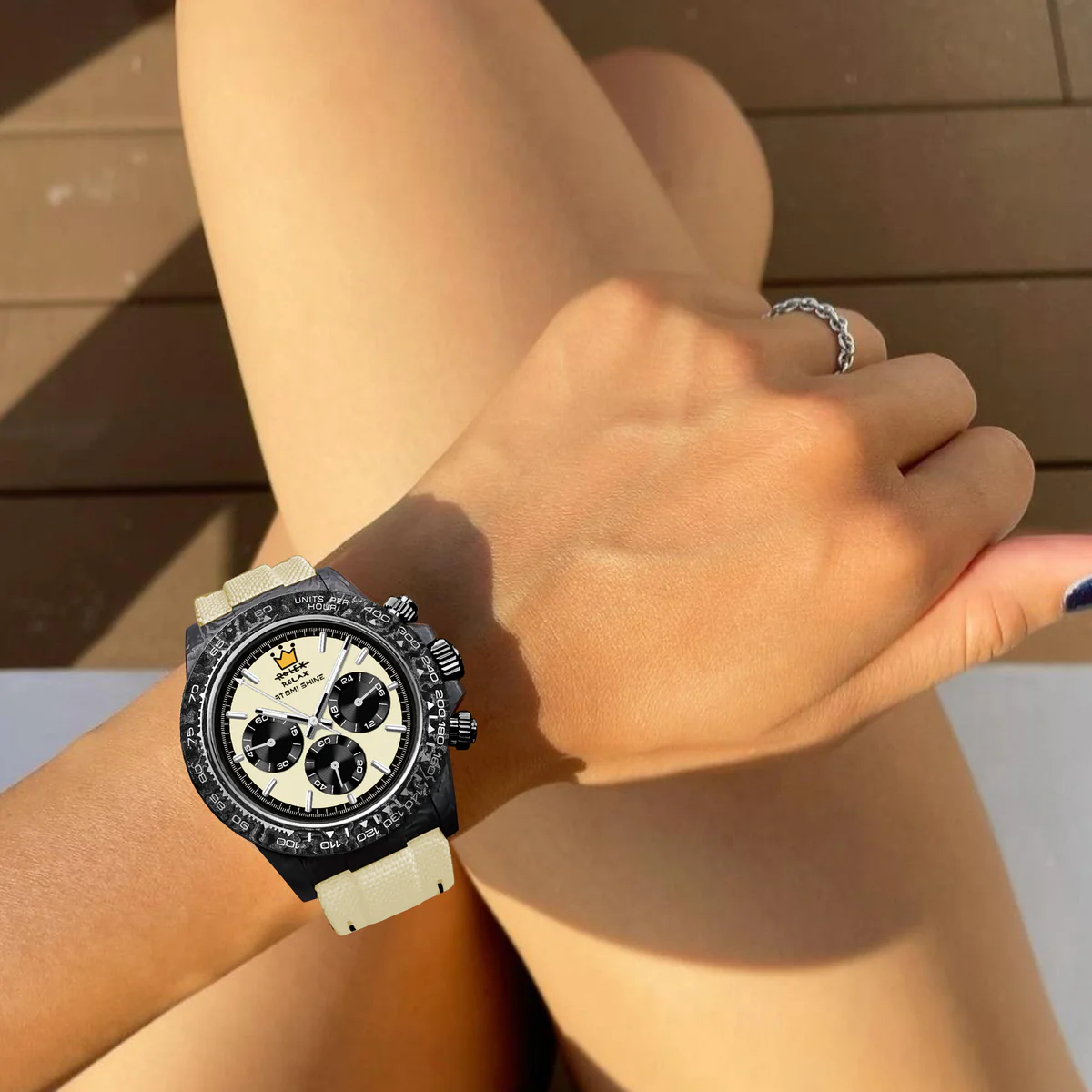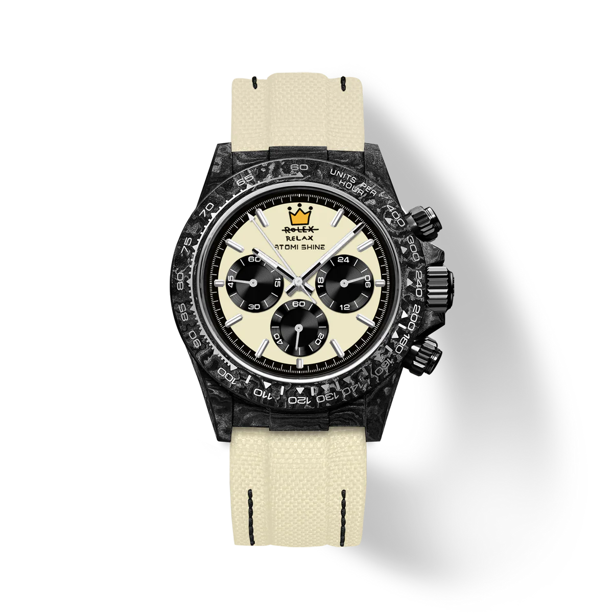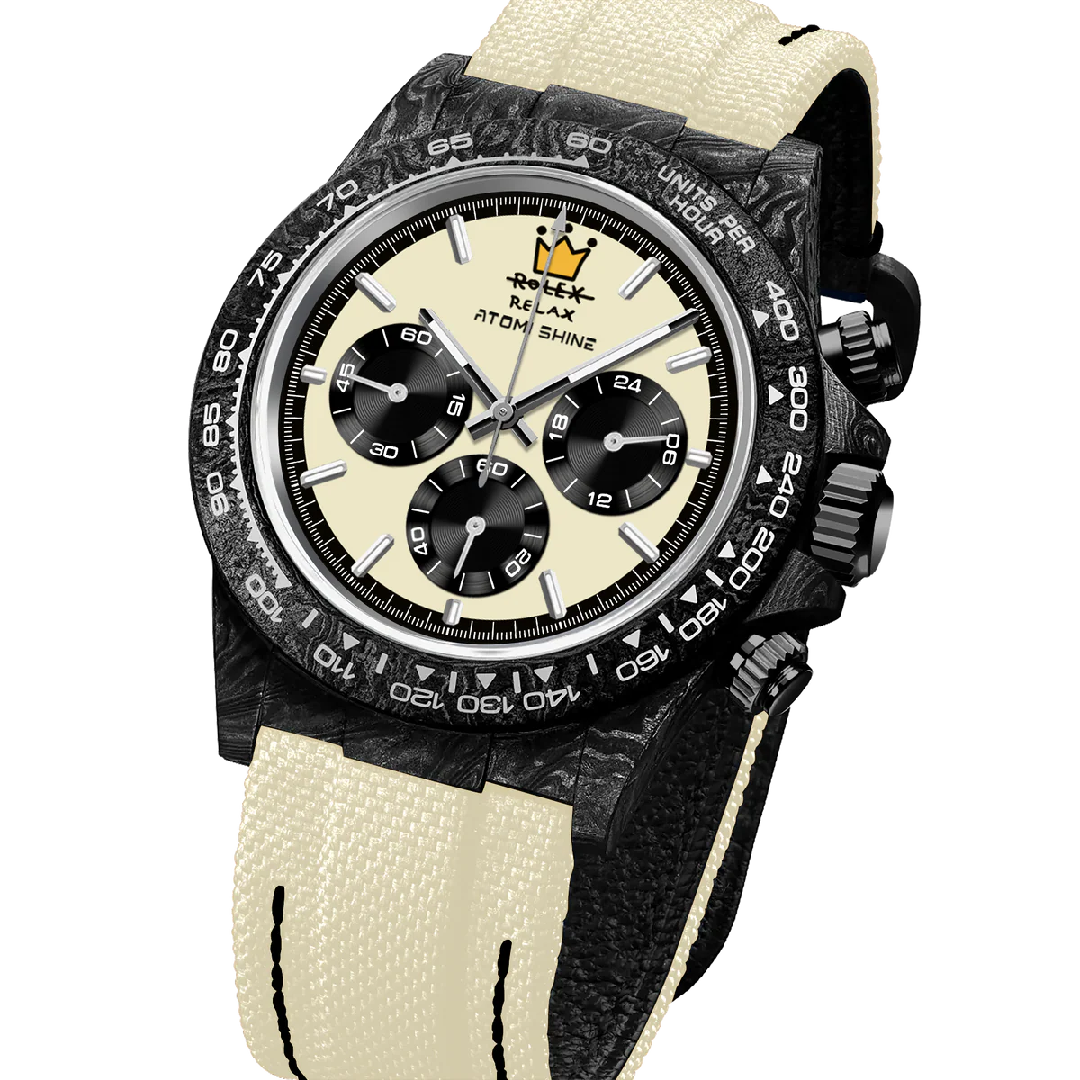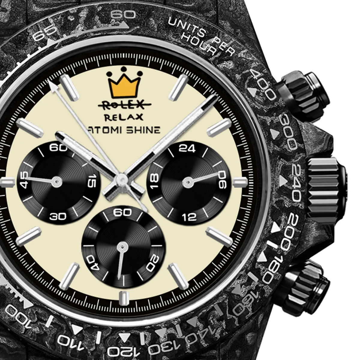 輕盈的黑色碳纖維錶殼搭配米色尼龍錶帶,營造出精緻而又不失冒險精神的美感。米色錶盤上點綴著三個黑色計時小錶盤,兼具精準計時和運動氣息。手繪仿錶冠飾有劃線字樣和「Relax」(放鬆)圖案,彰顯其叛逆而不失俏皮的個性,堪稱點睛之筆。這款腕錶專為追求個性的人士打造,兼具耐用性、卓越性能和無所畏懼的時尚品味。