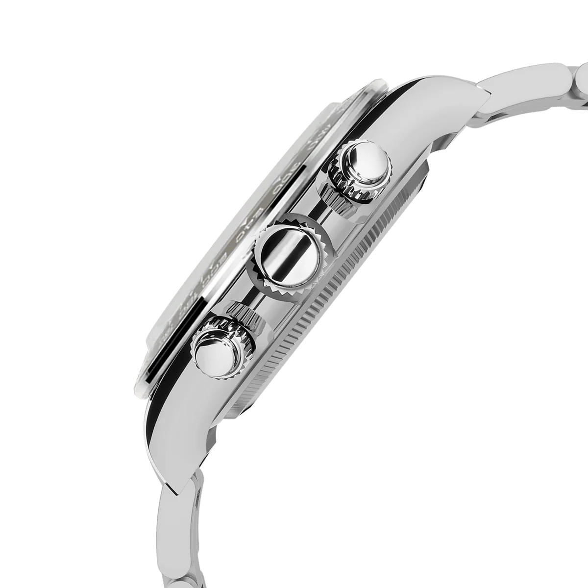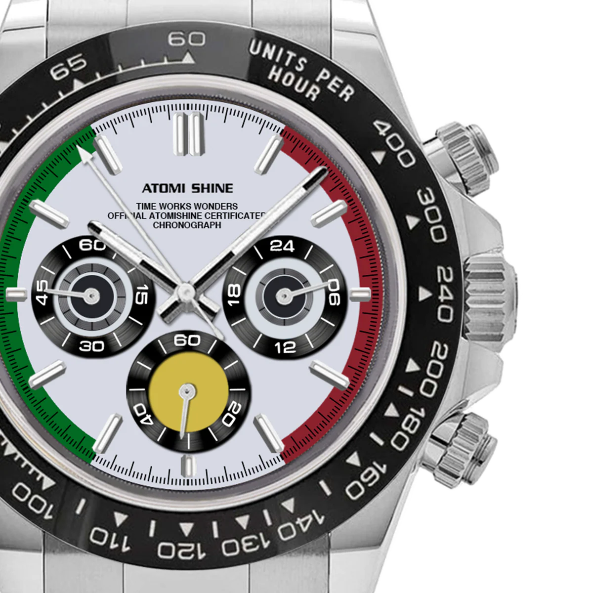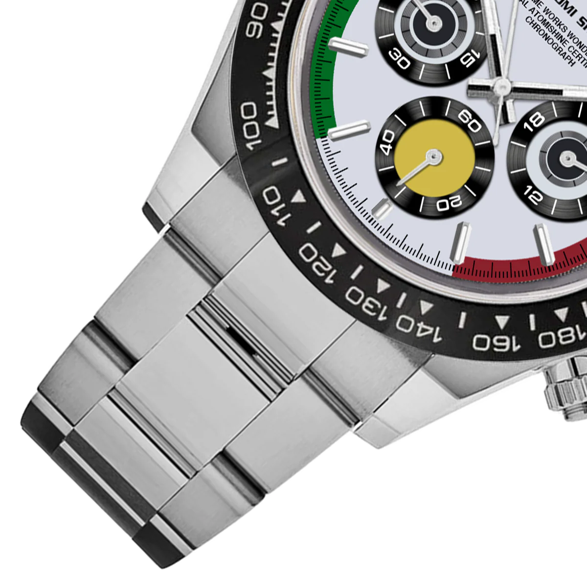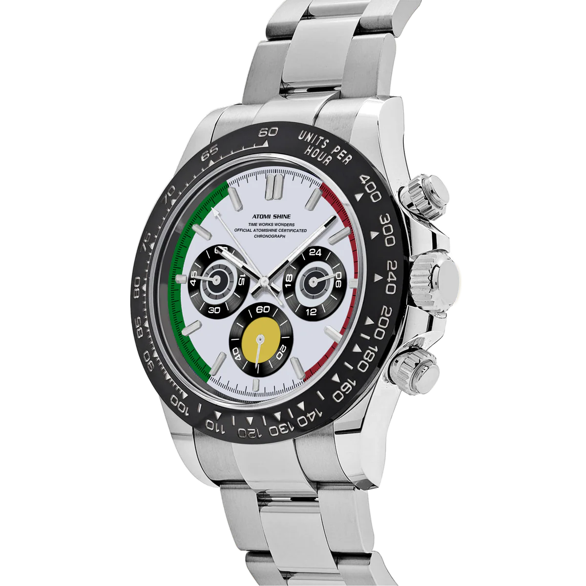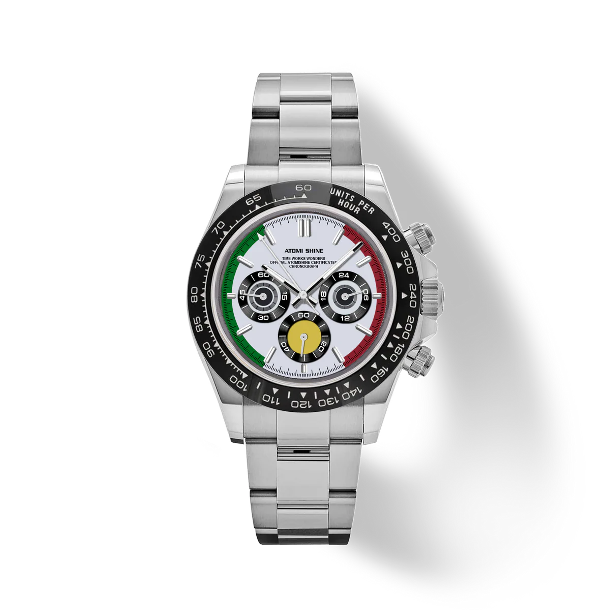這款39毫米不鏽鋼計時碼錶是對高性能設計的致敬,銀色錶殼和錶鍊與光滑的黑色旋轉錶圈形成鮮明對比。錶盤的設計靈感源自法拉利標誌性的儀表板佈局,左側綠色,右側紅色,動感十足,捕捉加速的快感。三個子錶盤模仿儀錶板:頂部兩個黑色,底部一個黃色,營造出醒目而實用的顯示效果。夜光琺瑯時標提升了在弱光環境下的可讀性。這款腕錶搭載可靠的Miyota OS20石英計時機芯,將運動美學與精準計時完美融合,是追求速度與時尚的人士的理想選擇。