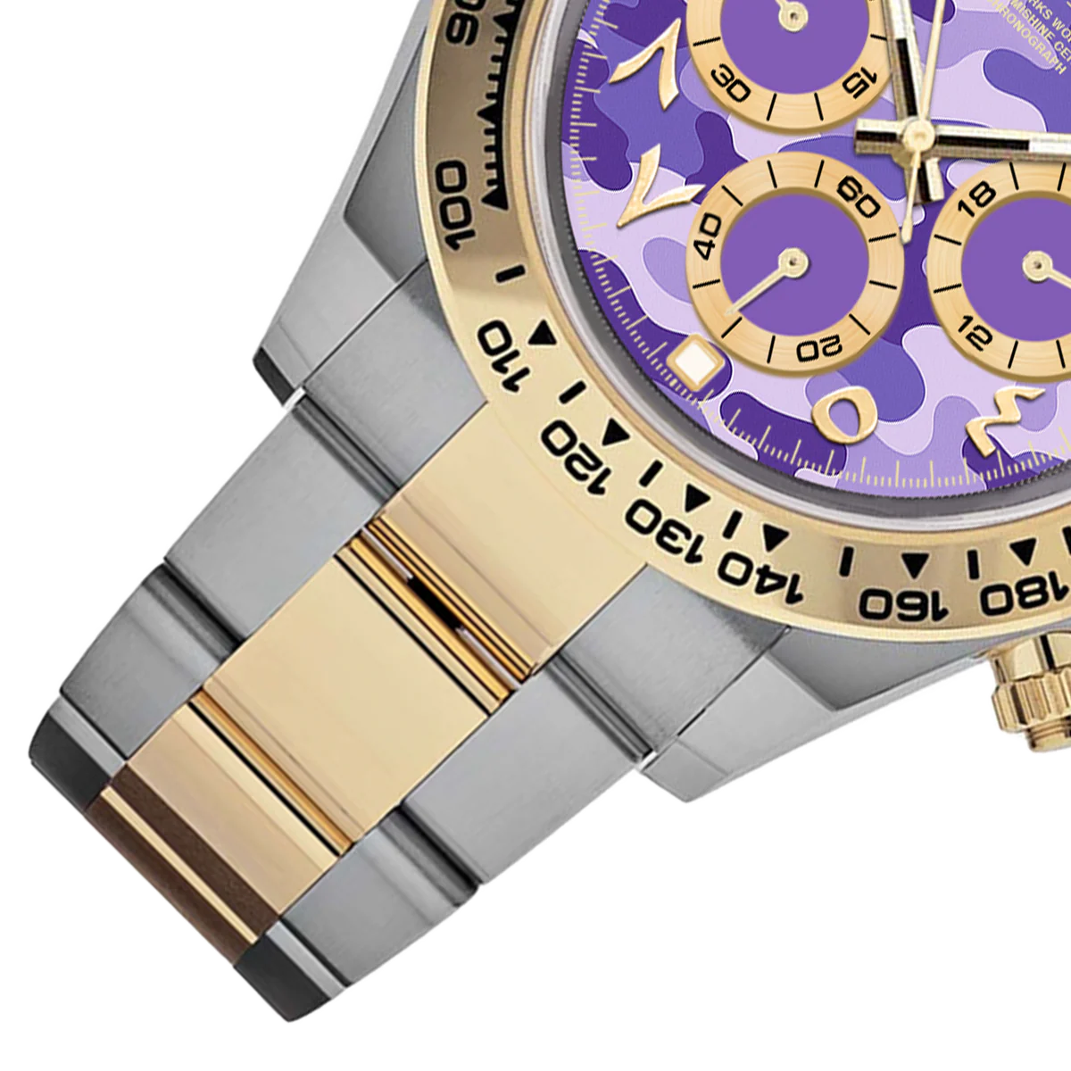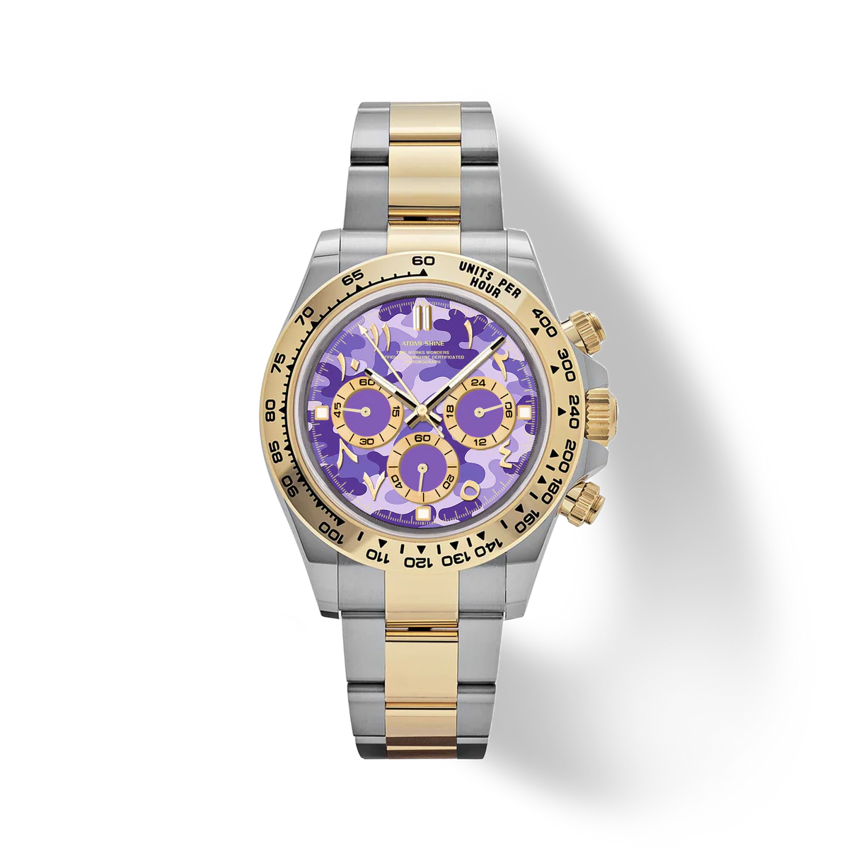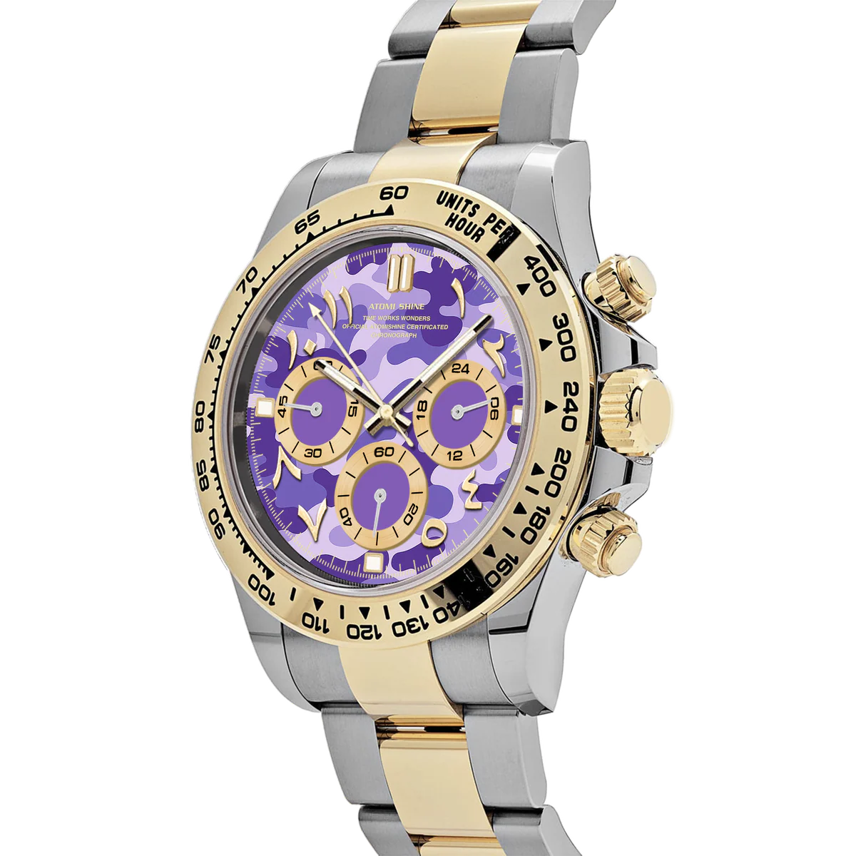 這款腕錶採用39毫米錶盤,搭配銀金雙色不鏽鋼錶殼和錶鍊,與光滑的金色錶圈形成鮮明對比,營造出現代奢華的風格。搭載高性能Miyota OS20計時機芯,兼具精準度與耐用性。錶盤採用大膽的迷彩圖案,並以濃鬱的紫色調點綴,中央飾有金色小錶盤,將奢華與粗獷風格完美融合。阿拉伯數字分別位於1、2、4、5、7、8、10和11,佈局清晰明了,動感十足。