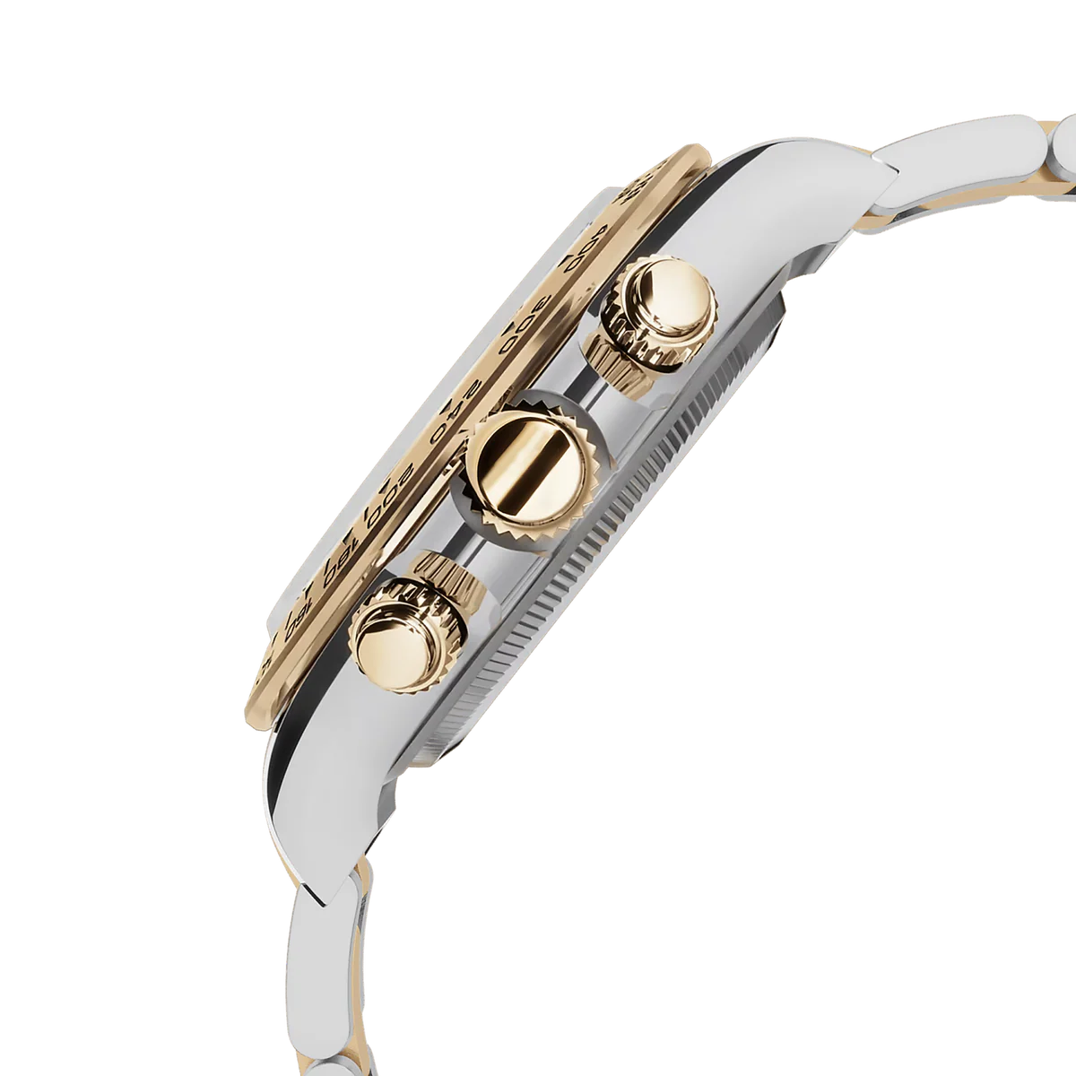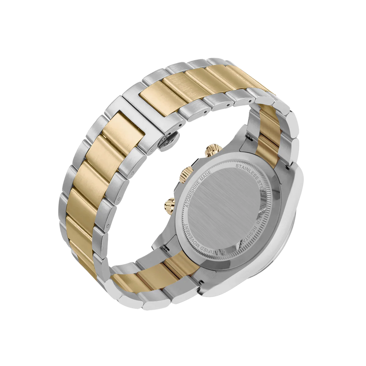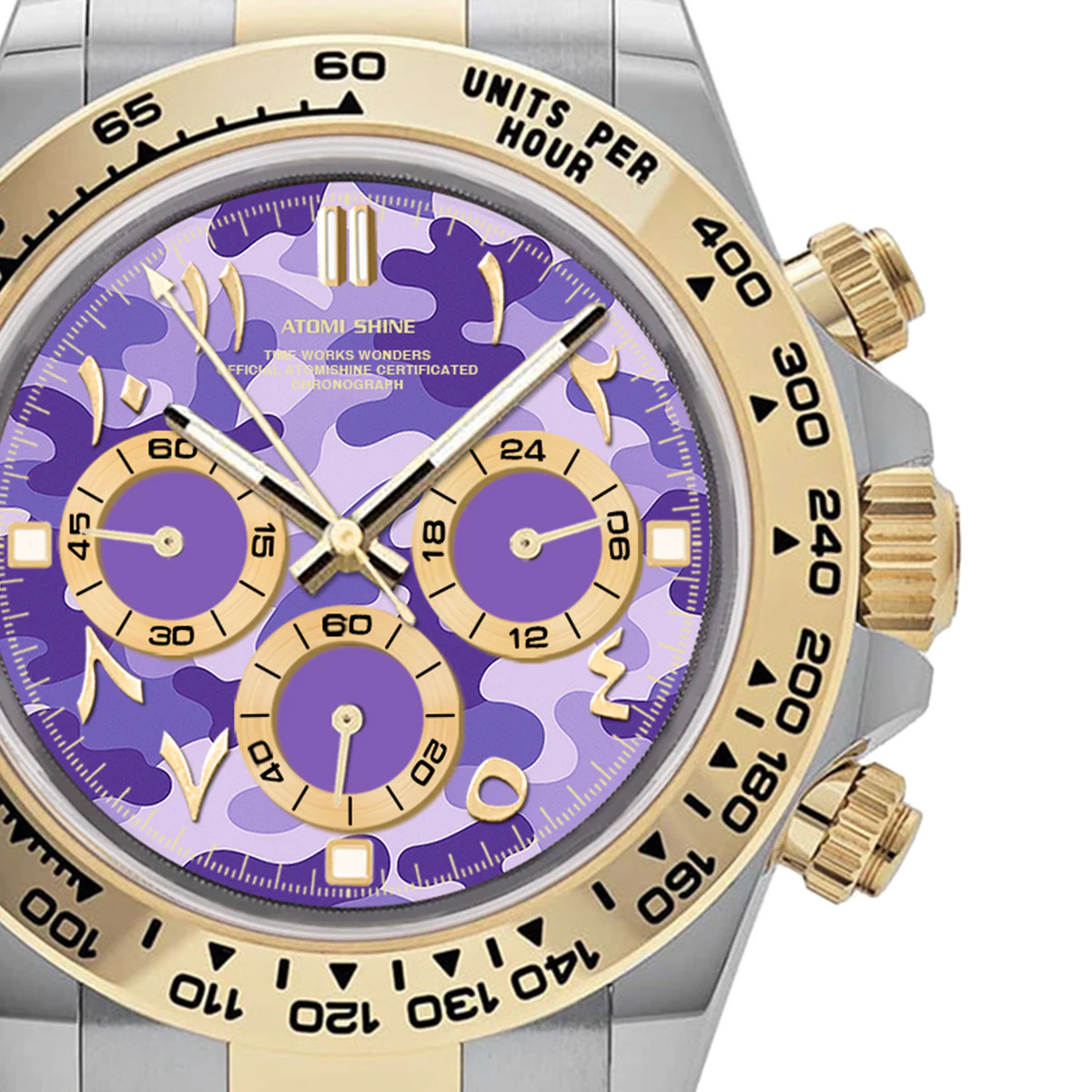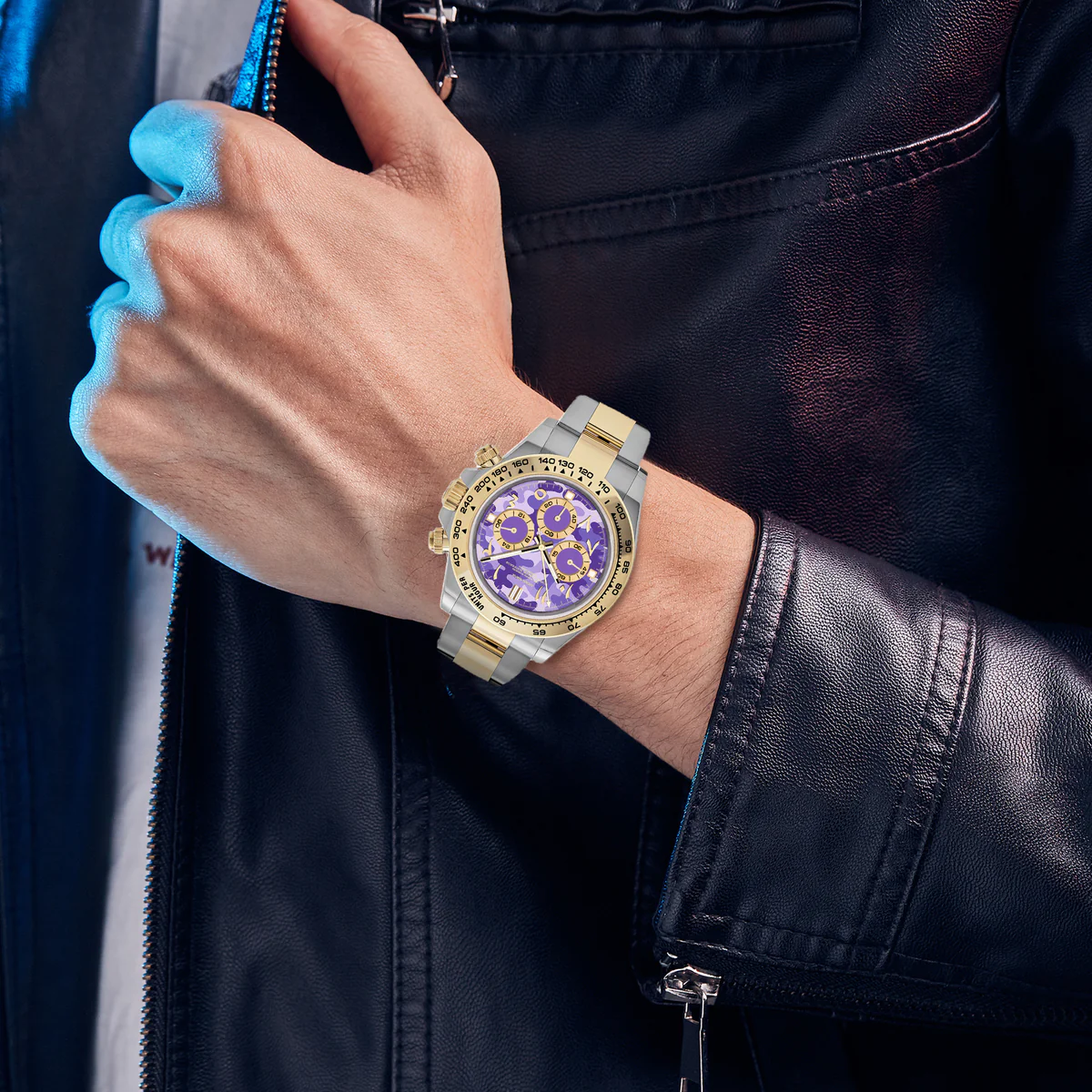 這款腕錶採用39毫米錶盤,搭配銀金雙色不鏽鋼錶殼和錶鍊,與光滑的金色錶圈形成鮮明對比,營造出現代奢華的風格。搭載高性能Miyota OS20計時機芯,兼具精準度與耐用性。錶盤採用大膽的迷彩圖案,並以濃鬱的紫色調點綴,中央飾有金色小錶盤,將奢華與粗獷風格完美融合。阿拉伯數字分別位於1、2、4、5、7、8、10和11,佈局清晰明了,動感十足。