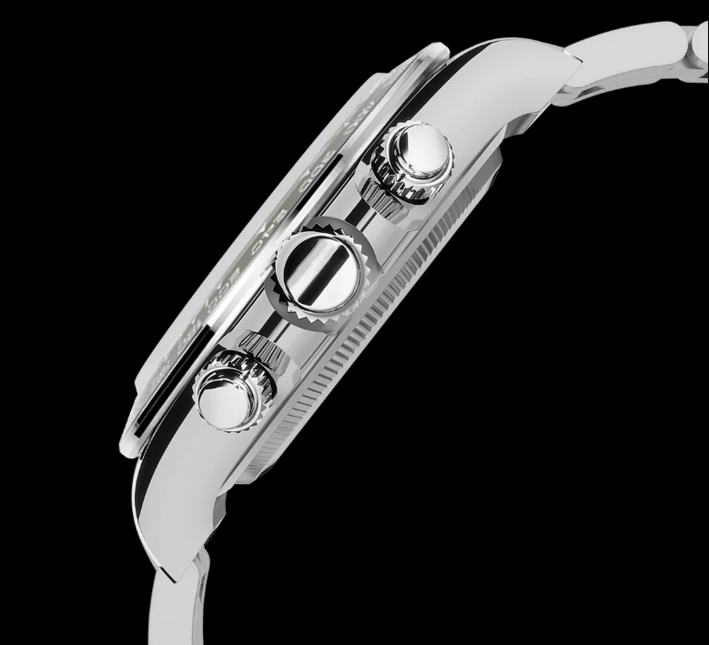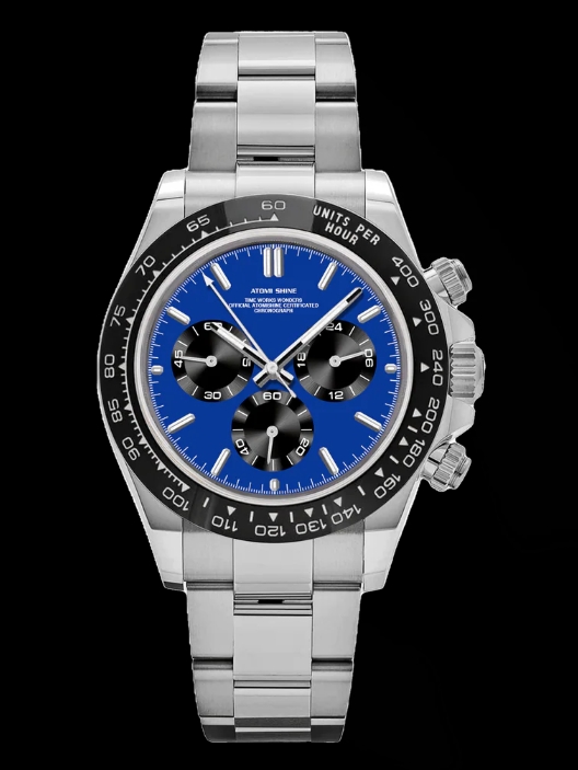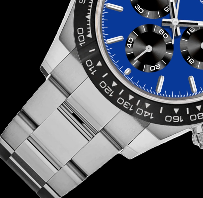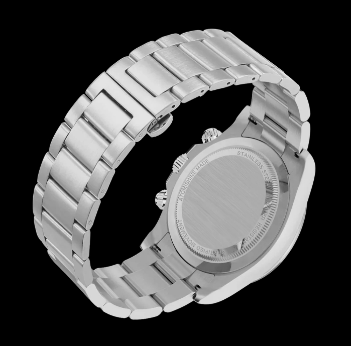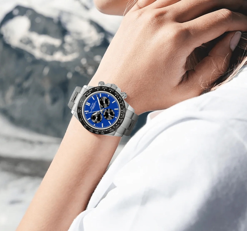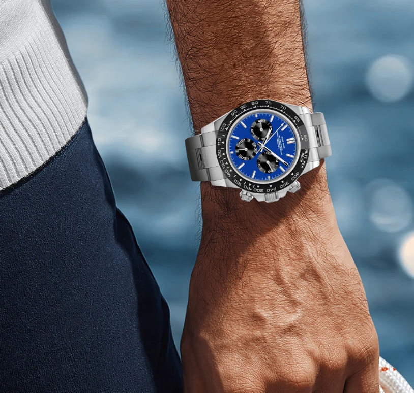 這款腕錶搭配時尚的銀色錶帶,外觀時尚精緻,可輕鬆搭配休閒裝和正裝。大膽的黑色錶圈與深藍色錶盤形成鮮明對比,打造出兼具優雅與實用的醒目設計。錶盤本身配備三個深色多功能計時模組,可同時追蹤多個時區或事件。這些模組提供先進的功能,使其成為環球旅行者、商務人士或任何注重效率和條理性人士的理想之選。