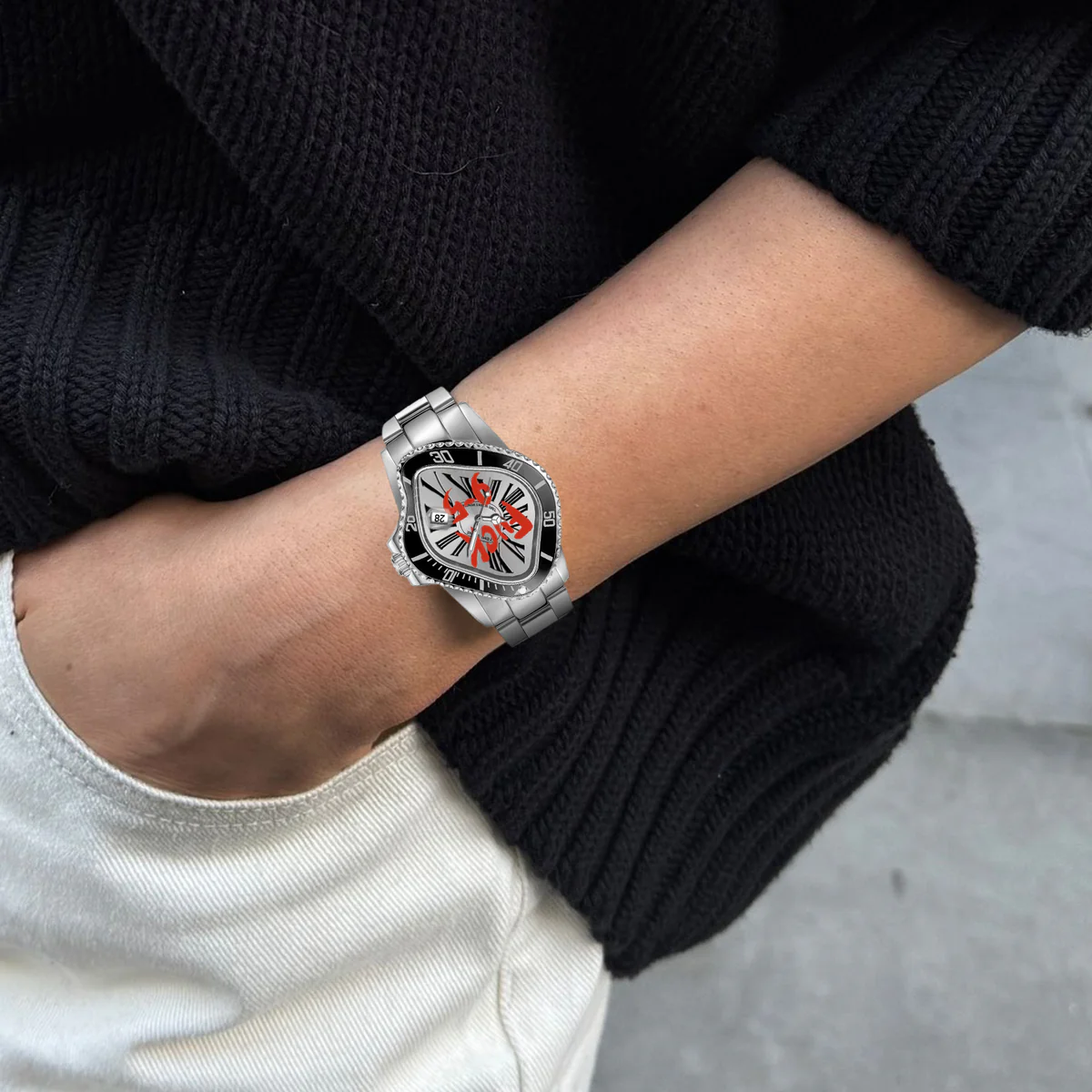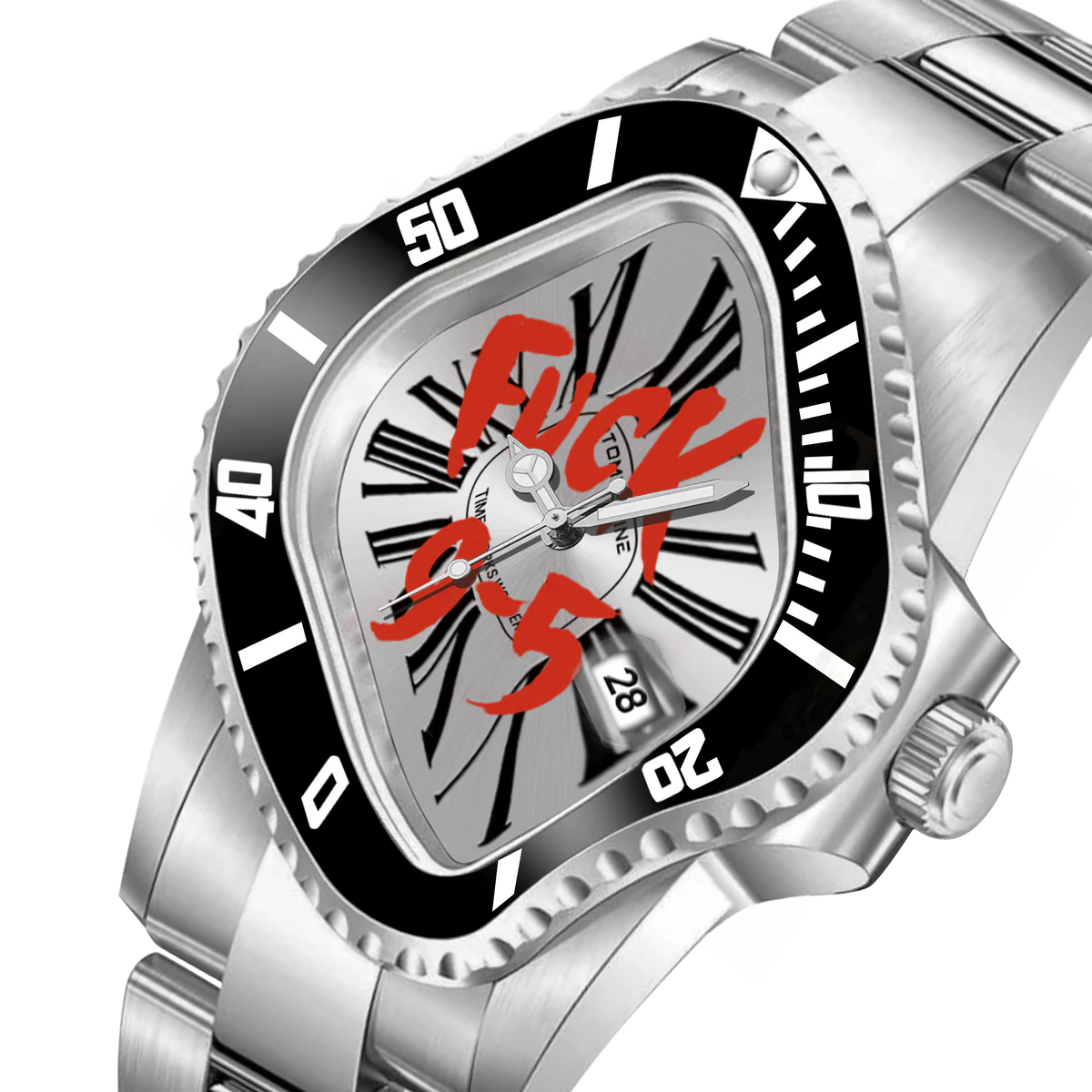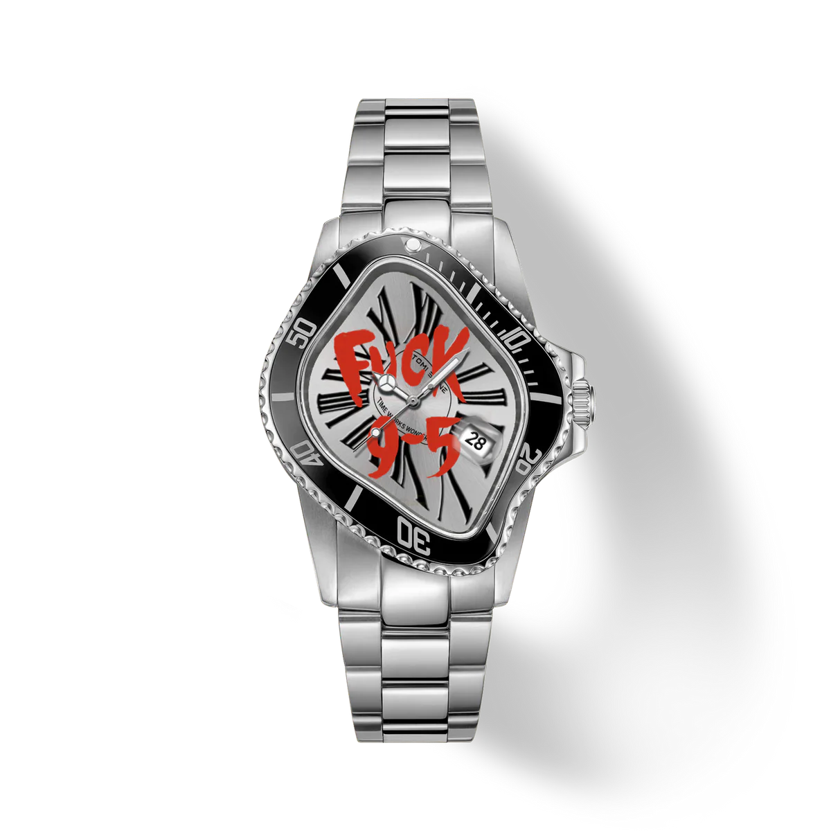 設計的核心是一句大膽的宣言:「FUCK 9-5」** 以醒目的紅色塗鴉潦草地寫在錶盤上。這不僅是一句銘文,更是對單調乏味的抗議,對繁瑣工作的拒絕,以及對個人自由的頌揚。