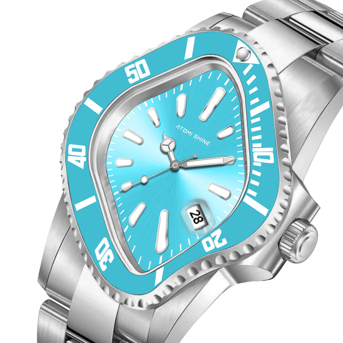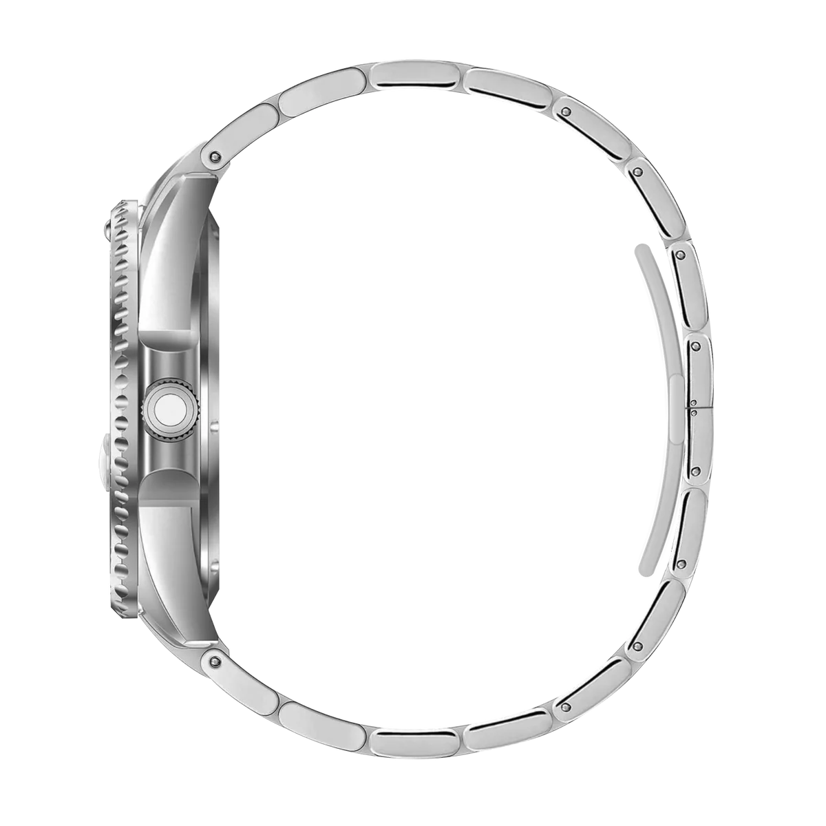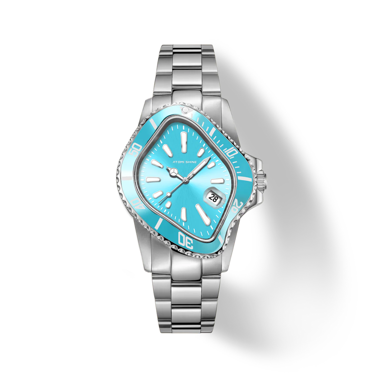 這款40 x 45毫米的腕錶將前衛設計與海洋般的優雅氣質融為一體。錶殼採用精鋼材質打造,搭配與之相匹配的錶鍊,搭配海藍色錶圈,為充滿動感與深度的錶盤奠定了基調。錶盤飾有與錶殼和諧統一的璀璨海洋放射紋飾,隨著光線在其雕塑般的造型上移動,閃爍著動感的光芒。夜光琺瑯時標長度各異,與錶盤的扭曲曲線相映成趣,兼具實用功能與藝術韻律。