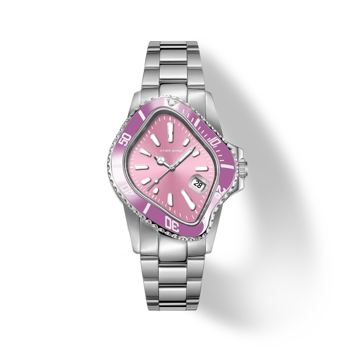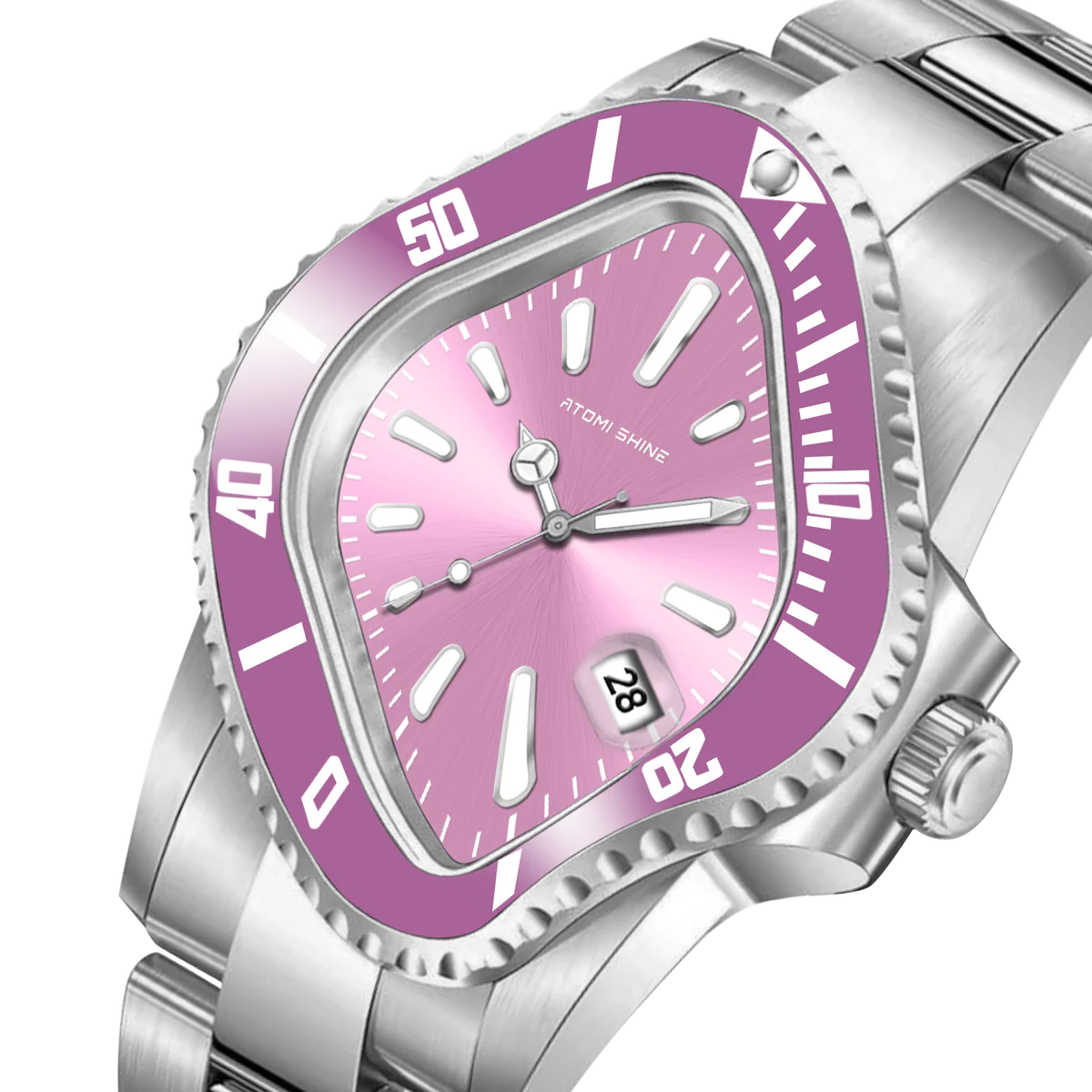 這款40×45毫米精鋼腕錶大膽融合優雅與叛逆,採用扭曲的不對稱錶殼,搭配柔和的腮紅粉色錶圈和與之相配的旭日紋錶盤。扭曲的造型在字面和視覺上都扭曲了時間,夜光琺瑯時標則隨著錶盤的弧度拉伸和變形。