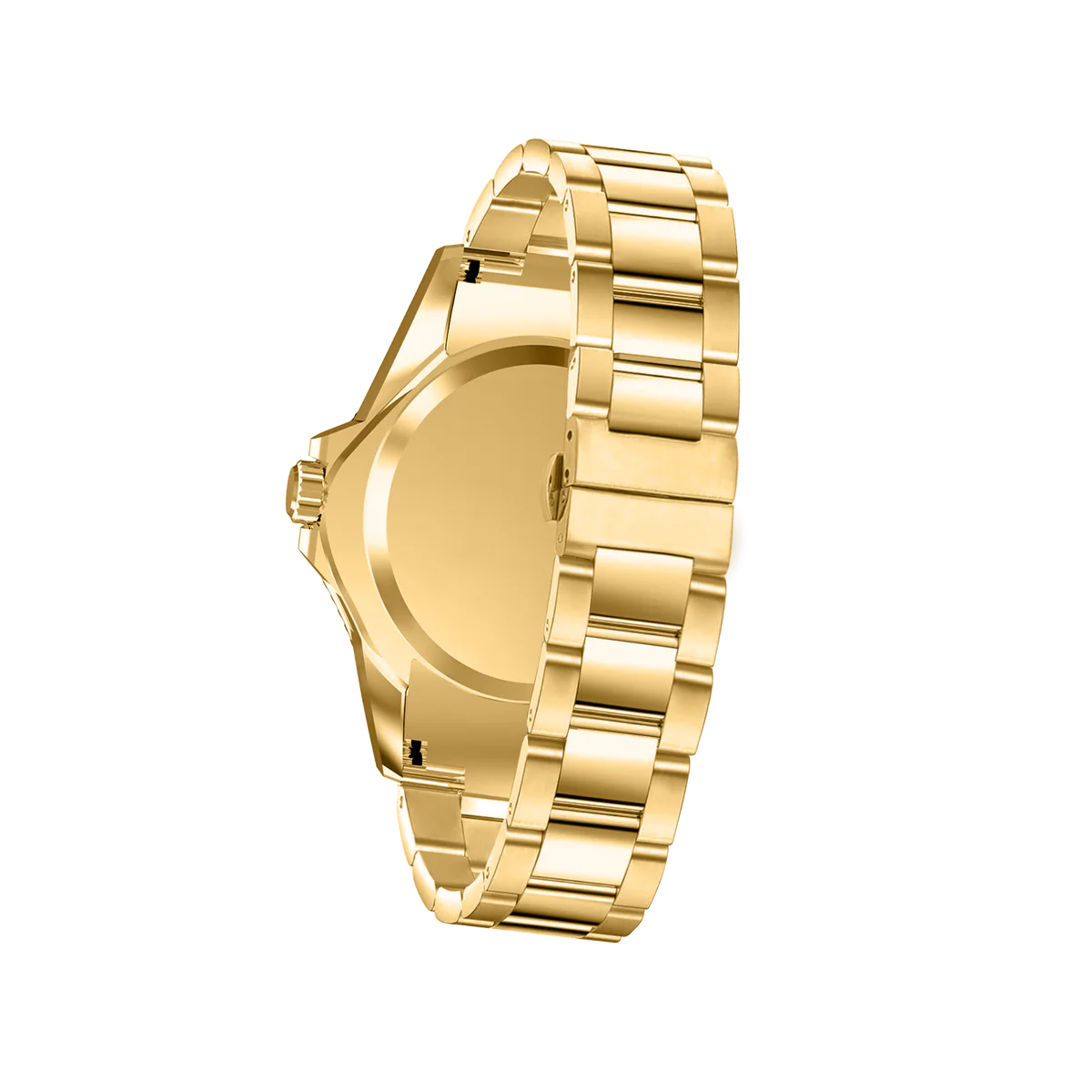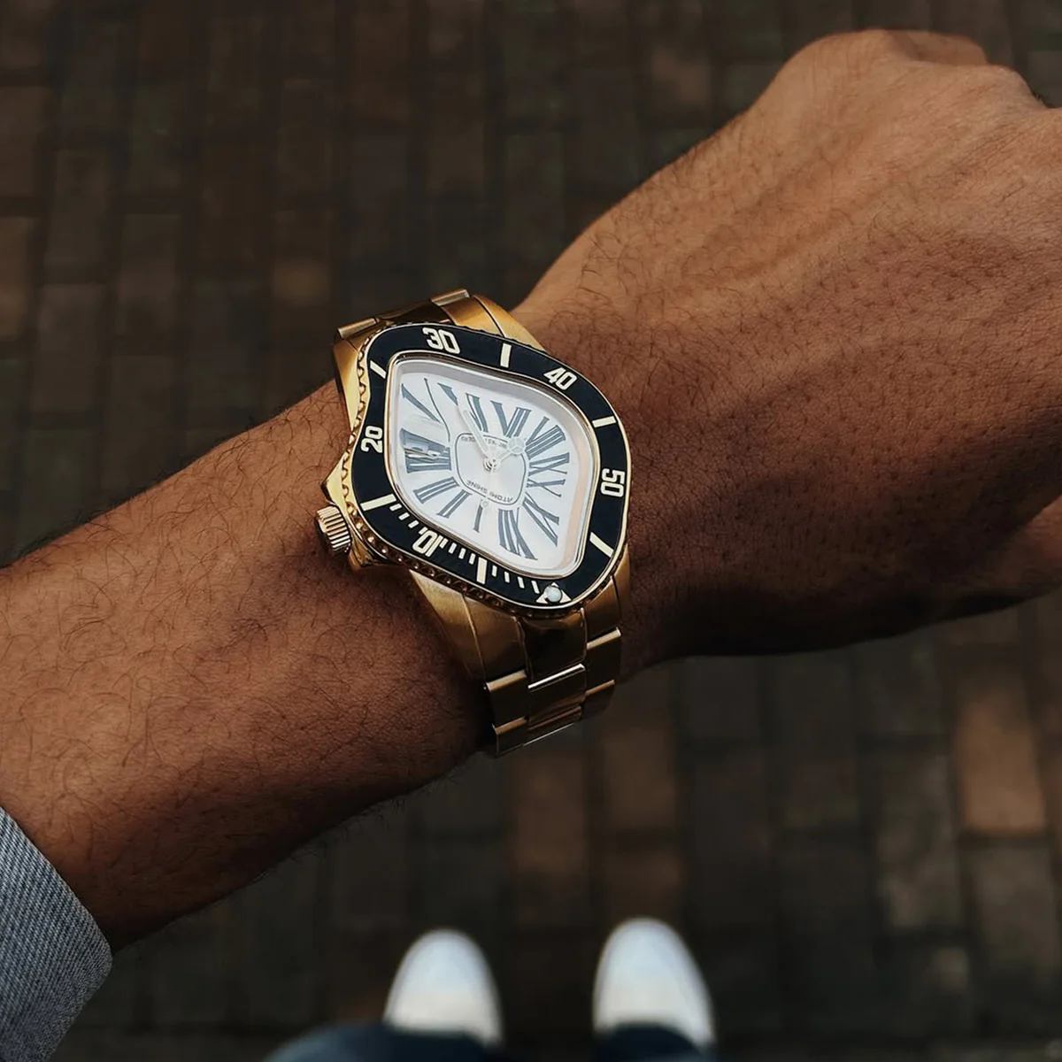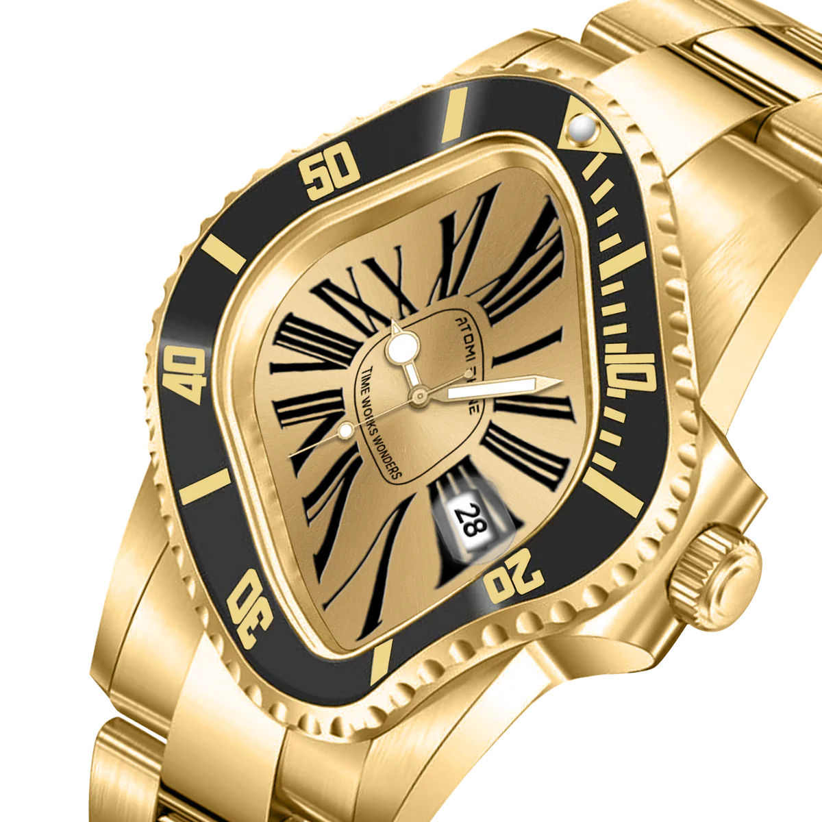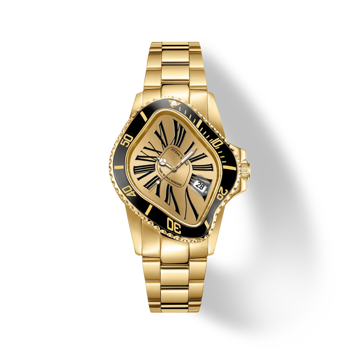 這款40×45毫米不鏽鋼腕錶將奢華與超現實設計完美融合,令人驚艷。扭曲的錶盤搭配金色錶殼和錶鍊,以大膽的曲線和扭曲的視覺結構打破常規。光滑的黑色錶圈環繞著金色錶盤,羅馬數字時標隨錶盤的扭曲形狀蜿蜒流動,營造出時間流動的幻覺。腕錶搭載可靠的Miyota 8215自動機械機芯,提供流暢的自動上鍊性能。